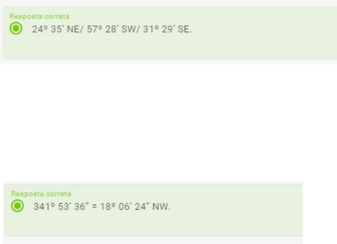 ATIVIDADE II – TOPOGRAFIA A bússola é um instrumento de medição muito antigo. Ela serve para determinar os ângulos formados dependendo da direção para qual ela é direcionada. Possui uma ponta imantada que sempre segue a direção do norte magnético. Algumas bússolas apresentam seus ângulos em forma de Rumos, outras em Azimute, desta forma, em alguns casos é necessária fazer a conversão. Nesse contexto, indique a alternativa correta que apresenta apenas Rumos: Em muitas situações é necessário realizar a conversão entre rumos e azimutes, pois as informações disponíveis estão em apenas um destes tipos de ângulos. Por exemplo, se em uma bússola que disponibilize a orientação em forma de rumo e o memorial descritivo da propriedade que se deseja realizar o levantamento topográfico esteja com os dados em azimute, deve-se realizar a conversão. Nesse contexto, indique a alternativa correta de conversão entre Azimute e Rumo. image1.png image2.png