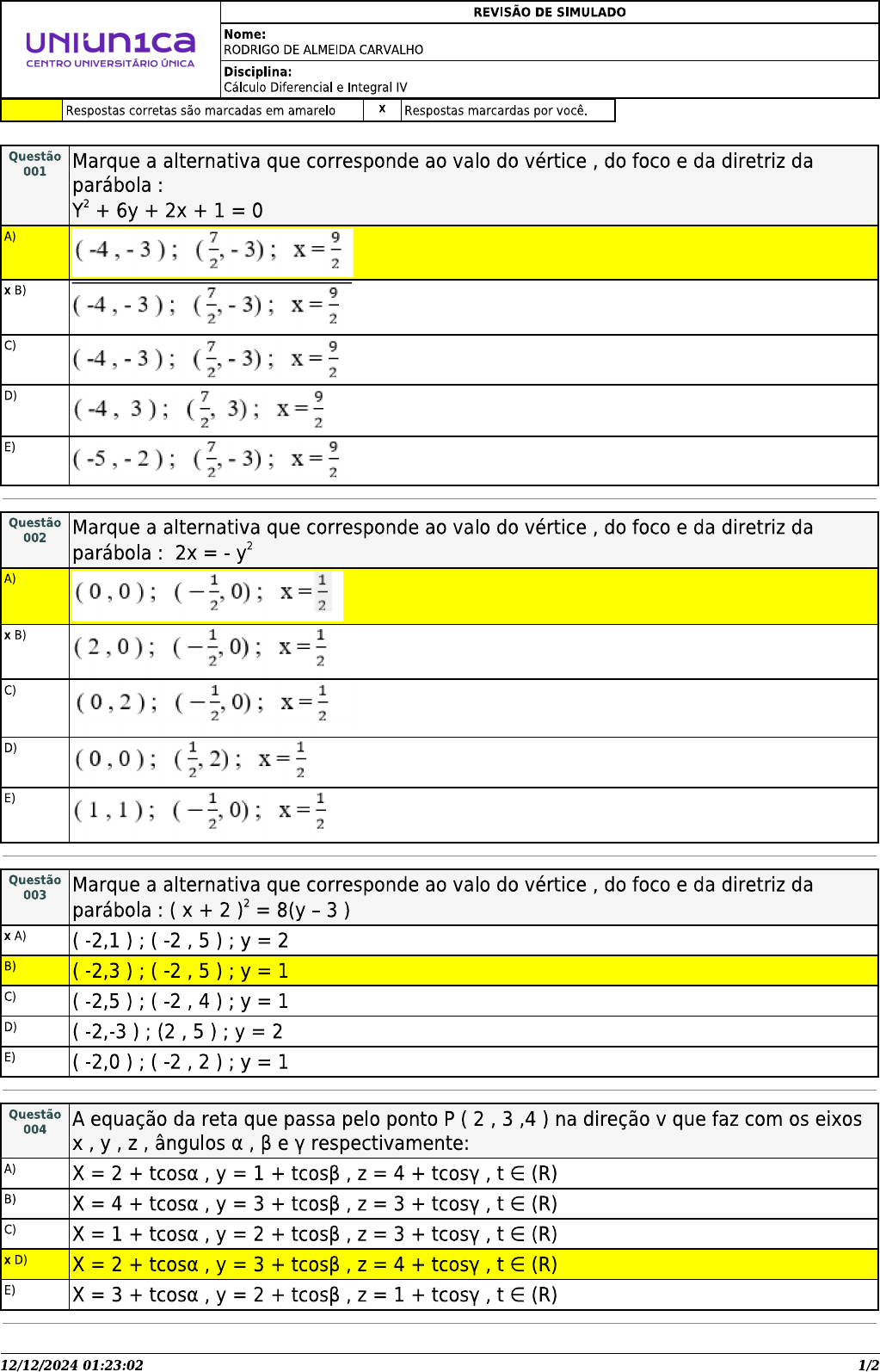 REVISÃO DE SIMULADO Nome: RODRIGO DE ALMEIDA CARVALHO CENTRO UNIVERSITÁRIO ÚNICA Disciplina: Cálculo Diferencial e Integral IV Respostas corretas são marcadas em amarelo Respostas marcardas por você. Questão Marque a alternativa que corresponde ao valo do vértice , do foco e da diretriz da 001 parábola : = A) x B) ; 2 C) (-4,-3); 2 D) 2 E) (-5,-2) ; 2 Questão Marque a alternativa que corresponde ao valo do vértice , do foco e da diretriz da 002 parábola : A) 2 x B) (2,0); 2 C) 2 1 D) (0,0); E) 2 1 Questão Marque a alternativa que corresponde ao valo do vértice , do foco e da diretriz da 003 parábola : x A) 2 B) C) D) E) 1 Questão A equação da reta que passa pelo ponto P (2,3,4) na direção V que faz com os eixos 004 , Z, ângulos respectivamente: A) X = 2 + tcosa , , Z = 4 + B) X = 4 + tcosa , C) X = 1 + tcosa , x D) X = 2 + tcosa E) + tcosa , 12/12/2024 01:23:02 1/2Questão A equação paramétrica da reta que passa pelos pontos 005 é: A) + (R) B) C) x D) E) Questão 006 Analisando a seguinte equação determine a superfície representada por ela. 4 9 25 A) Paraboloide Circular. B) Hiperboloide. C) Cone circular. x D) Paraboloide elíptico. E) Cone elíptico. Questão Dado o cubo cuja face da base é o quadrado de vértices 007 3, encontra as equações paramétricas da reta que contém sua diagonal que passa pela A) = B) C) D) Questão 008 Determine as equações paramétricas da reta L que passa pelo ponto (-2,-3,-2) e é paralela ao vetor 2i+j-k. A) {x=1+2t {y=3+2t B) {x=-2-t {y=3+t {z=2-t C) {x=2+2t {z=-t x D) {x=-2+2t E) {z=t 12/12/2024 01:23:02 2/2