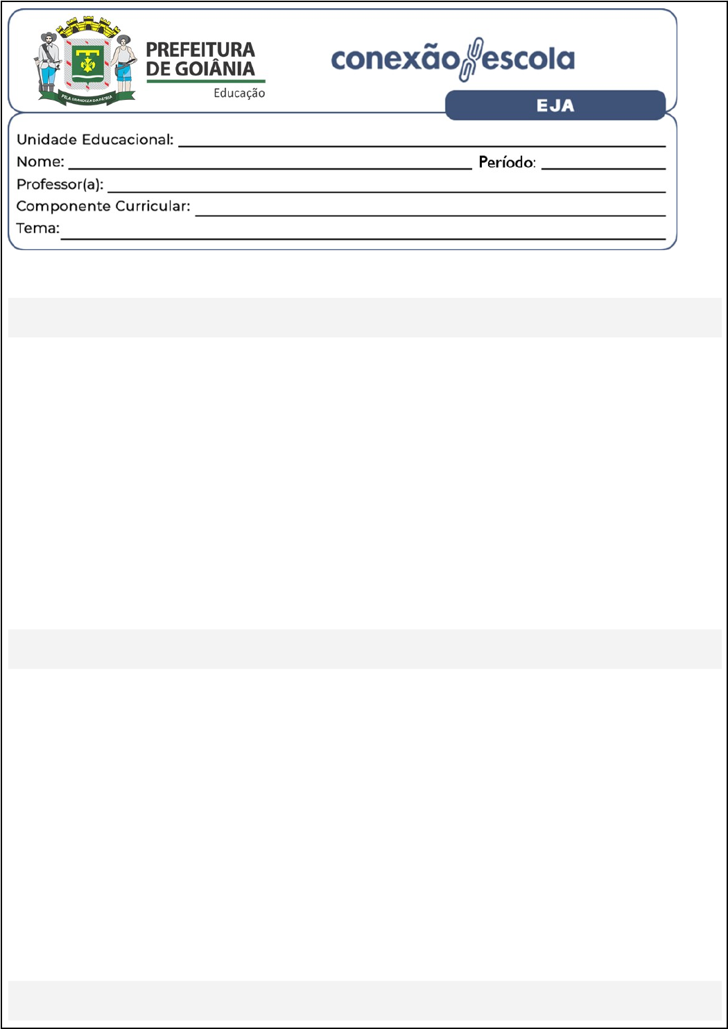 4º Período Práticas Corporais de Aventura Educação Física QUESTÃO 1 As Práticas Corporais de Aventura são (A) práticas corporais competitivas e com regras oficiais elaboradas por uma federação esportiva. (B) práticas corporais que buscam superar os desafios do meio ambiente desafiador provocando a sensação de vertigem com o máximo controle dos riscos. (C) uma forma de linguagem que expressa ideias, sentimentos e até histórias através dos movimentos organizados em passos ou coreografias e dentro de um ritmo. (D) práticas corporais lúdicas e com regras flexíveis para garantir a inclusão e diversão de todos. QUESTÃO 2 As práticas corporais de aventura são classificadas como (A) práticas corporais de aventura seguras e práticas corporais de aventura arriscadas. (B) práticas corporais de aventura na terra e práticas corporais de aventura na água. (C) práticas corporais de aventura masculinas e práticas cortporais de aventura femininas. (D) práticas corporais de aventura urbanas e práticas corporais de aventura na natureza. QUESTÃO 3 As práticas de aventura estão sempre se relacionando com as questões ambientais, pois sem a preservação do meio ambiente não é possível a continuidade dessas práticas. Como podemos preservar o meio ambiente urbano? ____________________________________________________________________________________________________________________________________________________________________________________________________________________________________________________________________________ QUESTÃO 4 As práticas corporais de aventura surgiram da necessidade de explorar e conquistar novos territórios. Mas, atualmente, quais são os principais objetivos dos praticantes de aventura? ____________________________________________________________________________________________________________________________________________________________________________________________________________________________________________________________________________ Autoria Luciano Alves de Oliveira Formação Educação Física Componente Curricular Educação Física Objetivos de Aprendizagem e Desenvolvimento (EJAEF0433) Conhecer e identificar o que são práticas corporais de aventura (EJAEF0435) Relacionar as práticas corporais de aventura com as questões ambientais, de saúde e lazer Referência BRASIL. Ministério da Educação. Base Nacional Comum Curricular. Brasília, 2018. Coletivo de autores. Metodologia do Ensino da Educação Física. São Paulo: Cortez. 1992 Goiânia. Documento Curricular Eja - 2023. Educação Física. Secretaria Municipal de Educação e Esporte. 2023 Goiânia. Documento Curricular Para a Rede Municipal de Educação de Goiânia - EJA. Secretaria Municipal de Educação e Esporte. 2023 Goiânia. Organização Pedagógica da EJA - 2023. Secretaria Municipal de Educação e Esporte. 2022 image5.png image3.png image6.png image4.png image1.png image2.png