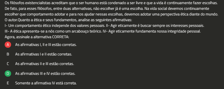 Os filósofos existencialistas acreditam que ser humano está condenado a ser livre e que a vida é continuamente fazer escolhas. De fato, para esses filósofos, entre duas alternativas, não escolher já é uma escolha. Na vida social devemos continuamente escolher que comportamento adotar e para nos ajudar nessas escolhas, devemos adotar uma perspectiva ética diante do mundo. autor.Quanto a ética e seus fundamentos, analise as seguintes afirmativas: I- Um comportamento ético independe dos valores pessoais. II- Agir eticamente é buscar sempre os interesses pessoais. III- A ética apresenta-se a nós como um arcabouço teórico. IV- Agir eticamente fundamenta nossa integridade pessoal. Agora, assinale a alternativa CORRETA: A As afirmativas I, II e III estão corretas. B As afirmativas e II estão corretas. As afirmativas II e III estão corretas. D As afirmativas III e IV estão corretas. E Somente a afirmativa IV está correta.