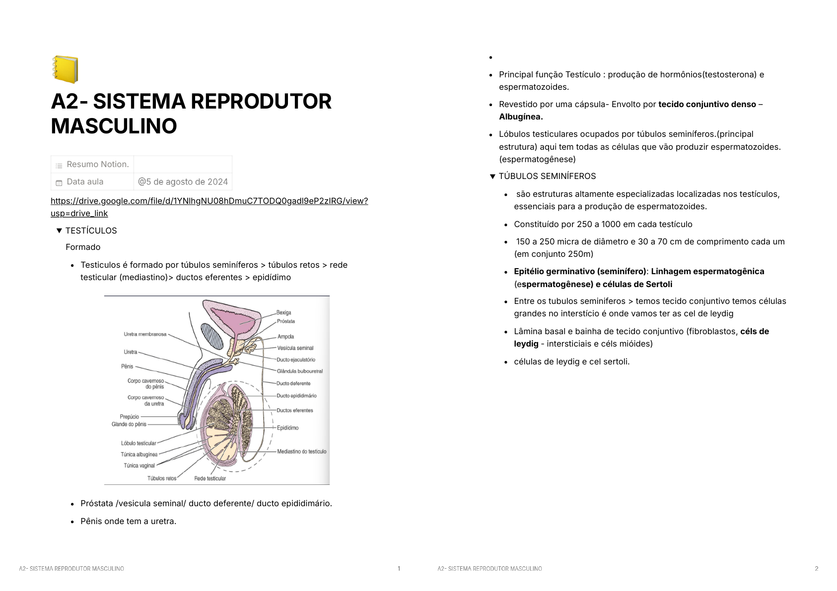 A2- SISTEMA REPRODUTOR MASCULINO Resumo Notion. Data aula https://drive.google.com/file/d/1YNlhgNU08hDmuC7TODQ0gadl9eP2zIRG/view? usp=drive_link TESTÍCULOS Formado Testiculos é formado por túbulos seminíferos > túbulos retos > rede testicular (mediastino)> ductos eferentes > epidídimo Próstata /vesicula seminal/ ducto deferente/ ducto epididimário. Pênis onde tem a uretra. Principal função Testículo : produção de hormônios(testosterona) e espermatozoides. Revestido por uma cápsula- Envolto por tecido conjuntivo denso – Albugínea. Lóbulos testiculares ocupados por túbulos seminíferos.(principal estrutura) aqui tem todas as células que vão produzir espermatozoides. (espermatogênese) TÚBULOS SEMINÍFEROS são estruturas altamente especializadas localizadas nos testículos, essenciais para a produção de espermatozoides. Constituído por 250 a 1000 em cada testículo 150 a 250 micra de diâmetro e 30 a 70 cm de comprimento cada um (em conjunto 250m) Epitélio germinativo (seminífero): Linhagem espermatogênica (espermatogênese) e células de Sertoli Entre os tubulos seminiferos > temos tecido conjuntivo temos células grandes no interstício é onde vamos ter as cel de leydig Lâmina basal e bainha de tecido conjuntivo (fibroblastos, céls de leydig - intersticiais e céls mióides) células de leydig e cel sertoli. Entre os túbulos temos interstício( tem celulas leydig) Dentro dos túbulos seminiferos, temos varias células., no meio dos túbulos temos espermatozoide. Espermatogênese É o processo de formação dos espermatozoides a partir de células germinativas precursoras chamadas espermatogônias. Homens nasce com a célula espermatogônias e na puberdade ocorre a mitose para gerar espermatozoides. Célula germinativa primitiva - Espermatogônia Na Puberdade Mitoses tipo A e B progenitoras B Espermatócitos Primários e Secundários Espermiogênese É o processo final da espermatogênese, onde as espermátides se transformam em espermatozoides maduros. ESPERMIOGÊNESE É a Transformação de ESPERMÁTIDES em ESPERMATOZOIDES. Estimulada pela testosterona e inibida por estrógeno e progesterona. Temperatura abaixo de 37 graus: testículo em torno de 35 graus, com controle pelo plexo venoso pampiniforme, suor pela bolsa escrotal e contração do músculo cremaster Células germinativas sensíveis: radiação, desnutrição, alcoolismo, algumas drogas, etc. Células do tubúlos Espermátides Espermatozoides Corpos residuais Células de sertoli Suporte, proteção e suprimento aos sptz Fagocitose de corpos residuais (restos de espermátides) Secreção de fluido para transporte de sptz e proteínas específicas (ligante de andrógeno) Produção de hormônio antimulleriano (desenvolvimento embrionário) Barreira hematotesticular CÉLULAS DE LEYDIG INTERSTICIAIS Cél. arredondada a poligonal, com núcleo central e citoplasma eosinófilo rico em pequenas gotículas de lipídios Produção de testosterona, hormônio masculino responsável pelo desenvolvimento das características sexuais masculinas secundárias(ex. pelos) DUCTOS GENITAIS DUCTOS INTRATESTICULARES fora do testículos) Túbulos retos (continuação dos t. seminíferos, sem células germinativas, mudando para epitélio cubóide na porção principal) Rede testicular (rede anastomosada de canais revestidos por epitélio cubóide) Ductos eferentes (grupos de células epiteliais cubóides não-ciliadas, alternando com ciliadas)- expulsão em direção ao pênis. REDE TESTICULAR DUCTOS GENITAIS EXTRATESTICULARES Transportam os sptz dos testículos até o meato peniano. é ‘DOIS ÓRGÃOSʼ DUCTO EPIDIDIMÁRIO EPIDIDMO Tubo único, enrolado, 4 a 6 cm, epitélio colunar pseudo- estratificado, com estereocílios(TRANSPORTE (absorção de corpos residuais), apoiado em lâmina basal cercada por músculo liso (contração e movimento do fluido) e tecido conjuntivo frouxo. Forma o epidídimo. DUCTO DEFERENTECORTE DA VASECTOMIA Bastante músculo. Lúmen estreito e espessa camada de músculo liso (contração para expulsão dos sptz na uretra) Mesmo epitélio do ducto epididimário, mas pregueado, com lâmina própria (conjuntivo frouxo) Formam o cordão espermático, junto com a artéria testicular, o plexo venoso pampiniforme e nervos. Antes de entrar na próstata forma a ampola (epitélio mais espesso e pregueado), onde desembocam as vesículas seminais O segmento que entra na próstata é chamado ducto ejaculatório e desemboca na uretra prostática Ducto deferente esta presente dentro do CORDÃO ESPERMÁTICO. GLÂNDULAS ACESSÓRIAS (masc. próstata) VESÍCULAS SEMINAIS:(orelhinhas da próstata) 2 tubos tortuosos med. 15 cm Mucosa pregueada e forrada por epitélio cubóide ou pseudoestratificado colunar, rico em grânulos de secreção. Lâmina própria rica em fibras elásticas. Fina camada muscular lisa Produz secreção amarelada (líquido seminal), constituído por várias substâncias (frutose, citrato, inositol, prostaglandinas e várias proteínas) PRÓSTATA Conjunto de 30 a 50 glândulas túbulo-alveolares ramificadas, cujos ductos desembocam na uretra prostática. Glândulas revestidas por epitélio cubóide (basais) ou pseudoestratificado colunar, em meio a estroma fibromuscular, envolvidos por uma cápsula fibroelástica rica em músculo liso Produzem secreção (liquido seminal) e armazenam, para expulsá-la na ejaculação, quem produz é a próstata. Existe 3 zonas: central 25%, periférica 70% e transição 5% Maioria dos cancer estão na região periférica. Patologia beligna de prostata que da mais sintoma, deviso a dificuldade de urinar. CÉLULAS BASAIS GLÂNDULAS BULBOURETRAIS (de Cowper):(mais prox região do pênis) Situam-se na uretra membranosa, 3 a 5 mm de diam. Glândulas túbulo-alveolares revestidas por epitélio cúbico simples secretor de muco (lubrificante). Músculo esquelético e liso a dividem em lóbulos PÊNIS(formado por músculo) Corpos cavernosos. 2 na região dorsal): 