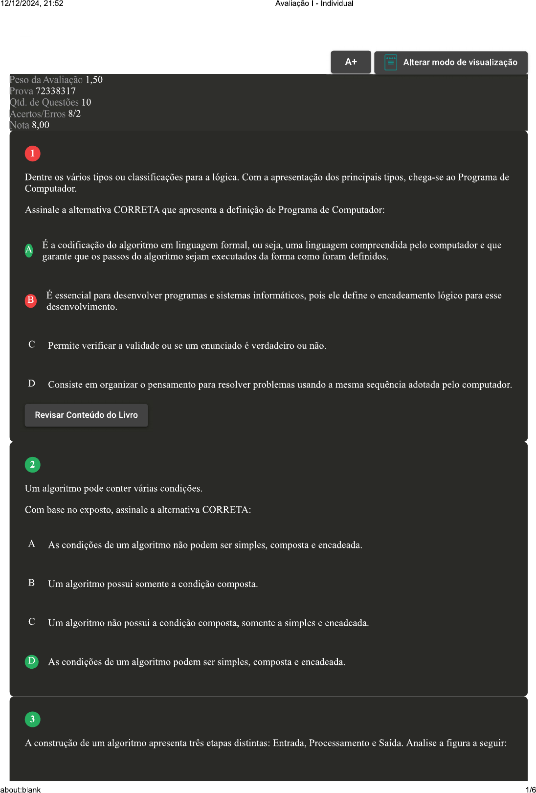 21:52 Avaliação Individual A+ Alterar modo de visualização Peso da Avaliação 1,50 Prova 72338317 Qtd. de Questões 10 Acertos/Erros 8/2 Nota 8,00 1 Dentre os vários tipos ou classificações para a lógica. Com a apresentação dos principais tipos, chega-se ao Programa de Computador. Assinale a alternativa CORRETA que apresenta a definição de Programa de Computador: É a codificação do algoritmo em linguagem formal, ou seja, uma linguagem compreendida pelo computador e que garante que os passos do algoritmo sejam executados da forma como foram definidos. B É essencial para desenvolver programas e sistemas informáticos, pois ele define encadeamento lógico para esse desenvolvimento. C Permite verificar a validade ou se um enunciado é verdadeiro ou D Consiste em organizar pensamento para resolver problemas usando a mesma sequência adotada pelo computador. Revisar Conteúdo do Livro 2 Um algoritmo pode conter várias condições. Com base no exposto, assinale a alternativa CORRETA: A As condições de um algoritmo não podem ser simples, composta e encadeada. B Um algoritmo possui somente a condição composta. C Um algoritmo não possui a condição composta, somente a simples e encadeada. D As condições de um algoritmo podem ser simples, composta e encadeada. 3 A construção de um algoritmo apresenta três etapas distintas: Entrada, Processamento e Saída. Analise a figura a seguir: about:blank 1/612/12/2024, 21:52 Avaliação - Individual Entrada Processamento Saida Agora, analise a descrição: representa os procedimentos necessários de manipulação das informações no intuito de produzir o resultado esperado. A qual das três etapas essa descrição pertence? A Saída. B Processamento. C Entrada. D Recursividade. 4 Várias são as práticas adotadas para a construção de algoritmos. Com base no exposto, assinale a alternativa INCORRETA: A Construir o algoritmo para representar a sequência de execução das saídas, não se preocupando com cada passo. B Definir os dados de saída. Na situação proposta, resultado da soma dos dois números usados como entrada do problema. C Transcrever o algoritmo para uma linguagem interpretada por computador. about:blank 2/612/12/2024, 21:52 Avaliação Individual D Descrever os passos para resolver problema. Basicamente descrever processo de soma dos dois números. 5 Várias são as práticas adotadas para a construção de algoritmos. Com base no exposto, assinale a alternativa INCORRETA: A Entender problema a ser resolvido. Um exemplo de problema: somar dois números. Neste caso, imagine que você precisa para executar a solução. B Definir os dados de saída. Na situação proposta, resultado da soma dos dois números usados como entrada do problema. Descrever os passos que não serão necessários para resolver problema. Basicamente descrever os processos não utilizados para realizar a soma dos dois números. D Identificar e definir as entradas do algoritmo. No caso do problema proposto, você teria como entrada dois números. 6 Para desenvolver adequadamente um algoritmo, é necessário usar a lógica, que consiste em organizar pensamento para resolver problemas usando a mesma sequência adotada pelo computador, ou seja, usando a mesma lógica. A lógica, ao longo de toda sua história, justificou-se como um estudo sobre os argumentos. Em especial, a lógica justifica-se como um estudo sobre os critérios pelos quais se podem distinguir os "bons" dos "maus" argumentos. Quais os principais tipos de lógica? A Lógica aristotélica, Lógica de programação, Lógica de argumentação, Lógica matemática e Lógica sistemática. B Lógica aristotélica, Lógica de programação, Lógica de avaliação, Lógica matemática e Lógica proposicional. C Lógica socrática, Lógica de programação, Lógica de argumentação, Lógica matemática e Lógica proposicional. D Lógica aristotélica, Lógica de programação, Lógica de argumentação, Lógica matemática e Lógica proposicional. 7 Sabe-se que uma figura fala por mil palavras. No processo de aprendizagem fixa com mais facilidade imagens do que conceitos escritos. Nesse contexto, assinale a alternativa CORRETA que apresenta que é diagrama de blocos ou fluxograma: about:blank 3/612/12/2024 21:52 Avaliação Individual É uma forma criada com a intenção de substituir os diagramas tradicionais. Apresenta uma visão mais hierárquica e A estruturada da lógica do sistema. Seu uso consiste no fato de que é mais fácil representar as estruturas que tem um ponto de entrada e um ponto de saída e são compostas pelas estruturas básicas de controle de sequência, seleção e repartição. É uma forma padronizada eficaz para representar os passos lógicos de um determinado processamento. É possível definir uma sequência de símbolos. com significado bem definido. Tem como principal função facilitar a visualização dos passos de um processamento. É uma forma criada com a intenção de substituir os diagramas tradicionais. É possível definir uma sequência de C símbolos. com significado bem definido. Tem como principal função facilitar a visualização dos passos de um processamento. É uma forma padronizada eficaz para representar os passos lógicos de um determinado processamento. Apresenta D uma visão mais hierárquica e estruturada da lógica do sistema. Seu uso consiste no fato de que é mais fácil representar as estruturas que tem um ponto de entrada e um ponto de saída e são compostas pelas estruturas básicas de controle de sequência, seleção e repartição. 8 O fluxograma é uma ferramenta usada e desenvolvida pelos profissionais de análise de sistemas. bem por alguns profissionais de Organização, Sistemas e Métodos. Tem como finalidade descrever fluxo, seja manual ou mecânico. especificando os suportes usados para os dados e informações. Usa símbolos convencionais. permitindo poucas variações. Representado por alguns desenhos geométric