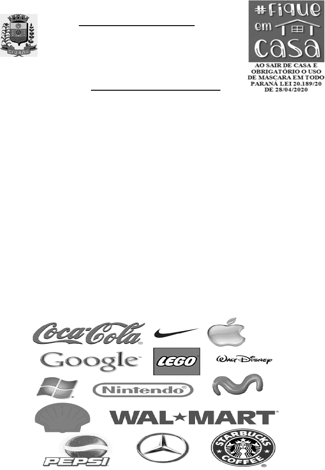 CADERNO DE ATIVIDADES 1º ANO – ENSINO FUNDAMENTAL PERÍODO DE REALIZAÇÃO DAS ATIVIDADES: DE 01 /06/ 2020 A 05 / 06 / 2020. DEVOLVER NO DIA: 08 / 06 / 2020. ESSE CADERNO DE ATIVIDADES ESTÁ DE ACORDO COM O CURRÍCULO DA REDE ESTADUAL PARANAENSE - CREP ESCOLA MUNICIPAL ________________________________________________________ PROFESSORA: _____________________________________________________________ ALUNO (A): ________________________________________________________________ COMPONENTE CURRICULAR: LÍNGUA PORTUGUESA CÓDIGOS DOS OBJETIVOS DE APRENDIZAGEM: PR.EF01LP03.a.1.03 - PR.EF15LP10.a.1.27 - PR.EF – PR.EF01LP08.a.1.08 – PR.EF01LP11.A.1.11 - 1- ESTUDE COM SEUS PAIS: LOGOTIPO E LOGOMARCA SÃO UMA REPRESENTAÇÃO VISUAL OU GRÁFICA QUE IDENTIFICA UMA MARCA OU UMA EMPRESA. A CRIAÇÃO DE UM LOGOTIPO É MUITO IMPORTANTE. SENDO ASSIM, NÃO BASTA SER VISUALMENTE AGRADÁVEL, TEM QUE SIGNIFICAR ALGUMA COISA. POR ISSO, É PRECISO USAR A CRIATIVIDADE, AS CORES, AS FORMAS E LETRAS. ESTE GÊNERO DISCURSIVO CIRCULA EM TODO CONTEXTO SOCIAL COM A FINALIDADE DE IDENTIFICAR UMA MARCA OU EMPRESA. ESSES SÃO ALGUNS EXEMPLOS: 2- NOS LOGOTIPOS SÃO USADAS LETRAS COM TRAÇADOS DIFERENTES, VEJA AS QUATRO FORMAS QUE ENCONTRAMOS EM NOSSO ALFABETO: 3- COMPLETE O ALFABETO COM AS LETRAS MAIÚSCULA NO FORMATO CAIXA ALTA: 4- JUNTO DE SUA FAMÍLIA OBSERVE AS IMAGENS ABAIXO E RESPONDA AS QUESTÕES: ONDE PODEMOS ENCONTRAR ESTAS IMAGENS? _____________________________________________________________________________ PARA QUE USAMOS CADA PRODUTO DESSES? ____________________________________________________________________________ ____________________________________________________________________________ ____________________________________________________________________________ a b c d e f g h i j k l m n o p q r s t u v w x y z 5- PREENCHA A TABELA COM BASTANTE ATENÇÃO: 6- COMPLETE A CRUZADINHA: 7- OBSERVE COM AUXÍLIO DE SEUS PAIS AS EMBALAGENS EM SUA CASA E CLASSIFIQUE OS LOGOTIPOS DE ACORDO COM O QUADRO ABAIXO: 8- VOCÊ RECEBEU DA ESCOLA O LIVRO DIDÁTICO DE LÍNGUA PORTUGUESA. ABRA O LIVRO E REALIZE AS ATIVIDADES PROPOSTAS, AS ATIVIDADES SÃO COM AS LETRAS CHAMADAS DE VOGAIS, LETRAS ESSAS QUE ENCONTRAMOS EM TODAS AS PALAVRAS ESCRITAS. NÃO ESQUEÇA TAMBÉM DE VER O VÍDEO QUE A PROFESSORA SUGERIU COM OS SONS DAS LETRAS. O NOME DO VÍDEO É: “OS SONS DAS LETRAS” TIA SOL ROSA, DISPONÍVEL EM: YOUTUBE.COM PÁGINA 26, 27, 28, 29: ATIVIDADES COM A LETRA A PÁGINA 30, 31: ATIVIDADES COM A LETRA O PÁGINA 32, 33: ATIVIDADES COM A LETRA I O LIVRO DIDÁTICO PODERÁ FICAR NA SUA CASA, POIS NA PRÓXIMA SEMANA SERÃO PROPOSTAS ATIVIDADES COM AS VOGAIS E - U. HIGIENE PESSOAL ALIMENTO BEBIDA PRODUTO DE LIMPEZA COMPONENTE CURRICULAR: MATEMÁTICA CÓDIGOS DOS OBJETIVOS DE APRENDIZAGEM: PR.EF01MA02.n.1.09 – PR.EF01MA02.d.1.10 – PR.EF01MA03.d.1.13 1- JUNTO DE UM FAMILIAR OBSERVE O QUADRO ABAIXO, CONTE OS NUMERAIS NA SEQUÊNCIA: 2- COMPLETE A SEQUÊNCIA NUMÉRICA: 3- CONTE AS FIGURAS E CIRCULE O NÚMERO CORRETO: 4- PINTE OS QUADRINHOS DE ACORDO COM O NUMERAL: COMPONENTE CURRICULAR: GEOGRAFIA CÓDIGO DO OBJETIVO DE APRENDIZAGEM: PR.EF01GE09.a.1.3 1- OBSERVE COM ATENÇÃO ESTA IMAGEM QUE REPRESENTA UMA SALA DE AULA, OS OBJETOS E AS PESSOAS ESTÃO POSICIONADAS DE ACORDO COM REGRAS DE ORGANIZAÇÃO, PARA QUE O ESPAÇO SEJA MAIS BEM APROVEITADO. ASSIM TAMBÉM ACONTECE EM NOSSAS CASAS E OUTROS LOCAIS, A LOCALIZAÇÃO DOS OBJETOS PRECISA ESTAR DE ACORDO COM AS PESSOAS QUE VIVEM OU TRABALHAM NESSES ESPAÇOS. 2- COM AUXÍLIO DE SEUS PAIS RESPONDA AS PERGUNTAS SOBRE O ESPAÇO DA SALA DE AULA: O QUE HÁ SOBRE A MESA DA PROFESSORA? R: __________________________________________________________ O QUE APARECE AO LADO DO QUADRO, PENDURADO NA PAREDE? R: _________________________________________________________ ALÉM DA MESA DA PROFESSORA, O QUE HÁ MAIS NA PARTE DA FRENTE DA SALA DE AULA? R: _________________________________________________________________________ COMPONENTE CURRICULAR: HISTÓRIA CÓDIGO DO OBJETIVO DE APRENDIZAGEM: PR.EF01HI03.d.1.10 1- PINTE OS NOMES DAS PESSOAS QUE MORAM COM VOCÊ EM SUA CASA: 2- CONVERSE COM SEUS PAIS SOBRE AS ATIVIDADES QUE REALIZAM NOS FINAIS DE SEMANA, QUANDO AS PESSOAS DA FAMÍLIA NÃO ESTÃO OCUPADAS COM OS DEVERES DO TRABALHO E DE CASA. PINTE O QUE COSTUMA FAZER COM OS FAMILIARES NOS MOMENTOS DE LAZER: COMPONENTE CURRICULAR – ARTE CÓDIGOS DOS OBJETIVOS DE APRENDIZAGEM: PR.EF15AR.n.1.06 - PR.EF15AR15.d.1.12 VAMOS BRINCAR COM MÍMICA E DESENVOLVER NOSSA IMAGINAÇÃO. MÍMICA ESSA É UMA BRINCADEIRA COM LEITURA MUITO SIMPLES, QUE NÃO REQUER MUITOS MATERIAIS. BASTA ESCREVER O NOME DE HISTÓRIAS INFANTIS CLÁSSICAS — COMO ―OS TRÊS PORQUINHOS‖, ―CHAPEUZINHO VERMELHO‖ E ―A BELA ADORMECIDA‖ — EM ALGUNS PAPÉIS E, DEPOIS, DOBRÁ-LOS, DE MODO QUE OS NOMES FIQUEM ESCONDIDOS. EM SEGUIDA, COLOQUE OS PAPÉIS EM UM SAQUINHO E PEÇA PARA ALGUÉM DA SUA FAMILIA TIRAR UM TÍTULO. ELA TERÁ QUE ENCENAR A HISTÓRIA SORTEADA PARA OS FAMILIAS . QUEM ACERTAR PODE GANHAR PONTOS E SER O PRÓXIMO A FAZER A MÍMICA. APÓS VOCÊ IRÁ ESCOLHER UMA HISTÓRIA E REPRESENTAR EM FORMA DE DESENHOS: COMPONENTE CURRICULAR – CIÊNCIAS CÓDIGO DO OBJETIVO DE APRENDIZAGEM: PR.EF01CI05.s.1.07 - PR.EF01CI06.s.1.08 1- HORA DA BRINCADEIRA CONVIDE SEUS FAMILIARES PARA RESPONDER AS ADIVINHAÇÕES QUE VOCÊ IRÁ REGISTRAR ABAIXO. O QUE É, O QUE É? HÁ QUEM O MATE POR QUERER, SEM LHE TIRAR NUNCA A VIDA. POBRE É TODO O QUE O PERDER, E TEM MAIS QUE UMA MEDIDA. TEMPO. QUAL É A COISA, QUAL É ELA, QUE NÃO TEM PÉS NEM PATAS E PASSA E CORRE, SEM PARAR. UNS DIZEM QUE VOA, MAS NÃO TEM ASAS E OUTROS DIZEM SER DINHEIRO, SEM JAMAIS O TEREM VISTO. TEMPO. O QUE É, O QUE É? SÃO SETE IRMÃOS, CINCO FORAM À FEIRA E DOIS NÃO. OS DIAS DA SEMANA. O QUE É, O QUE É? ONTEM SERÁ AMANHÃ E AMANHÃ SERÁ ONTEM? O HOJE. QUAL É O DIA QUE NUNCA CHEGA? AMANHÃ. QUAL É O MÊS MAIS CURTO QUE EXISTE? MAIO, SÓ TEM QUATRO LETRAS. O