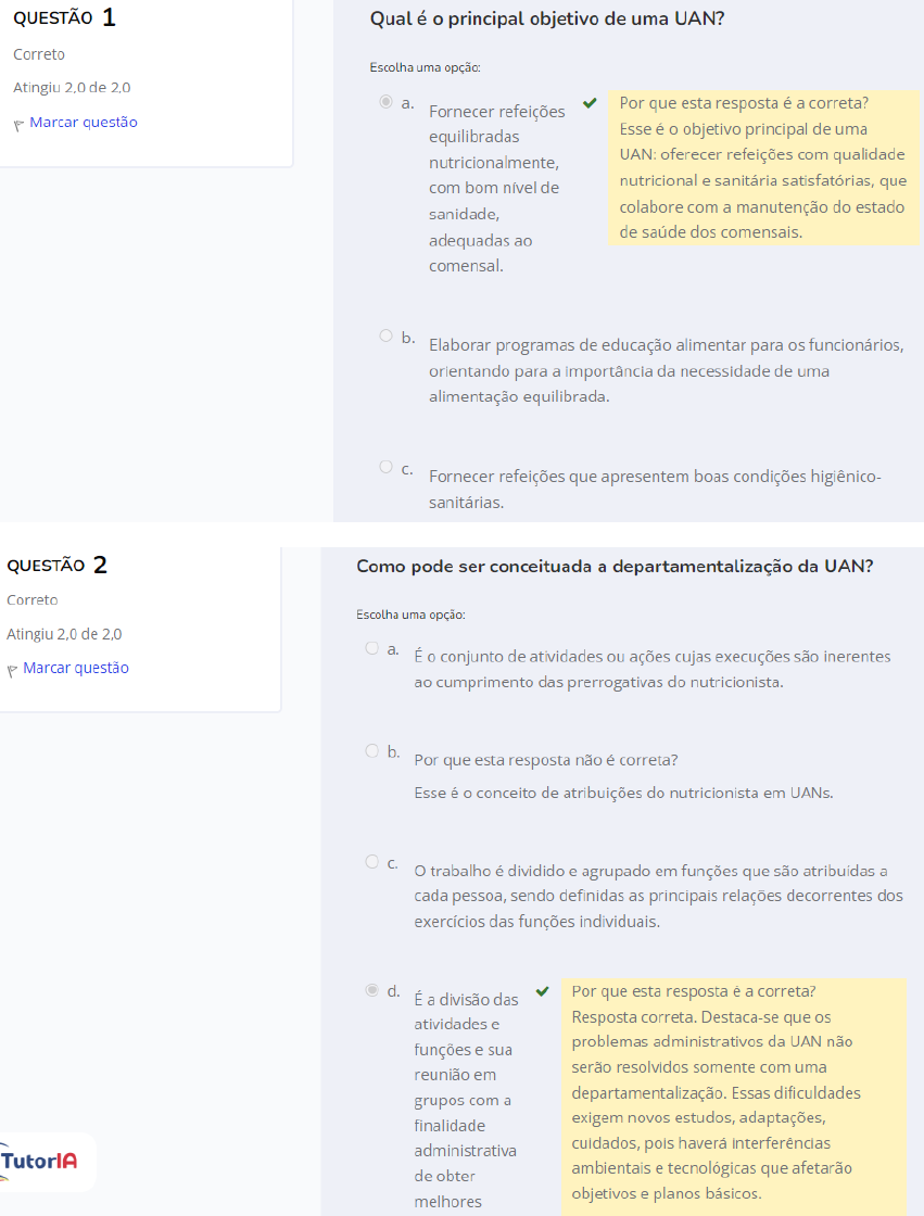 QUESTÃO 1 Qual é o principal objetivo de uma UAN? Correto Escolha uma opção: Atingiu 2,0 de 2,0 a. Fornecer refeições Por que esta resposta é a correta? Marcar questão equilibradas Esse é o objetivo principal de uma nutricionalmente, UAN: oferecer refeições com qualidade com bom nível de nutricional e sanitária satisfatórias, que sanidade, colabore com a manutenção do estado de saúde dos comensais. adequadas ao comensal. b. Elaborar programas de educação alimentar para os funcionários, orientando para a importância da necessidade de uma alimentação equilibrada. C. Fornecer refeições que apresentem boas condições higiênico- sanitárias. QUESTÃO 2 Como pode ser conceituada a departamentalização da UAN? Correto Escolha uma opção: Atingiu 2,0 de 2,0 a. É conjunto de atividades ou ações cujas execuções são inerentes Marcar questão ao cumprimento das prerrogativas do nutricionista. b. Por que esta resposta não é correta? Esse é o conceito de atribuições do nutricionista em UANs. trabalho é dividido e agrupado em funções que são atribuídas a cada pessoa, sendo definidas as principais relações decorrentes dos exercícios das funções individuais. d. É a divisão das Por que esta resposta é a correta? atividades e Resposta correta. Destaca-se que os funções e sua problemas administrativos da UAN não reunião em serão resolvidos somente com uma grupos com a departamentalização. Essas dificuldades finalidade exigem novos estudos, adaptações, administrativa cuidados, pois haverá interferências TutorIA de obter ambientais e tecnológicas que afetarão melhores objetivos e planos básicos.QUESTÃO 3 Correto É conceituado como um formulário de especificação de Atingiu 2,0 de 2,0 preparações dietéticas, destinado aos registros dos componentes da preparação e suas quantidades per capita, das Marcar questão técnicas culinárias e dietéticas empregadas, do custo direto e do cálculo de nutrientes e de outras informações, a critério do serviço ou unidade de alimentação e nutrição. A que termo se refere a descrição precedente? d. Ficha técnica Por que esta resposta é a correta? de Trata-se da definição mais clássica deste preparações. formulário, que é amplamente utilizado nas UANs e que colabora sobremaneira no desenvolvimento do trabalho. É recomendado que todas as UANs tenham suas fichas técnicas de preparação. e. Documento formal da unidade ou serviço de alimentação e nutrição, elaborado pelo nutricionista responsável técnico, no qual estão descritos os procedimentos para as diferentes etapas de produção de alimentos e refeições e prestação de serviço de nutrição e registradas as especificações dos padrões de identidade e qualidade adotados pelo serviço, devendo seu cumprimento ser supervisionado por nutricionista.QUESTÃO 4 Qual é o nome da unidade gerencial do serviço de nutrição e Correto dietética onde são desenvolvidas todas as atividades técnico- administrativas necessárias para a produção de alimentos e Atingiu 2,0 de 2,0 refeições, a sua distribuição para coletividades sadias e P Marcar questão enfermas, além da atenção nutricional a pacientes na internação e em ambulatórios? Escolha uma opção: a. Empresas Prestadoras de Serviços de Alimentação Coletiva. b. Serviço centralizado. C. Unidade de Por que esta resposta é a correta? alimentação Uma Unidade de Alimentação e Nutrição é uma e nutrição unidade de trabalho que desempenha (UAN). atividades relacionadas à alimentação e nutrição, como o fornecimento de refeições. A UAN é considerada uma unidade de trabalho ou órgão de uma empresa, independente da situação que ocupa na escala hierárquica das TutorIA entidades, seja em nível de divisão, setor, seção etc. A partir da visão sistêmica da empresa, QUESTÃO 5 A área de atuação do nutricionista que abrange o atendimento Correto alimentar e nutricional de clientela ocasional ou definida em Atingiu 2,0 de 2,0 sistema de produção por gestão própria ou sob a forma de P Marcar questão concessão (terceirização) é: Escolha uma opção: a. UAN. b. Nutrição Clínica. C. Consultoria em Nutrição. d. Educação Alimentar e Nutricional. TutorIA e. Alimentação coletiva. Por que esta resposta é a correta?QUESTÃO 1 Termo mais atual que vem sendo utilizado para designar todos Correto os estabelecimentos integrantes do segmento da alimentação fora do lar, sejam eles comerciais ou coletivos. Atingiu 2,0 de 2,0 Marcar questão Escolha uma opção: a. Fast food. b. Unidade Recentemente, o termo UPR (Unidade Produtora Produtora de Refeições) vem sendo utilizado para designar de todos os estabelecimentos integrantes do Refeições segmento da alimentação fora do lar (catering, (UPR). food service, restauration), sejam eles comerciais (restaurantes, bares e similares) ou coletivos (UAN). Basicamente, o que diferencia as UPR comerciais das coletivas é o grau de fidelidade do cliente ao serviço associado ao escopo do serviço que, no caso da UPR coletiva, o público é fixo (clientela definida) e o restaurante é na própria empresa na qual está tal clientela, e a UPR comercial, por sua vez, atende qualquer tipo de público (individual ou grupos). Self-service. d. Slow food. TutorIA e. Food service. QUESTÃO 2 Tipo de Unidade de Alimentação e Nutrição (UAN) localizada Correto dentro das empresas e que tem o propósito de oferecer refeições aos funcionários, sem venda direta. Atingiu 2,0 de 2,0 Marcar questão Escolha uma opção: a. UAN A UAN institucional é aquela que se localiza institucional. dentro das empresas e tem propósito de oferecer refeições aos funcionários ou a algum visitante, conforme autorização do responsável pela empresa ou pelo serviço. Essa UAN se caracteriza também por não visar ao lucro, visto que não disponibiliza seus produtos e serviços ao público externo. Ou seja, não há comer