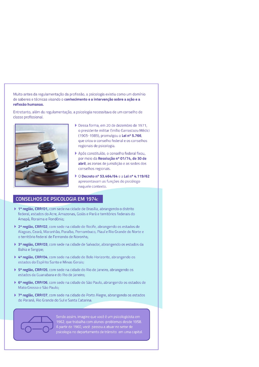 Gabarito Unidade A psicologia no Brasil Desafio De acordo com Freitas Campos (CFP, 1992), embora já existissem profissionais praticando a psicologia nas mais diversas instituições no período anterior à Lei nº 4.119/62 (que formalizou a profissão de psicólogo no Brasil), a regulamentação marcou um lugar para o psicólogo na divisão social e técnica do trabalho ao definir não só as condições de formação, mas as áreas de domínio prático que viriam a ser consideradas privativas do profissional. Atente aos dados a seguir: A partir desses dados, responda: a) O que você faria para obter registro de psicólogo? b) Em 1964, já havia pelo menos 10 funções do psicólogo regulamentadas. Quais eram elas? Padrão de resposta esperado a) Para meu exercício profissional em psicologia, seria obrigatório ter registro dos diplomas na diretoria do ensino superior do Ministério da Educação e Cultura. b) Conforme a Lei nº 4.119/62 e o Decreto nº 53.464/64, são funções do profissional: - dar diagnóstico psicológico; - orientar e selecionar profissional; - dar orientação psicopedagógica; - solucionar problemas de ajustamento; - colaborar em assuntos psicológicos ligados a outras ciências; - dirigir serviços de psicologia em órgãos e estabelecimentos públicos, autárquicos, paraestatais, de economia mista e particulares; - ensinar as cadeiras ou as disciplinas de psicologia nos vários níveis de ensino, observadas as demais exigências da legislação em vigor; - supervisionar profissionais e alunos em trabalhos teóricos e práticos de psicologia; - assessorar, tecnicamente, órgãos e estabelecimentos públicos, autárquicos, paraestatais, de economia mista e particulares; - realizar perícias e emitir pareceres sobre a matéria de psicologia. Exercícios 1. Para que o psicólogo possa legalmente exercer sua profissão, é necessário registro no conselho de classe. Para Oswaldo Barros Santos, a Lei nº 4.119/62 foi uma grande conquista, pois se precisava com urgência de um organismo que fiscalizasse a prática da psicologia que, naquela época, era também exercida por muitos trapaceiros. Logo ao ser promulgada, a Lei nº 4.119/62, que regulamenta a profissão de psicólogo, o registro profissional era realizado em que órgão? C. No ministério de educação e cultura. 2. As instituições superiores de ensino foram criadas no Brasil somente no século XIX, o que fez com que a psicologia percorresse outros caminhos em sua história. Por exemplo, os jesuítas mostraram-se portadores e transmissores de ideias psicológicas, principalmente porque a educação era tida inicialmente pelos religiosos (MASSIMI in JACO-VILELA, 2018). Dentro dessas ideias, quais se podem destacar? C. Pedagogia humanista, psicologia das paixões e filosofia da alma. 3. Conforme Soares (2010), as primeiras contribuições para o estudo da psicologia no Brasil foram oferecidas por médicos. Em suas teses de doutoramento, estudantes e profissionais, sobretudo no Rio de Janeiro e na Bahia, ingressavam no campo da psicologia racional e filosófica. Pouco mais de uma década, após o início das atividades de Wundt, em 1879, no Rio de Janeiro, começam a aparecer teses de doutoramento, em que a envergadura científica é bastante apreciável. Nesse aspecto, qual a tese que Guedes Cabral defendeu? B. Em 1876, defende tese Funções de cérebro. 4. A psicologia, no Brasil, escreve um capítulo especial com a fundação da associação brasileira de educação, fundada por Heitor Lyra da Silva, em 1924. No seu quadro social, a associação reúne os nomes exponenciais de Fernando de Azevedo, Lourenço Filho e Anísio Teixeira, responsáveis pela grande revolução na educação nacional (SOARES, 2010). A qual mérito se destaca Anísio Teixeira? D. Criou o instituto nacional de estudos e pesquisas educacionais. 5. Conforme Antônio Marcos Chaves (CFP, 1992), a primeira organização representativa da profissão surgiu em 1954, com a criação da associação brasileira de psicologia, em 10 de outubro. Nesse mesmo ano, o arquivo brasileiro de psicologia publica o anteprojeto da lei sobre a formação de psicologista, como na época era denominada a profissão (SOARES, 2010). Porém, foi o conselho federal de psicologia que passou a oficialmente regulamentar, orientar e fiscalizar o exercício profissional. Qual foi a norma legal que criou o conselho federal e os conselhos regionais de psicologia? B. A Lei nº 5.766/1971. image1.png