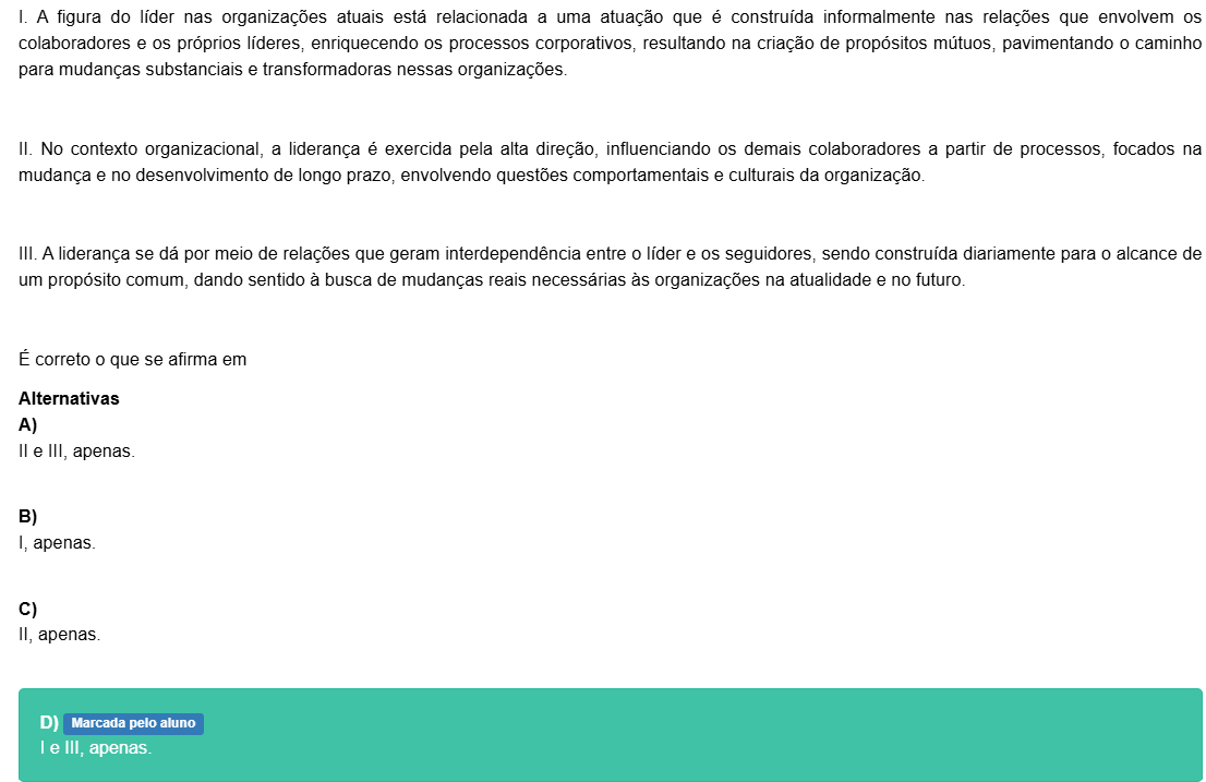 I. A figura do líder nas organizações atuais está relacionada a uma atuação que é construída informalmente nas relações que envolvem os colaboradores e os próprios líderes, enriquecendo os processos corporativos, resultando na criação de propósitos mútuos, pavimentando o caminho para mudanças substanciais e transformadoras nessas organizações. II. No contexto organizacional, a liderança é exercida pela alta direção, influenciando os demais colaboradores a partir de processos, focados na mudança e no desenvolvimento de longo prazo, envolvendo questões comportamentais e culturais da organização. III. A liderança se dá por meio de relações que geram interdependência entre o líder e os seguidores, sendo construída diariamente para o alcance de um propósito dando sentido à busca de mudanças reais necessárias às organizações na atualidade e no futuro. É correto o que se afirma em Alternativas A) II e III, B) I, C) II, apenas. D) Marcada pelo aluno le III, apenas.