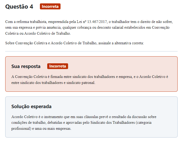 Questão 4 Incorreta Com a reforma empreendida pela Lei n° 13.467/2017, o trabalhador tem o direito de não sofrer, sem sua expressa e prévia anuência, qualquer cobrança ou desconto salarial estabelecidos em Convenção Coletiva ou Acordo Coletivo de Trabalho. Sobre Convenção Coletiva e Acordo Coletivo de Trabalho, assinale a alternativa correta: Sua resposta Incorreta A Convenção Coletiva é firmada entre sindicato dos trabalhadores e empresa, e Acordo Coletivo é entre sindicato dos trabalhadores e sindicato Solução esperada Acordo Coletivo é o instrumento que em suas cláusulas prevê resultado da discussão sobre condições de trabalho, debatidas e aprovadas pelo Sindicato dos Trabalhadores (categoria profissional) e uma ou mais empresas.