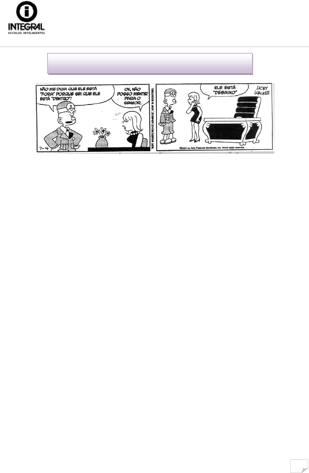 Língua Portuguesa – Gramática: Lista 02 Suplemento Página 1 de 19 Colégio Integral – série 7º ano – 2º bimestre - 2013 1 1) Leia a tira. (Mort Walker.Recruta Zero. Folha de S. Paulo, 09/06/2001) Agora responda. a) Na tira, que palavras indicam onde ele está? b) Essa palavras dão idéia de: ( ) afirmação. ( ) dúvida. ( ) intensidade. ( ) lugar. ( ) tempo. 2) As palavras fora, dentro e debaixo referem-se ao: ( ) verbo diga. ( ) pronome ele. ( ) verbo está. ( ) verbo sei. 3) Passe para o plural. ele está fora - _______________________________________________________________________ ele está dentro - _____________________________________________________________________ Passe para o feminino. ele está dentro - _____________________________________________________________________ ele está debaixo - ____________________________________________________________________ 4) O que você observou em relação às palavras destacadas no exercício 3? 5) Faça o que se pede. a) Complete com uma das palavras entre parênteses. Fora, dentro e debaixo são palavras ________________________________ (variáveis — invariáveis) b) Justifique sua escolha. 6) Leia e observe os advérbios destacados. A atriz falou pouco. A atriz é bastante charmosa. A atriz desempenhou muito bem seu papel. a) As palavras pouco, bastante e muito são advérbios que indicam circunstâncias de: ( ) tempo ( ) negação ( ) modo ( ) intensidade ( ) lugar. b) Agora faça uma flecha de cada advérbio até a palavra a que ele se refere. Advérbio Língua Portuguesa – Gramática: Lista 02 Suplemento Página 2 de 19 Colégio Integral – série 7º ano – 2º bimestre - 2013 2 7) Complete o quadro. Advérbio de intensidade Palavra a que se refere Classe gramatical dessa palavra pouco bastante muito 8) As perguntas abaixo são adivinhas. Tente respondê-las1. Por que o prego tem dores de cabeça? Como se aponta um lápis de cor? Quando um cofrinho deve fazer exercícios? Onde o mar descansa ao se sentir cansado? a) Todas as palavras acima são: ( ) declarativas. ( ) exclamativas. ( ) interrogativas. ( ) imperativas. b) Agora faça a correspondência entre as palavras que indicam a pergunta e a circunstância que elas expressam. (a) Por que...? ( ) afirmação (b) Como...? ( ) causa (c) Quando...? ( ) modo (d) Onde...? ( ) intensidade ( ) lugar ( ) tempo 9) Leia: (Scott Adams. Dilbert. Folha de S. Paulo, 19/11/1997) Os termos “em casa” e “aqui” indicam que tipo de circunstância? 10) Compare esse dois termos. a) De quantas palavras é formada a expressão “em casa”? b) E “aqui”? 1 Porque vive levando martelada na cabeça. Com o dedo polegar e o indicador. Quando ele quiser se tornar um cofre-forte. Nos bancos de areia. Língua Portuguesa – Gramática: Lista 02 Suplemento Página 3 de 19 Colégio Integral – série 7º ano – 2º bimestre - 2013 3 c) Portanto, complete: “aqui” é um __________________________ de lugar; “em casa” é uma locução adverbial ________________________________. 11) Numere as colunas de acordo com o tipo de advérbio da coluna do meio. 12) Circule o advérbio de intensidade das orações e faça uma seta indicando a que palavra ele se refere. a) Pedi que eles fizessem o exercício bem depressa para que pudéssemos começar os ensaios. b) Minha prima Carol tem 15 anos, mas é menos alta que eu. c) Caio é um menino bastante esperto. Está reciclando todo o lixo de sal casa. d) Minha mãe ficou meio confusa com a mudança de casa. Todos os advérbios são de _____________________________, pois além do verbo, podem se referir também a __________________________ e ____________________________________. 13) Leia: Noite Tão perto! Tão Longe! Por onde é o deserto? Às vezes, responde, de perto, de longe. Mas depois se esconde. Somos um ou dois? Às vezes, nenhum. E em seguida, tanto! (Cecília Meireles. Antologia poética. Rio de Janeiro, Editora do Autor, 1963) Observe: Tão — advérbio de intensidade perto! — advérbio de lugar ás vezes — locução adverbial de tempo ( ) Possivelmente eu vá até aí ( ) Vera não foi ao zoológico. ( ) Estamos alojados longe do centro. ( ) Minha avó fala depressa. ( ) Certamente ganharei esta corrida. ( ) Ela está menos triste com o fato. ( ) Ontem Carina ganhou um vestido. (1) lugar (2) tempo (3) afirmação (4) negação (5) dúvida (6) intensidade (7) modo ( ) talvez, provavelmente ( ) não ( ) sim, realmente ( ) muito, pouco, mais ( ) bem, mal, devagar ( ) cá, lá, ali, dentro, perto ( ) amanhã, depois, logo Língua Portuguesa – Gramática: Lista 02 Suplemento Página 4 de 19 Colégio Integral – série 7º ano – 2º bimestre - 2013 4 a) Retire os cinco advérbios do poema. b) Retire as cinco locuções adverbiais. 14) Copie, no lugar adequado do quadro, os advérbios e as locuções adverbais que você pintou no exercício anterior. Dê a classificação. Veja os exemplos: Advérbio Locução adverbial tão – advérbio de intensidade às vezes – locução adverbial de tempo 15) Cecília Meireles usa no texto advérbios e locuções adverbiais que sugerem idéias contrárias. Quais são? 16) Substitua cada advérbio destacado por três locuções adverbais abaixo. sem pressa – para amanhã – com atenção – com certeza – durante a aula – durante a noite – de repente – de novo – em silêncio – todos os dias – de Recife – de modo errado a) Ele virá para o show amanhã. b) Meus amigos chegaram ontem. c) O marceneiro serra cuidadosamente a madeira. 17) Transforme as locuções adverbiais destacadas em advérbio, usando a terminação (sufixo) –mente. a) Durante as reuniões, a secretária sempre agia com eficiência. b) Todas as semanas minha avó vai à feira e compra muitas frutas. c) O cachorro latia com raiva para o visitante, apesar de preso no canil. d) A mãe falava com a criança de modo tranqüilo, para acalmá-la. 18) Leias as frases e complete o quadro com os advérbios