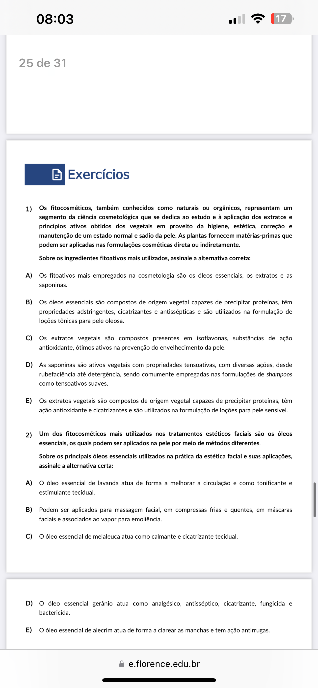 25 de 31 Exercícios 1) Os fitocosméticos, também conhecidos como naturais ou orgânicos, representam um segmento da ciência cosmetológica que se dedica ao estudo e à aplicação dos extratos e princípios ativos obtidos dos vegetais em proveito da higiene, estética correção e manutenção de um estado normal e sadio da pele. As plantas fornecem matérias-primas que podem ser aplicadas nas formulações cosméticas direta ou indiretamente. Sobre os ingredientes fitoativos mais utilizados, assinale a alternativa correta: A) Os fitoativos mais empregados na cosmetologia são os óleos essenciais, os extratos e as saponinas. B) Os óleos essenciais são compostos de origem vegetal capazes de precipitar proteínas, têm propriedades adstringentes, cicatrizantes e antissépticas e são utilizados na formulação de loções tônicas para pele oleosa. C) Os extratos vegetais são compostos presentes em isoflavonas, substâncias de ação antioxidante, ótimos ativos na prevenção do envelhecimento da pele. D) As saponinas são ativos vegetais com propriedades tensoativas, com diversas ações, desde rubefaciência até detergência, sendo comumente empregadas nas formulações de shampoos como tensoativos suaves. E) Os extratos vegetais são compostos de origem vegetal capazes de precipitar proteínas, têm ação antioxidante e cicatrizantes e são utilizados na formulação de loções para pele sensível. 2) Um dos fitocosméticos mais utilizados nos tratamentos estéticos faciais são os óleos essenciais, os quais podem ser aplicados na pele por meio de métodos diferentes. Sobre os principais óleos essenciais utilizados na prática da estética facial e suas aplicações, assinale a alternativa certa: A) óleo essencial de lavanda atua de forma a melhorar a circulação e como tonificante e estimulante tecidual. B) Podem ser aplicados para massagem facial, em compressas frias e quentes, em máscaras faciais e associados ao vapor para emoliência. C) óleo essencial de melaleuca atua como calmante e cicatrizante tecidual. D) óleo essencial gerânio atua como analgésico, antisséptico, cicatrizante, fungicida e bactericida. E) o óleo essencial de alecrim atua de forma a clarear as manchas e tem ação antirrugas. e.florence.edu.br