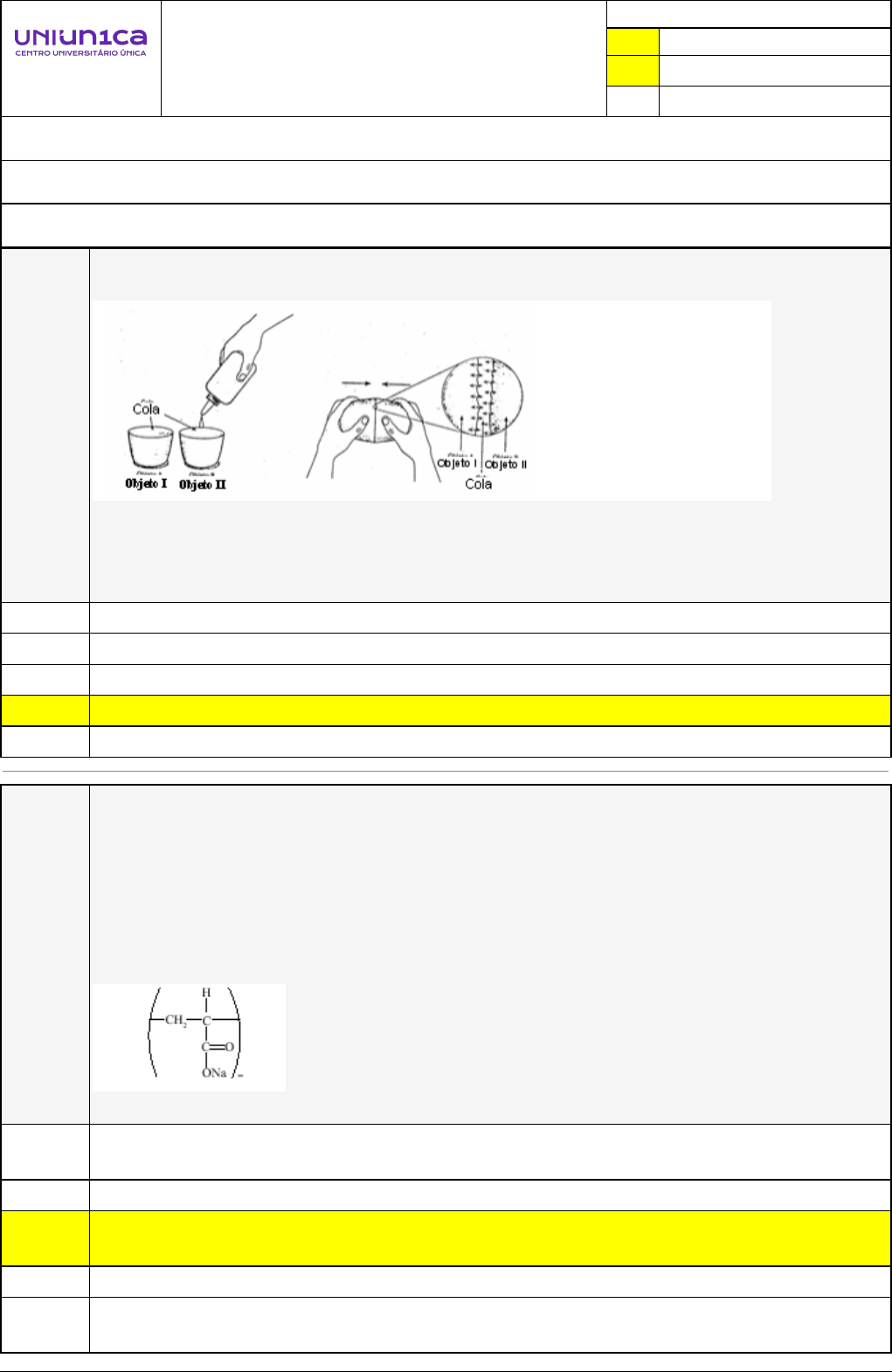 Pincel Atômico - 14/12/2024 10:53:24 1/2 BRUNA DIAS ALMEIDA BARBOSA Avaliação Online (SALA EAD) - Capitulos/Referencias 4,5,6 Atividade finalizada em 19/10/2024 23:14:23 (2769061 / 1) LEGENDA Resposta correta na questão # Resposta correta - Questão Anulada X Resposta selecionada pelo Aluno Disciplina: QUÍMICA GERAL E EXPERIMENTAL [1099199] - Avaliação com 5 questões, com o peso total de 15,00 pontos [capítulos - 4,5,6] Turma: Graduação: ENGENHARIA DE PRODUÇÃO - Grupo: JUNHO/2024 - ENGPROD/JUN24 [122411] Aluno(a): 91618057 - BRUNA DIAS ALMEIDA BARBOSA - Respondeu 5 questões corretas, obtendo um total de 15,00 pontos como nota [359315_1323 53] Questão 001 As colas são produzidas de forma a ter afinidade com os materiais que devem ser colados. Quando passamos cola em dois objetos a fim de uni-los as moléculas da cola interagem fortemente, por meio de interações _____________________ com as moléculas de ambos os objetos. A palavra correta da lacuna é: Atômica. metálicas. iônicas. X intermoleculares . covalentes. [359315_1323 49] Questão 002 A fralda descartável absorve a urina e evita o contato desta com a pele do bebê. Algumas fraldas descartáveis, entretanto, continuam sequinhas, mesmo após absorverem uma grande quantidade de urina. O segredo destas fraldas reside em um produto químico: o poliacrilato de sódio, um polieletrólito. O poliacrilato de sódio seco, estrutura representada a seguir, quando misturado com água, forma um gel que pode aprisionar cerca de 800 vezes o seu peso em água. A camada interna da fralda também é feita com um polímero, o polipropileno, que não fica molhado, evitando as assaduras no bebê. Quanto aos polímeros poliacrilato de sódio e polipropileno, é correto afirmar que a forte interação do poliacrilato de sódio com a água é devida às forças de dispersão de London. o polipropileno não é molhado pela urina porque esta é ácida. X o poliacrilato de sódio forma ligações de hidrogênio com a água, responsável pela formação do gel. o polipropileno não é molhado pela água porque é hidrofílico. as ligações de hidrogênio intermoleculares no polipropileno são mais intensas do que as deste com a água, fazendo com que não se molhe com água. Pincel Atômico - 14/12/2024 10:53:24 2/2 [359315_1323 51] Questão 003 A sacarose (açúcar comum), cuja estrutura é mostrada na figura, é um dissacarídeo constituído por uma unidade de glicose ligada à frutose. A solubilidade da sacarose em água deve-se: X às ligações de hidrogênio resultantes da interação da água com a sacarose. às forças de natureza íon-dipolo, resultantes da interação do dipolo da água com a sacarose. às forças de van der Waals, resultantes da interação da água com a unidade de glicose desmembrada. às forças de dipolo-dipolo, resultantes da interação da água com a unidade de frutose desmembrada. ao rompimento da ligação entre as unidades de glicose e frutose. [359316_1323 56] Questão 004 No gelo seco, as moléculas do dióxido de carbono estão unidas por: ligações iônicas. X forças de van der Waals. pontes de hidrogênio. ligações metálicas. ligações covalentes. [359317_1323 69] Questão 005 É comum observar pessoas com azia, dissolvendo o bicarbonato de sódio em água e bebendo a solução como forma de diminuição da queimação estomacal. A equação BALANCEADA que demonstra a ação do bicarbonato de sódio e os produtos formados é NaHCO3 + HCl → Na2CO2 + HClO NaHCO3 + HCl → NaCO2 + H2O + ½ NaCl2 NaHCO3 + HCl → NaCO2 + HClO X NaHCO3 + HCl → H2O + CO2 + NaCI Na2CO3 + 2 HCl → NaCO2 + H2O + NaClO