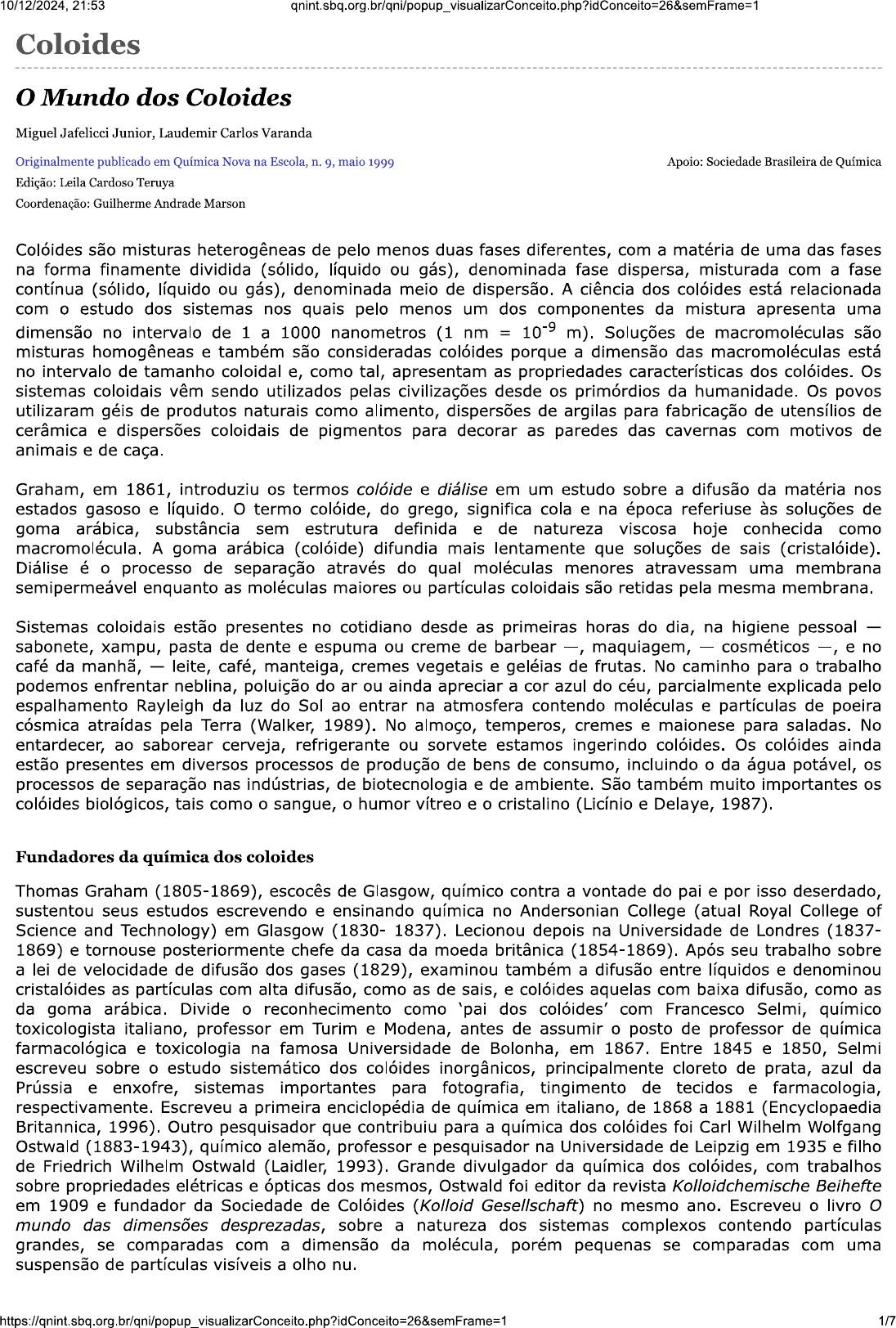 10/12/2024, 21:53 Coloides Mundo dos Coloides Miguel Jafelicci Junior, Laudemir Carlos Varanda Originalmente publicado em Química Nova na Escola, n. 9, maio 1999 Apoio: Sociedade Brasileira de Química Edição: Leila Cardoso Teruya Coordenação: Guilherme Andrade Marson Colóides são misturas heterogêneas de pelo menos duas fases diferentes, com a matéria de uma das fases na forma finamente dividida (sólido, líquido ou gás), denominada fase dispersa, misturada com a fase contínua (sólido, líquido ou gás), denominada meio de dispersão. A ciência dos colóides está relacionada com o estudo dos sistemas nos quais pelo menos um dos componentes da mistura apresenta uma dimensão no intervalo de 1 a 1000 nanometros (1 nm = 10-9 m). Soluções de macromoléculas são misturas homogêneas e também são consideradas colóides porque a dimensão das macromoléculas está no intervalo de tamanho coloidal e, como tal, apresentam as propriedades características dos colóides. Os sistemas coloidais vêm sendo utilizados pelas civilizações desde os primórdios da humanidade. Os povos utilizaram géis de produtos naturais como alimento, dispersões de argilas para fabricação de utensílios de cerâmica e dispersões coloidais de pigmentos para decorar as paredes das cavernas com motivos de animais e de caça. Graham, em 1861, introduziu os termos colóide e diálise em um estudo sobre a difusão da matéria nos estados gasoso e líquido. termo colóide, do grego, significa cola e na época referiuse às soluções de goma arábica, substância sem estrutura definida e de natureza viscosa hoje conhecida como macromolécula. A goma arábica (colóide) difundia mais lentamente que soluções de sais (cristalóide). Diálise é o processo de separação através do qual moléculas menores atravessam uma membrana semipermeável enquanto as moléculas maiores ou partículas coloidais são retidas pela mesma membrana. Sistemas coloidais estão presentes no cotidiano desde as primeiras horas do dia, na higiene pessoal sabonete, xampu, pasta de dente e espuma ou creme de barbear maquiagem, cosméticos e no café da manhã, leite, café, manteiga, cremes vegetais e geléias de frutas. No caminho para o trabalho podemos enfrentar neblina, poluição do an ou ainda apreciar a con azul do céu, parcialmente explicada pelo espalhamento Rayleigh da luz do Sol ao entrar na atmosfera contendo moléculas e partículas de poeira cósmica atraídas pela Terra (Walker, 1989). No almoço, temperos, cremes e maionese para saladas. No entardecer, ao saborear cerveja, refrigerante ou sorvete estamos ingerindo colóides. Os colóides ainda estão presentes em diversos processos de produção de bens de consumo, incluindo o da água potável, os processos de separação nas indústrias, de biotecnologia e de ambiente. São também muito importantes os colóides biológicos, tais como o sangue, o humor vítreo e o cristalino (Licínio e Delaye, 1987). Fundadores da química dos coloides Thomas Graham (1805-1869), escocês de Glasgow, químico contra a vontade do pai e por isso deserdado, sustentou seus estudos escrevendo e ensinando química no Andersonian College (atual Royal College of Science and Technology) em Glasgow (1830- 1837). Lecionou depois na Universidade de Londres (1837- 1869) e tornouse posteriormente chefe da casa da moeda britânica (1854-1869). Após seu trabalho sobre a lei de velocidade de difusão dos gases (1829), examinou também a difusão entre líquidos e denominou cristalóides as partículas com alta difusão, como as de sais, e colóides aquelas com baixa difusão, como as da goma arábica. Divide o reconhecimento como 'pai dos colóides' com Francesco Selmi, químico toxicologista italiano, professor em Turim e Modena, antes de assumir o posto de professor de química farmacológica e toxicologia na famosa Universidade de Bolonha, em 1867. Entre 1845 e 1850, Selmi escreveu sobre o estudo sistemático dos colóides inorgânicos, principalmente cloreto de prata, azul da Prússia e enxofre, sistemas importantes para fotografia, tingimento de tecidos e farmacologia, respectivamente. Escreveu a primeira enciclopédia de química em italiano, de 1868 a 1881 (Encyclopaedia Britannica, 1996). Outro pesquisador que contribuiu para a química dos colóides foi Carl Wilhelm Wolfgang Ostwald (1883-1943), químico alemão, professor e pesquisador na Universidade de Leipzig em 1935 e filho de Friedrich Wilhelm Ostwald (Laidler, 1993). Grande divulgador da química dos colóides, com trabalhos sobre propriedades elétricas e ópticas dos mesmos, Ostwald foi editor da revista Kolloidchemische Beihefte em 1909 e fundador da Sociedade de Colóides (Kolloid Gesellschaft) no mesmo ano. Escreveu o livro mundo das dimensões desprezadas, sobre a natureza dos sistemas complexos contendo partículas grandes, se comparadas com a dimensão da molécula, porém pequenas se comparadas com uma suspensão de partículas visíveis a olho nu. 1/710/12/2024, 21:53 Propriedades dos coloides Os princípios relacionados com os diferentes sistemas coloidais da Tabela 1 baseiam-se em propriedades comuns a todos os colóides: tamanho e elevada relação área/volume de partículas (Shaw, 1975). As partículas dispersas podem ter tamanhos diferentes e por isso o sistema coloidal é denominado polidisperso. Na prática, a maioria dos colóides obtidos pelo homem é polidispersa. Os sistemas com partículas de um mesmo tamanho são monodispersos. As macromoléculas de proteínas sintetizadas biologicamente têm todas um mesmo tamanho e massa molecular, por isso dão origem a colóides monodispersos. Diversos pesquisadores obtiveram colóides monodispersos de polímeros sintéticos, de metais, de óxidos metálicos e de cloreto de prata. Tabela 1: Classificação dos colóides de acordo com as fases dispersa e de dispersão. Colóide Fase dispersa Fase de dispersão Exemplo Aerossol líquido Líquido Gás Neblina, desodor