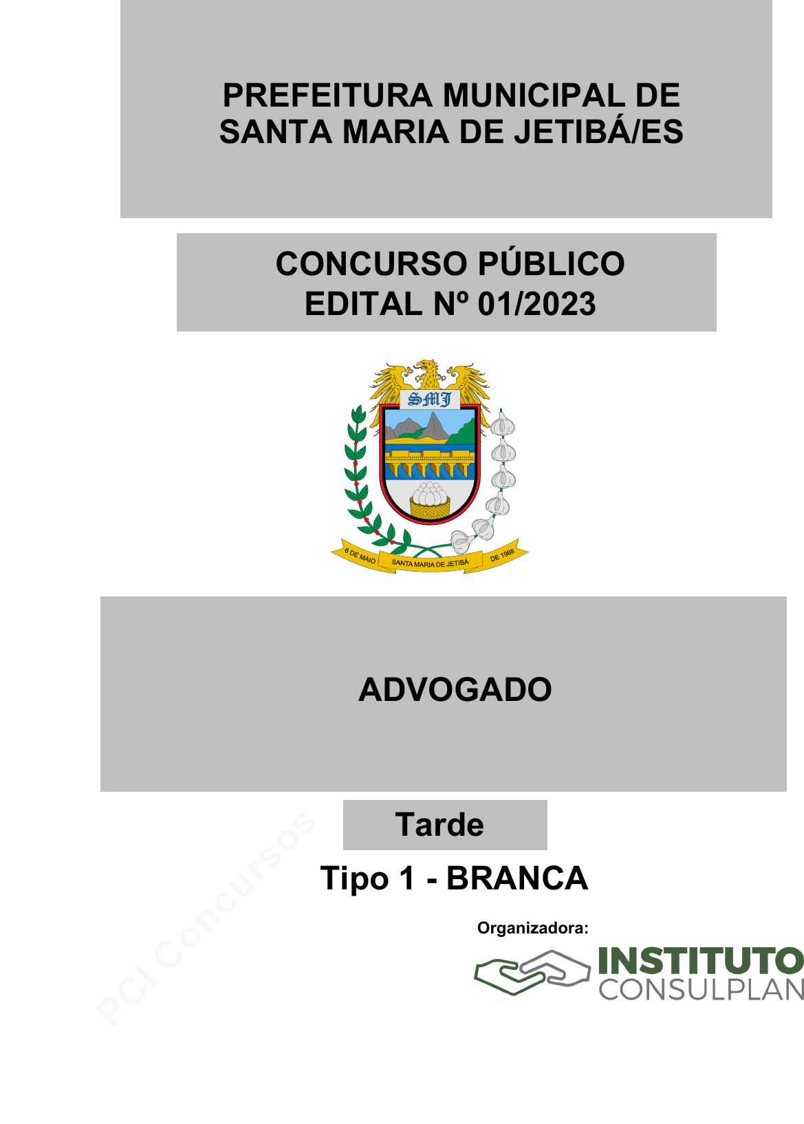 pcimarkpci MjgwNDowMmU4OjgwMjE6MWMwMDpmODExOjI0ZWI6Y2ZjYjoxYjFm:RnJpLCAxNSBOb3YgMjAyNCAxNDo1ODo0NiAtMDMwMA== www.pciconcursos.com.br ADVOGADO Organizadora: PREFEITURA MUNICIPAL DE SANTA MARIA DE JETIBÁ/ES Tipo 1 - BRANCA Tarde CONCURSO PÚBLICO EDITAL Nº 01/2023 pcimarkpci MjgwNDowMmU4OjgwMjE6MWMwMDpmODExOjI0ZWI6Y2ZjYjoxYjFm:RnJpLCAxNSBOb3YgMjAyNCAxNDo1ODo0NiAtMDMwMA== www.pciconcursos.com.br 2 CARGO: ADVOGADO – TIPO 1 – BRANCA (T) CONCURSO PÚBLICO – PREFEITURA MUNICIPAL DE SANTA MARIA DE JETIBÁ/ES ֏ CARGO: ADVOGADO CONHECIMENTOS ESPECÍFICOS DIREITO CONSTITUCIONAL Questão 01 O Deputado Federal Simplício foi convidado para exercer um cargo de Secretário no Estado X da Federação. Em determinado dia, quando já havia tomado posse voluntariamente no cargo de Secretário de Estado, Simplício agrediu fisicamente sua companheira e foi preso em flagrante delito pela prática de lesão corporal no âmbito da Lei Maria da Penha. Conforme dispõe a Constituição Federal, A) na qualidade de Deputado Federal, ainda que fora do exercício das funções legislativas, Simplício está acobertado pelas imunidades material e processual. B) a prisão de Simplício deverá ser comunicada à Câmara dos Deputados, para que os membros da respectiva casa legislativa decidam sobre a manutenção da sua prisão. C) a prisão de Simplício é ilegal, pois Deputados Federais possuem imunidade formal em relação à prisão e, portanto, só podem ser presos em flagrante delito de crime inafiançável. D) ao assumir um cargo como Secretário no âmbito do Poder Executivo, Simplício não está acobertado pelas imunidades parla- mentares, sendo possível a sua prisão em flagrante delito por crime afiançável. Questão 02 Em relação ao controle concentrado de constitucionalidade realizado por meio de ação declaratória de constitucionalidade, analise as afirmativas a seguir. I. A Ação Declaratória de Constitucionalidade (ADC) tem como objetivo principal apartar a insegurança jurídica causada pela incerteza acerca da validade de uma determinada lei ou ato normativo federal, tendo a decisão em sede de ADC o condão de declarar a presunção absoluta da constitucionalidade da norma questionada. II. Para a propositura de uma ação declaratória de constitucionalidade, é imprescindível a comprovação de entendimentos doutrinários diversos acerca da presunção de constitucionalidade de lei ou ato normativo federal. III. No âmbito da ação declaratória de constitucionalidade, é necessária a oitiva do Advogado-Geral da União e do Procurador- -Geral da República, na qualidade de fiscal da lei. IV. A decisão emanada em sede de ação declaratória de constitucionalidade admite a possibilidade de reexame da matéria, desde que sejam apresentados novos argumentos que justifiquem a aplicação de nova interpretação em face da inconstitu- cionalidade da lei ou ato normativo federal. Está correto o que se afirma apenas em A) I. B) IV. C) I e II D) II e III. Questão 03 A depender do critério utilizado, uma constituição poderá ser analisada e classificada de formas distintas. Em relação à classificação das constituições, podemos afirmar que a Constituição da República Federativa do Brasil de 1988 é: A) Dogmática, pois abarca em seu texto diferentes ideologias, que se harmonizam com os direitos e as garantias fundamentais dos indivíduos, e rígida, ao admitir alterações em seu texto, desde que por um processo legislativo específico e mais solene do que o previsto a alteração das normas infraconstitucionais. B) Ortodoxa, pois foi elaborada em um momento específico da história, concatenando em seu texto os princípios e ideários que prevaleciam àquela época, e rígida, ao admitir alterações em seu texto, desde que por um processo legislativo específico e mais solene do que o previsto a alteração das normas infraconstitucionais. C) Principiológica, pois há a predominância de princípios constitucionais consagradores de valores fundamentais, e analítica, ao regulamentar não só os princípios e normas relativos à organização do Estado, organização dos Poderes e os direitos e garantias fundamentais dos indivíduos, mas também, de forma extensa, outros temas que o constituinte julgou de interesse nacional. D) Analítica, ao regulamentar não só os princípios e normas relativos à organização do Estado, organização dos Poderes e os direitos e garantias fundamentais dos indivíduos, mas também outros temas que o constituinte julgou de interesse nacional, e dogmática, pois abarca em seu texto diferentes ideologias, que se harmonizam com os direitos e as garantias fundamentais dos indivíduos. pcimarkpci MjgwNDowMmU4OjgwMjE6MWMwMDpmODExOjI0ZWI6Y2ZjYjoxYjFm:RnJpLCAxNSBOb3YgMjAyNCAxNDo1ODo0NiAtMDMwMA== www.pciconcursos.com.br 3 CARGO: ADVOGADO – TIPO 1 – BRANCA (T) CONCURSO PÚBLICO – PREFEITURA MUNICIPAL DE SANTA MARIA DE JETIBÁ/ES ֏ Questão 04 Quanto à fase de iniciativa no âmbito do processo legislativo federal, relacione adequadamente as colunas a seguir. 1. Iniciativa reservada. 2. Iniciativa concorrente. ( ) Lei que fixe ou modifique os efetivos das Forças Armadas. ( ) Alteração do texto constitucional por meio de Emenda à Constituição. ( ) Lei complementar para estabelecer o Estatuto da Magistratura. ( ) Lei para a fixação do subsídio dos membros do Tribunal de Contas da União. A sequência está correta em A) 1, 2, 1, 1. B) 1, 2, 1, 2. C) 2, 1, 2, 2. D) 2, 1, 2, 1. Questão 05 De 1824 a 1988, seja em períodos ditatoriais ou democráticos, o Brasil perpassou por distintas ordens constitucionais, operando- -se a manifestação do Poder Constituinte Originário. A respeito das Constituições brasileiras, assinale a afirmativa correta. A) A Constituição de 1988 inovou ao instituir o Superior Tribunal de Justiça, órgão de convergência da Justiça comum. B) A Constituição de 1934 foi a primeira a adotar o federalismo