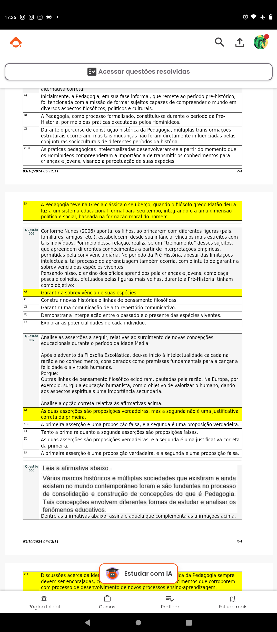 17:35 Acessar questões resolvidas A) Inicialmente, a Pedagogia, em sua fase informal, que remete ao período pré-histórico, foi tencionada com a missão de formar sujeitos capazes de compreender o mundo em diversos aspectos filosóficos, políticos e B) A Pedagogia, como processo formalizado, constituiu-se durante período da Pré- História, por meio das práticas executadas pelos Hominídeos. C) Durante o percurso de construção histórica da Pedagogia, múltiplas transformações estruturais ocorreram, mas tais mudanças não foram diretamente influenciadas pelas conjunturas socioculturais de diferentes períodos da história. x D) As práticas pedagógicas intelectualizadas desenvolveram-se a partir do momento que os Hominídeos compreenderam a importância de transmitir os conhecimentos para crianças e jovens, visando a perpetuação de suas espécies 03/10/2024 06:12:11 2/4 E) A Pedagogia teve na Grécia clássica o seu berço, quando o filósofo grego Platão deu a luz a um sistema educacional formal para seu tempo, integrando-o a uma dimensão política e social, baseada na formação moral do homem. Questão Conforme Nunes (2006) aponta, os filhos, ao brincarem com diferentes figuras (pais, 006 familiares, amigos, etc.), estabelecem, desde sua infância, vínculos mais estreitos com tais indivíduos. Por meio dessa relação, realiza-se um "treinamento" desses sujeitos, que apreendem diferentes conhecimentos a partir de interpretações empíricas, permitidas pela convivência diária. No período da Pré-História, apesar das limitações intelectuais, tal processo de aprendizagem também ocorria, com o intuito de garantir a sobrevivência das espécies viventes. Pensando nisso, o ensino dos ofícios aprendidos pela crianças e jovens, como caça, pesca e colheita, efetuados pelas figuras mais velhas, durante a Pré-História, tinham como objetivo: A) Garantir a sobrevivência de suas espécies. x B) Construir novas histórias e linhas de pensamento C) Garantir uma comunicação de alto repertório comunicativo. D) Demonstrar a interpelação entre o passado e o presente das espécies viventes. Explorar as potencialidades de cada indivíduo. Questão Analise as asserções a seguir, relativas ao surgimento de novas concepções 007 educacionais durante o período da Idade Média. Após o advento da Filosofia Escolástica, deu-se início à intelectualidade calcada na razão e no conhecimento, considerados como premissas fundamentais para alcançar a felicidade e a virtude humanas. Porque: Outras linhas de pensamento filosófico eclodiram, pautadas pela razão. Na Europa, por exemplo, surgiu a educação humanista, com o objetivo de valorizar humano, dando aos aspectos espirituais uma importância secundária. Analise a opção correta relativa às afirmativas acima. A) As duas asserções são proposições verdadeiras, mas a segunda não é uma justificativa correta da primeira. A primeira asserção é uma proposição falsa, e a segunda é uma proposição verdadeira. Tanto a primeira quanto a segunda asserções são proposições D) As duas asserções são proposições verdadeiras, e a segunda é uma justificativa correta da primeira. E) A primeira asserção é uma proposição verdadeira, e a segunda é uma proposição falsa. Questão Leia a afirmativa abaixo. 008 Vários marcos históricos e múltiplas sociedades que existiram e ainda existem no mundo contemporâneo foram e são fundantes no processo de consolidação e construção de concepções do que é Pedagogia. Tais concepções envolvem diferentes formas de estudar e analisar os fenômenos educativos. Dentre as afirmativas abaixo, assinale aquela que complementa as afirmações 03/10/2024 06:12:11 3/4 Discussões acerca da ider Estudar com IA ica da Pedagogia sempre devem ser encorajadas, cimentos que corroborem com processo de desenvolvimento de novos processos ensino-aprendizagem. Página Inicial Cursos Praticar Estude mais