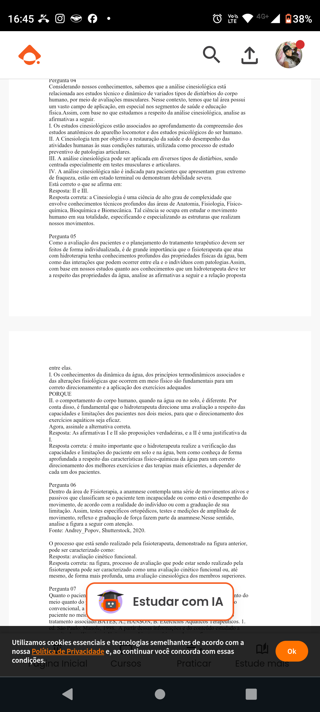 16:45 4G+ LTE 38% Pergunta 04 Considerando nossos conhecimentos. sabemos que a análise cinesiológica está relacionada aos estudos técnico e dinâmico de variados tipos de distúrbios do corpo por meio de avaliações musculares. Nesse contexto, temos que tal área possui um vasto campo de aplicação, em especial nos segmentos de saúde e educação com base no que estudamos a respeito da análise cinesiológica, analise as afirmativas a seguir. I. Os estudos cinesiológicos estão associados ao aprofundamento da compreensão dos estudos anatômicos do aparelho locomotor e dos estudos psicológicos do ser A Cinesiologia tem por objetivo a restauração da saúde e do desempenho das atividades humanas às suas condições naturais, utilizada como processo de estudo preventivo de patologias III. A análise cinesiológica pode ser aplicada em diversos tipos de sendo centrada especialmente em testes musculares e articulares. IV. A análise cinesiológica não é indicada para pacientes que apresentam grau extremo de fraqueza, estão em estado terminal ou demonstram debilidade severa. Está correto o que se afirma em: Resposta: II e III. Resposta correta: a Cinesiologia é uma ciência de alto grau de complexidade que envolve conhecimentos técnicos profundos das áreas de Anatomia, Fisiologia, Físico- química, Bioquímica e Tal ciência se ocupa em estudar o movimento humano em sua totalidade, especificando e especializando as estruturas que realizam nossos movimentos. Pergunta 05 Como a avaliação dos pacientes e o planejamento do tratamento terapêutico devem ser feitos de forma é de grande importância que o fisioterapeuta que atua com hidroterapia tenha conhecimentos profundos das propriedades físicas da água, bem como das interações que podem ocorrer entre ela e o indivíduos com com base em nossos estudos quanto aos conhecimentos que um hidroterapeuta deve ter a respeito das propriedades da água, analise as afirmativas a seguir e a relação proposta entre elas. I. Os conhecimentos da dinâmica da água, dos princípios termodinâmicos associados e das alterações fisiológicas que ocorrem em meio físico são fundamentais para um correto direcionamento e a aplicação dos exercícios adequados PORQUE II. o comportamento do corpo quando na água ou no solo, é diferente. Por conta disso, é fundamental que o hidroterapeuta direcione uma avaliação a respeito das capacidades e limitações dos pacientes nos dois para que o direcionamento dos exercícios aquáticos seja eficaz. Agora, assinale a alternativa correta. Resposta: As afirmativas I e II são proposições verdadeiras, e a II é uma justificativa da I. Resposta correta: é muito importante que o hidroterapeuta realize a verificação das capacidades e limitações do paciente em solo e na água, bem como conheça de forma aprofundada a respeito das características da água para um correto direcionamento dos melhores exercícios e das terapias mais eficientes, a depender de cada um dos pacientes. Pergunta 06 Dentro da área de Fisioterapia, a anamnese contempla uma série de movimentos ativos e passivos que classificam se o paciente tem incapacidade ou como está o desempenho do movimento, de acordo com a realidade do indivíduo ou com a graduação de sua limitação. Assim. testes específicos ortopédicos, testes e medições de amplitude de reflexo e graduação de força fazem parte da Nesse analise a figura a seguir com atenção. Fonte: Andrey Popov, 2020. processo que está sendo realizado pela fisioterapeuta, demonstrado na figura anterior. pode ser caracterizado como: Resposta: avaliação cinético funcional. Resposta correta: na figura, processo de avaliação que pode estar sendo realizado pela fisioterapeuta pode ser caracterizado como uma avaliação cinético funcional ou, até mesmo. de forma mais profunda, uma avaliação cinesiológica dos membros Pergunta 07 Quanto o pacien Into do meio quanto do Estudar com IA convencional. a paciente no meio tratamento HANSON, B. Aquaticos Terapeuticos. 1. Utilizamos cookies essenciais e tecnologias semelhantes de acordo com a nossa Política de Privacidade e, ao continuar você concorda com essas Ok condições. Inicial Cursos Praticar Estude