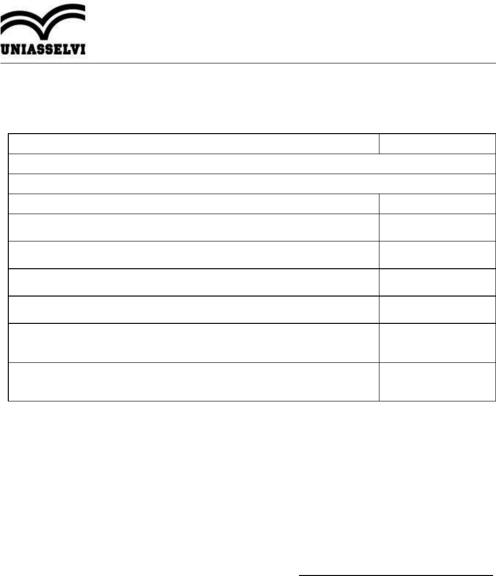 CENTRO UNIVERSITÁRIO LEONARDO DA VINCI Portaria Ministerial nº 499, de 12/06/2013, publicada no DOU em 13/06/2013, seção 1, página 25. R. Dr. Pedrinho, N 77 - Bairro Rio Morto - CEP 89084-405 - Indaial/SC Site: uniasselvi.com.br FICHA 3 - AVALIAÇÃO DO PAPER COMPLETO DO TCC II É PREENCHIDA PELO(A) PROFESSOR(A) ORIENTADOR(A) CURSO: ACADÊMICO: LUCAS DE SOUSA DE ORONHA TURMA: FLC15972ECE PROFESSOR(A) ORIENTADOR(A): SHAIANA PADILHA TEMA: Uso da Fibra de Vidro na Construção Civil ASPECTOS A CONSIDERAR NOTA 1- Relevância da pesquisa (âmbito social, pessoal, educacional, entre outros). 2- Consistência Teórica (cientificidade do paper). 3- Elementos Textuais (Introdução/ Desenvolvimento /Considerações Finais apresentam os propósitos de cada elemento). 4- Clareza e correção de linguagem (fluência do texto; erros ortográficos; coerência do texto; preocupação com a figura do leitor). 5- Apresentação formal (normas de produção acadêmica, utilização correta das normas da ABNT: formatação, citações, referências, entre outros). NOTA FINAL (Atribuir nota de 0 a 10 a cada item. A nota final é o resultado da soma das notas obtidas nos cinco aspectos considerados, dividido por cinco.). Data: 28/11/2024 Assinatura do Professor Orientador