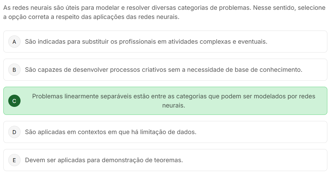 As redes neurais são úteis para modelar e resolver diversas categorias de problemas. Nesse sentido, selecione a opção correta a respeito das aplicações das redes neurais. A São indicadas para substituir os profissionais em atividades complexas e eventuais. B São capazes de desenvolver processos criativos sem a necessidade de base de conhecimento. Problemas linearmente separáveis estão entre as categorias que podem ser modelados por redes C neurais. D São aplicadas em contextos em que há limitação de dados. E Devem ser aplicadas para demonstração de teoremas.