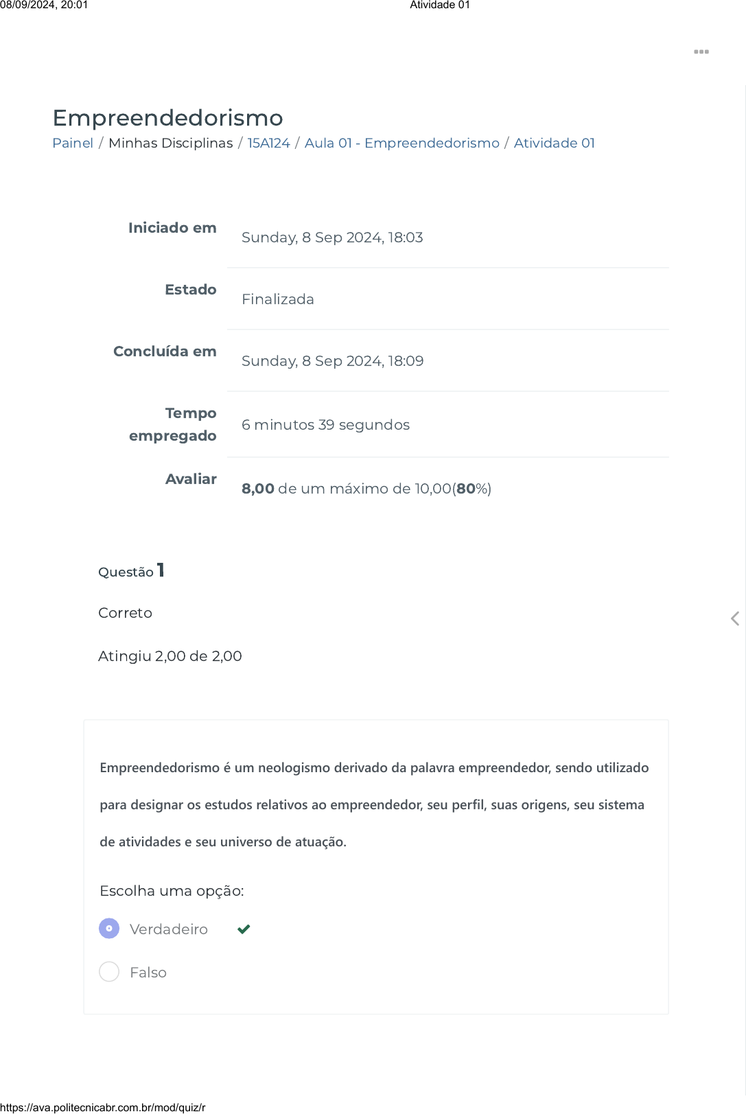 <p>Painel / Minhas Disciplinas / 15A124 / Aula 01 - Empreendedorismo / Atividade 01</p><p>Empreendedorismo</p><p>Iniciado em</p><p>Sunday, 8 Sep 2024, 18:03</p><p>Estado</p><p>Finalizada</p><p>Concluída em</p><p>Sunday, 8 Sep 2024, 18:09</p><p>Tempo</p><p>empregado</p><p>6 minutos 39 segundos</p><p>Avaliar</p><p>8,00 de um máximo de 10,00(80%)</p><p>Questão 1</p><p>Correto</p><p>Atingiu 2,00 de 2,00</p><p>Empreendedorismo é um neologismo derivado da palavra empreendedor, sendo utilizado</p><p>para designar os estudos relativos ao empreendedor, seu perfil, suas origens, seu sistema</p><p>de atividades e seu universo de atuação.</p><p>Escolha uma opção:</p><p>Verdadeiro </p><p>Falso</p><p></p><p></p><p>08/09/2024, 20:01 Atividade 01</p><p>https://ava.politecnicabr.com.br/mod/quiz/review.php?attempt=7211270 1/5</p><p>https://ava.politecnicabr.com.br/my/</p><p>https://ava.politecnicabr.com.br/my/</p><p>https://ava.politecnicabr.com.br/course/view.php?id=883</p><p>https://ava.politecnicabr.com.br/course/view.php?id=883#section-2</p><p>https://ava.politecnicabr.com.br/mod/quiz/view.php?id=29022</p><p>https://ava.politecnicabr.com.br/</p><p>Questão 2</p><p>Correto</p><p>Atingiu 2,00 de 2,00</p><p>Atualmente, o empreendedorismo é visto como um ramo da</p><p>administração de empresas e, no Primeiro Mundo, as escolas de</p><p>administração não conseguiram ter um setor, grupo ou área de</p><p>pesquisa em empreendedorismo. Isso só ser dar atualmente.</p><p>Escolha uma opção:</p><p>Questão 3</p><p>Incorreto</p><p>Atingiu 0,00 de 2,00</p><p>O termo empreendedor foi associado ao homem de negócios:</p><p>Escolha uma opção:</p><p>Verdadeiro</p><p>Falso </p><p>a. Lucrativo</p><p>b. diferente</p><p>c. bem-sucedido</p><p>d. Inovador </p><p></p><p></p><p>08/09/2024, 20:01 Atividade 01</p><p>https://ava.politecnicabr.com.br/mod/quiz/review.php?attempt=7211270 2/5</p><p>https://ava.politecnicabr.com.br/</p><p>Questão 4</p><p>Correto</p><p>Atingiu 2,00 de 2,00</p><p>Vesper (1980), propôs uma classi�cação dos empreendedores</p><p>baseada nos diversos modos de operação, chegando a quantos</p><p>tipos possíveis?</p><p>Escolha uma opção:</p><p>a. 11 </p><p>b. 9</p><p>c. 7</p><p>d. 10</p><p>e. 13</p><p></p><p></p><p>08/09/2024, 20:01 Atividade 01</p><p>https://ava.politecnicabr.com.br/mod/quiz/review.php?attempt=7211270 3/5</p><p>https://ava.politecnicabr.com.br/</p><p>Questão 5</p><p>Correto</p><p>Atingiu 2,00 de 2,00</p><p>De forma sintética, podemos agrupar as teorias ou escolas do</p><p>empreendedorismo em quatro grandes correntes,quais são elas?</p><p>Escolha uma opção:</p><p>a. Escola de desenvolvimento econômico, sociais, biológica e</p><p>psicológica</p><p>b. Escola de desenvolvimento econômico, sociais, família e</p><p>étnicos</p><p>c. Escola biológica, sociológica, econômica e psicológica </p><p>Entre em Contato</p><p>https://www.politecnicabr.com.br</p><p>0800 084 2627</p><p>0800 084 2627</p><p></p><p></p><p></p><p></p><p>Links Úteis</p><p>Dicas da nossa Diretora Acadêmica</p><p>Planner de Estudos</p><p>Declaração de Matrícula</p><p>Orientações do AVA</p><p>Abertura de Ticket</p><p>Fale com o Tutor</p><p>Cronograma de Estudos</p><p>Manual de Estágio</p><p>Manual de Competência</p><p></p><p></p><p>08/09/2024, 20:01 Atividade 01</p><p>https://ava.politecnicabr.com.br/mod/quiz/review.php?attempt=7211270 4/5</p><p>https://www.politecnicabr.com.br/</p><p>https://soundcloud.com/user-501638417/sets/escola-politecnica-brasileira</p><p>https://soundcloud.com/user-501638417/sets/escola-politecnica-brasileira</p><p>https://storage.googleapis.com/sirius-pubstore/semestre_plannerdeestudo%20poli.pdf</p><p>https://storage.googleapis.com/sirius-pubstore/semestre_plannerdeestudo%20poli.pdf</p><p>https://storage.googleapis.com/sirius-pubstore/declaracao_matricula.pdf</p><p>https://storage.googleapis.com/sirius-pubstore/declaracao_matricula.pdf</p><p>https://storage.googleapis.com/sirius-pubstore/orientacoes_ava.pdf</p><p>https://storage.googleapis.com/sirius-pubstore/orientacoes_ava.pdf</p><p>https://storage.googleapis.com/sirius-pubstore/abertura_ticket.pdf</p><p>https://storage.googleapis.com/sirius-pubstore/abertura_ticket.pdf</p><p>https://storage.googleapis.com/sirius-pubstore/fale_com_tutor.pdf</p><p>https://storage.googleapis.com/sirius-pubstore/fale_com_tutor.pdf</p><p>https://storage.googleapis.com/sirius-pubstore/cronograma_estudos.pdf</p><p>https://storage.googleapis.com/sirius-pubstore/cronograma_estudos.pdf</p><p>https://storage.googleapis.com/sirius-pubstore/manual_estagio.pdf</p><p>https://storage.googleapis.com/sirius-pubstore/manual_estagio.pdf</p><p>https://storage.googleapis.com/sirius-pubstore/manual_competencia.pdf</p><p>https://storage.googleapis.com/sirius-pubstore/manual_competencia.pdf</p><p>https://ava.politecnicabr.com.br/</p><p>© 2022 - Escola Politécnica Brasileira</p><p>Siga-nos nas redes sociais</p><p> </p><p></p><p></p><p>08/09/2024, 20:01 Atividade 01</p><p>https://ava.politecnicabr.com.br/mod/quiz/review.php?attempt=7211270 5/5</p><p>https://ava.politecnicabr.com.br/mod/quiz/0</p><p>https://ava.politecnicabr.com.br/mod/quiz/0</p><p>https://www.facebook.com/politecnicabr</p><p>https://www.instagram.com/politecnicabr_oficial</p><p>https://ava.politecnicabr.com.br/</p>