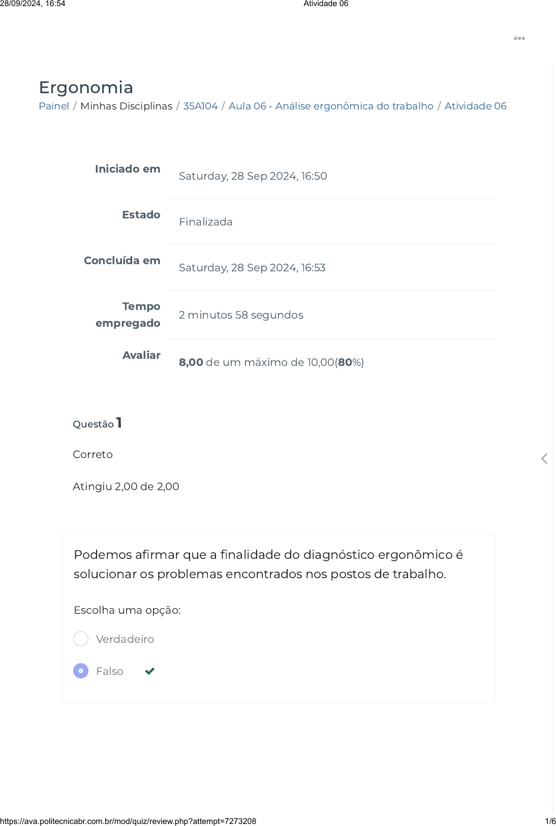 <p>Painel / Minhas Disciplinas / 35A104 / Aula 06 - Análise ergonômica do trabalho / Atividade 06</p><p>Ergonomia</p><p>Iniciado em</p><p>Saturday, 28 Sep 2024, 16:50</p><p>Estado</p><p>Finalizada</p><p>Concluída em</p><p>Saturday, 28 Sep 2024, 16:53</p><p>Tempo</p><p>empregado</p><p>2 minutos 58 segundos</p><p>Avaliar</p><p>8,00 de um máximo de 10,00(80%)</p><p>Questão 1</p><p>Correto</p><p>Atingiu 2,00 de 2,00</p><p>Podemos a�rmar que a �nalidade do diagnóstico ergonômico é</p><p>solucionar os problemas encontrados nos postos de trabalho.</p><p>Escolha uma opção:</p><p>Verdadeiro</p><p>Falso </p><p></p><p></p><p>28/09/2024, 16:54 Atividade 06</p><p>https://ava.politecnicabr.com.br/mod/quiz/review.php?attempt=7273208 1/6</p><p>https://ava.politecnicabr.com.br/my/</p><p>https://ava.politecnicabr.com.br/my/</p><p>https://ava.politecnicabr.com.br/course/view.php?id=1026</p><p>https://ava.politecnicabr.com.br/course/view.php?id=1026#section-7</p><p>https://ava.politecnicabr.com.br/mod/quiz/view.php?id=34040</p><p>https://ava.politecnicabr.com.br/</p><p>Questão 2</p><p>Correto</p><p>Atingiu 2,00 de 2,00</p><p>É uma das formas de intervenção ergonômica na esfera do</p><p>trabalho e trata de aspectos físicos, psicológicos e �siológicos que</p><p>norteiam as atividades desempenhadas pelo trabalhador no</p><p>ambiente produtivo.</p><p>Escolha uma opção:</p><p>a. ETE</p><p>b. AET </p><p>c. EMT</p><p>d. ETA</p><p></p><p></p><p>28/09/2024, 16:54 Atividade 06</p><p>https://ava.politecnicabr.com.br/mod/quiz/review.php?attempt=7273208 2/6</p><p>https://ava.politecnicabr.com.br/</p><p>Questão 3</p><p>Incorreto</p><p>Atingiu 0,00 de 2,00</p><p>Entre as premissas da Analise Ergonômica do Trabalho, destacam-</p><p>se, exceto a opção:</p><p>Escolha uma opção:</p><p>a. Emitir laudos.</p><p>b. Buscar soluções de melhorias, oferecendo indicações de</p><p>adequação em diversos âmbito.</p><p>c. Analisar os postos de trabalho e o ambiente no qual as tarefas</p><p>são cumpridas.</p><p></p><p>d. Compreender a situação de trabalho e suas implicações.</p><p>e. Efetuar um diagnóstico para investigar as circunstâncias mais</p><p>preocupantes.</p><p></p><p></p><p>28/09/2024, 16:54 Atividade 06</p><p>https://ava.politecnicabr.com.br/mod/quiz/review.php?attempt=7273208 3/6</p><p>https://ava.politecnicabr.com.br/</p><p>Questão 4</p><p>Correto</p><p>Atingiu 2,00 de 2,00</p><p>Com relação a divisão da análise ergonômica do trabalho, marque</p><p>a opção correta em relação a FASE e seus OBJETIVOS.</p><p>Escolha uma opção:</p><p>a. Análise da tarefa - Estudar as condições de trabalho nas quais</p><p>o trabalhador exerce suas atividades.</p><p></p><p>b. Análise da demanda - Estudar o comportamento humano no</p><p>ambiente de trabalho.</p><p>c. Análise da atividade - De�nir os problemas a serem resolvidos.</p><p>d. Nenhuma das Respostas Anteriores</p><p></p><p></p><p>28/09/2024, 16:54 Atividade 06</p><p>https://ava.politecnicabr.com.br/mod/quiz/review.php?attempt=7273208 4/6</p><p>https://ava.politecnicabr.com.br/</p><p>Questão 5</p><p>Correto</p><p>Atingiu 2,00 de 2,00</p><p>Antes de efetuar ações como a aquisição de equipamentos,</p><p>acessórios e móveis, deve ser iniciada a análise da tarefa, cuja</p><p>efetivação ocorre em três níveis. Marque a opção que não</p><p>corresponde a um dos três níveis.</p><p>Escolha uma opção:</p><p>a. Descrição das ações, em nível mais detalhado.</p><p>b. Descrição da tarefa, em nível global.</p><p>c. Revisão crítica para reparar os eventuais problemas.</p><p>d. Origem da demanda, se ela é real e formal. </p><p>Entre em Contato</p><p>https://www.politecnicabr.com.br</p><p>0800 084 2627</p><p>0800 084 2627</p><p></p><p></p><p></p><p></p><p>Links Úteis</p><p>Dicas da nossa Diretora Acadêmica</p><p>Planner de Estudos</p><p>Declaração de Matrícula</p><p>Orientações do AVA</p><p>Abertura de Ticket</p><p>Fale com o Tutor</p><p>Cronograma de Estudos</p><p>Manual de Estágio</p><p>Manual de Competência</p><p>Siga-nos nas redes sociais</p><p></p><p></p><p>28/09/2024, 16:54 Atividade 06</p><p>https://ava.politecnicabr.com.br/mod/quiz/review.php?attempt=7273208 5/6</p><p>https://www.politecnicabr.com.br/</p><p>https://soundcloud.com/user-501638417/sets/escola-politecnica-brasileira</p><p>https://soundcloud.com/user-501638417/sets/escola-politecnica-brasileira</p><p>https://storage.googleapis.com/sirius-pubstore/semestre_plannerdeestudo%20poli.pdf</p><p>https://storage.googleapis.com/sirius-pubstore/semestre_plannerdeestudo%20poli.pdf</p><p>https://storage.googleapis.com/sirius-pubstore/declaracao_matricula.pdf</p><p>https://storage.googleapis.com/sirius-pubstore/declaracao_matricula.pdf</p><p>https://storage.googleapis.com/sirius-pubstore/orientacoes_ava.pdf</p><p>https://storage.googleapis.com/sirius-pubstore/orientacoes_ava.pdf</p><p>https://storage.googleapis.com/sirius-pubstore/abertura_ticket.pdf</p><p>https://storage.googleapis.com/sirius-pubstore/abertura_ticket.pdf</p><p>https://storage.googleapis.com/sirius-pubstore/fale_com_tutor.pdf</p><p>https://storage.googleapis.com/sirius-pubstore/fale_com_tutor.pdf</p><p>https://storage.googleapis.com/sirius-pubstore/cronograma_estudos.pdf</p><p>https://storage.googleapis.com/sirius-pubstore/cronograma_estudos.pdf</p><p>https://storage.googleapis.com/sirius-pubstore/manual_estagio.pdf</p><p>https://storage.googleapis.com/sirius-pubstore/manual_estagio.pdf</p><p>https://storage.googleapis.com/sirius-pubstore/manual_competencia.pdf</p><p>https://storage.googleapis.com/sirius-pubstore/manual_competencia.pdf</p><p>https://ava.politecnicabr.com.br/</p><p>© 2022 - Escola Politécnica Brasileira</p><p> </p><p></p><p></p><p>28/09/2024, 16:54 Atividade 06</p><p>https://ava.politecnicabr.com.br/mod/quiz/review.php?attempt=7273208 6/6</p><p>https://ava.politecnicabr.com.br/mod/quiz/0</p><p>https://ava.politecnicabr.com.br/mod/quiz/0</p><p>https://www.facebook.com/
