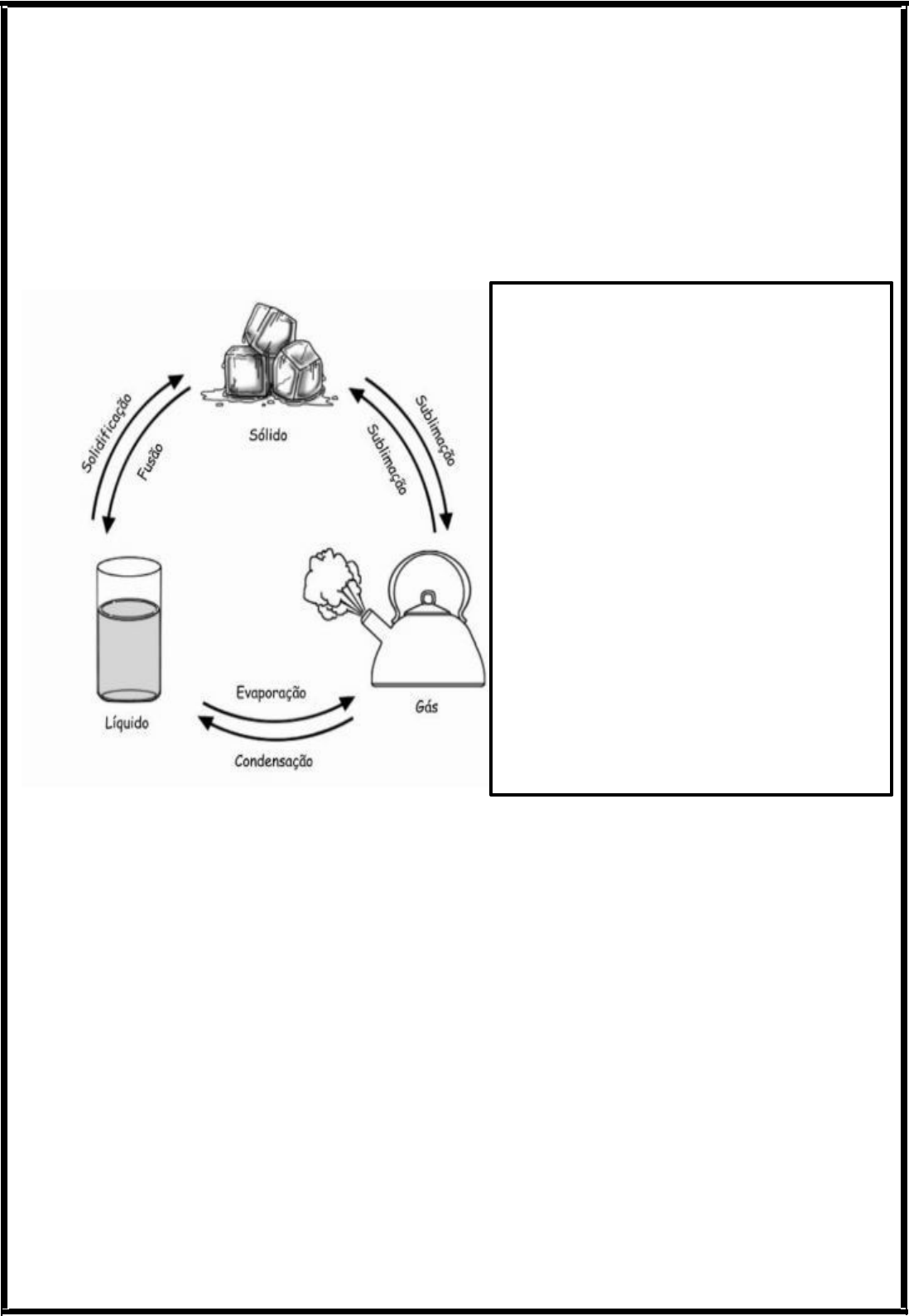 Aula de Ciências 9º Anos Professora: Adriana Estados Físicos da Matéria Os estados físicos da matéria correspondem às formas pela qual a matéria pode se apresentar na natureza. Esses estados são definidos de acordo com a pressão, temperatura e, sobretudo, pelas forças que atuam nas moléculas. A matéria, constituída de pequenas partículas (átomos e moléculas), corresponde a tudo aquilo que possui massa e que ocupa determinado lugar no espaço. Podendo se apresentar em três estados: sólido líquido e gasoso. Estados Sólido, Líquido e Gasoso. No estado sólido as moléculas que compõem a matéria permanecem fortemente unidas e possuem forma própria e volume constante, por exemplo, o tronco de uma árvore ou o gelo (água em estado sólido). No estado líquido, as moléculas já apresentam uma menor união e maior agitação, de forma que apresentam forma variável e volume constante, por exemplo, a água em determinado recipiente. Já no estado gasoso, as partículas que formam a matéria apresentam intensa movimentação, pois as forças de coesão são pouco intensas nesse estado. Neste estado, a substância apresenta forma e volume variáveis. Sendo assim, no estado gasoso, a matéria terá forma segundo o recipiente que se encontra, caso contrário ela permanecerá disforme, tal qual o ar que respiramos e não vemos. Para exemplificar, podemos pensar no botijão de gás, o qual apresenta gás comprimido que adquiriu determinada forma. Mudanças de Estados Físicos As mudanças de estado físico dependem basicamente da quantidade de energia recebida ou perdida pela substância. Existem essencialmente cinco processos de mudanças de estado físico: Fusão: passagem do estado sólido para o estado líquido por meio do aquecimento. Por exemplo, um cubo de gelo que fora do congelador vai derretendo e se transformando em água. Vaporização: passagem do estado líquido para o estado gasoso que é obtido de três maneiras: calefação (aquecedor), ebulição (água fervendo) e evaporação (roupas secando no varal). Liquefação ou Condensação: passagem do estado gasoso para o estado líquido por meio do resfriamento, por exemplo, a formação do orvalho. Solidificação: passagem do estado líquido para o estado sólido, ou seja, é o processo inverso à fusão, que ocorre por meio do arrefecimento, por exemplo, água líquida transformada em gelo. Sublimação: passagem do estado sólido para o estado gasoso e vice-versa (sem passagem pelo estado líquido) e pode ocorrer pelo aquecimento ou arrefecimento da matéria, por exemplo, gelo seco (dióxido de carbono solidificado). Nome: ______________________________________ Sala: ____________ Data: _____________________ Responda as questões de acordo com o texto: 1. Como é o processo de solidificação? ________________________________________________________________________________________________________________________________________________________________________________________________________________________________________________________________________________________________________________________________________________________________________________________________________________________________________________________ 2. Quais são os três estados físicos da matéria? Cite exemplos. ________________________________________________________________________________________________________________________________________________________________________________________________________________________________________________________________________________________________________________________________________________________________________________________________________________________________________________________ 3. Complete os nomes: 1.________________________________________________ 2.________________________________________________ 3.________________________________________________ 4.________________________________________________ 5.________________________________________________ 4. Como é o processo de fusão? ________________________________________________________________________________________________________________________________________________________________________________________________________________________________________________________________________________________________________________________________________________________________ 5. Como são as moléculas no estado liquido? ________________________________________________________________________________________________________________________________________________________________________________________________________________________________________________________________________________________________________________________________________________________________________________________________________________________________________________________ image1.jpeg image2.png