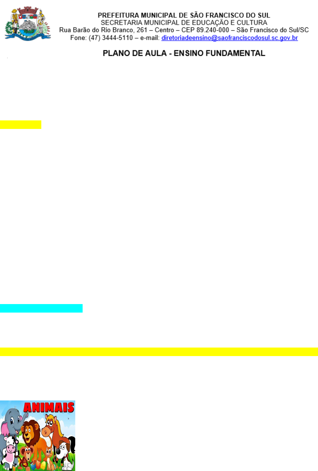 Professor(a): Luana Wistuba Componente(s) Curricular(es): CIÊNCIAS Série: 3 ° ano SETEMBRO UNIDADE TEMÁTICA: Vida e evolução OBJETOS DE CONHECIMENTO: Características e desenvolvimento dos animais HABILIDADES: (EF03CI04) Identificar características sobre o modo de vida (o que comem, como se reproduzem, como se deslocam etc.) dos animais mais comuns no ambiente próximo. (EF03CI05) Descrever e comunicar as alterações que ocorrem desde o nascimento em animais de diferentes meios terrestres ou aquáticos, inclusive o homem. (EF03CI06) Comparar alguns animais e organizar grupos com base em características externas comuns (presença de penas, pelos, escamas, bico, garras, antenas, patas etc.). SEQUENCIA DIDÁTICA: Atividades permanentes: Cabeçalho com o nome da cidade, data, dia da semana e agenda do dia. SEMANA 1 - Vamos ver sobre as características dos animais. OS ANIMAIS OS ANIMAIS ASSIM COMO AS PLANTAS E AS PESSOAS SÃO SERES VIVOS. ELES NASCEM, CRESCEM, PODEM SE REPRODUZIR E MORREM. CADA ANIMAL VIVE NUM LUGAR CARACTERÍSTICO, É O SEU HABITAT. EXISTEM ANIMAIS QUE VIVEM NA TERRA, OUTROS NA ÁGUA E OUTROS QUE PASSAM A MAIOR PARTE DO TEMPO NO AR. TERRESTRES: SÃO AQUELES QUE VIVEM NA TERRA. AQUÁTICOS: SÃO AQUELES QUE VIVEM NOS MARES, RIOS E OCEANOS. AÉREOS: SÃO AQUELES QUE PODEM VOAR. RELEMBRANDO ALIMENTAÇÃO DOS ANIMAIS: VÍDEO: “O QUE OS ANIMAIS COMEM” https://www.youtube.com/watch?v=8FPLm8iMw1g 01) Responda: A) O que são animais carnívoros? R= ______________________________________________________________ B) O que são animais herbívoros? R= ______________________________________________________________ C) O que são animais onívoros? R= _______________________________________________________________ SEMANA 2 - Introdução as características dos animais, com texto, vídeo e explicação. -AS CARACTERÍSTICAS DOS ANIMAIS NO PRIMEIRO MOMENTO VAMOS ASSISTIR O VIDEO EXPLICATIVO QUE VAI FALAR DOS ANIMAIS. - O corpo dos animais - https://youtu.be/Ahdl2pF6_4s - Revestimento do corpo dos animais - https://youtu.be/3uzhJzM1_9A 1 Como é coberto o corpo dos animais? Existem diversos tipos de cobertura corporal. Elas estão adaptadas aos ambientes em que os animais vivem e desempenham funções específicas, necessárias à sobrevivência de cada espécie. PELE NUA PELOS PENAS ESCAMAS DE PEIXE ESCAMAS DE RÉPTEIS CARAPAÇA Funções do revestimento do corpo dos animais PELE NUA - Não possui nenhum tipo de revestimento. A pele nua é úmida, viscosa e fina. Para mantê-la sempre assim esses animais vivem junto à água. Ajuda na respiração, na camuflagem e na proteção contra predadores. PELOS – conservam a temperatura, protegem e camuflam. PENAS – impermeabilizam, auxiliam no voo e servem para atrair o parceiro. ESCAMAS DE PEIXES–protegem contra parasitas e objetos perfurantes. Auxiliam na locomoção. ESCAMAS DE RÉPTEIS- são feitas geralmente de queratina. Têm a função de proteger e facilitar o deslocamento e impedem a perda de água e desidratação. CARAPAÇAS- funcionam como uma armadura, protegendo de choques, de predadores e da desidratação. Disponível em:https://novaescola.org.br/plano-de-aula/2192/como-e-coberto-o-corpo-dos-animais Adaptado. https://pt.khanacademy.org/science/3-ano/vida-e-evolucao-3-ano/caracteristicas-dos-animais/a/a-cobertura-do-corpo-dos-animais-adaptado Secretaria Municipal Da Educação Secretária: Marilene Silva Santana Pimenta Superintendente do Ensino Fundamental: Ivan Amorim Atividade elaborada pela equipe de professores da SEMED para o Programa de Estudos Remotos - Estuda Betim. 3º ANO Componente Curricular:Ciências 3ª Postagem ALUNO: Querido (a) aluno (a), esta semana daremos continuidade aos estudos sobre os animais. Faça as atividades com carinho e não deixe de aproveitar o tempo com sua família. C 2 Atividades 1- Descubra o nome do animal e registre nos quadrinhos. a) Ele tem pelo, é doméstico e é chamado de melhor amigo do homem. b) É um animal que vive nos rios, lagos e oceanos e possui escamas. c) Possui o corpo coberto de penas, bota ovo e seu filhote é o pintinho. d) É um animal que tem bico, possui penas, voa e tem fama de falador. 2- Observe a ficha dos animais e marque a opção correta para cada um. ANIMAL COMO NASCEM OS FILHOTES REVESTIMENTO DO CORPO ALIMENTAÇÃO VACA ( ) do ovo. ( ) da barriga da mãe. ( ) pelos. ( ) escamas. ( ) penas. ( ) herbívoro. ( ) carnívoro. ( ) onívoro. CORUJA ( ) do ovo. ( ) da barriga da mãe. ( ) pelos. ( ) escamas. ( ) penas. ( ) herbívoro. ( ) carnívoro. ( ) onívoro. GAMBÁ ( ) do ovo. ( ) da barriga da mãe. ( ) pelos. ( ) escamas. ( ) penas ( ) herbívoro. ( ) carnívoro. ( ) onívoro. 3 Semana - Continuação de atividades sobre animais. ENCONTRE NO CAÇA-PALAVRAS. 4 SEMANA - Hoje vamos estudar domésticos e silvestres. image4.jpeg image5.png image6.jpeg image7.jpeg image8.png image9.png image10.png image11.jpeg image12.jpeg image13.jpeg image14.jpeg image15.jpeg image16.jpeg image40.jpeg image50.png image60.jpeg image70.jpeg image80.png image90.png image100.png image110.jpeg image120.jpeg image130.jpeg image140.jpeg image150.jpeg image160.jpeg image17.jpeg image18.jpeg image19.jpeg image20.jpeg image1.png image21.jpeg image22.jpeg image20.png image23.jpeg image24.jpeg image25.png image26.png image27.png image2.png image3.png