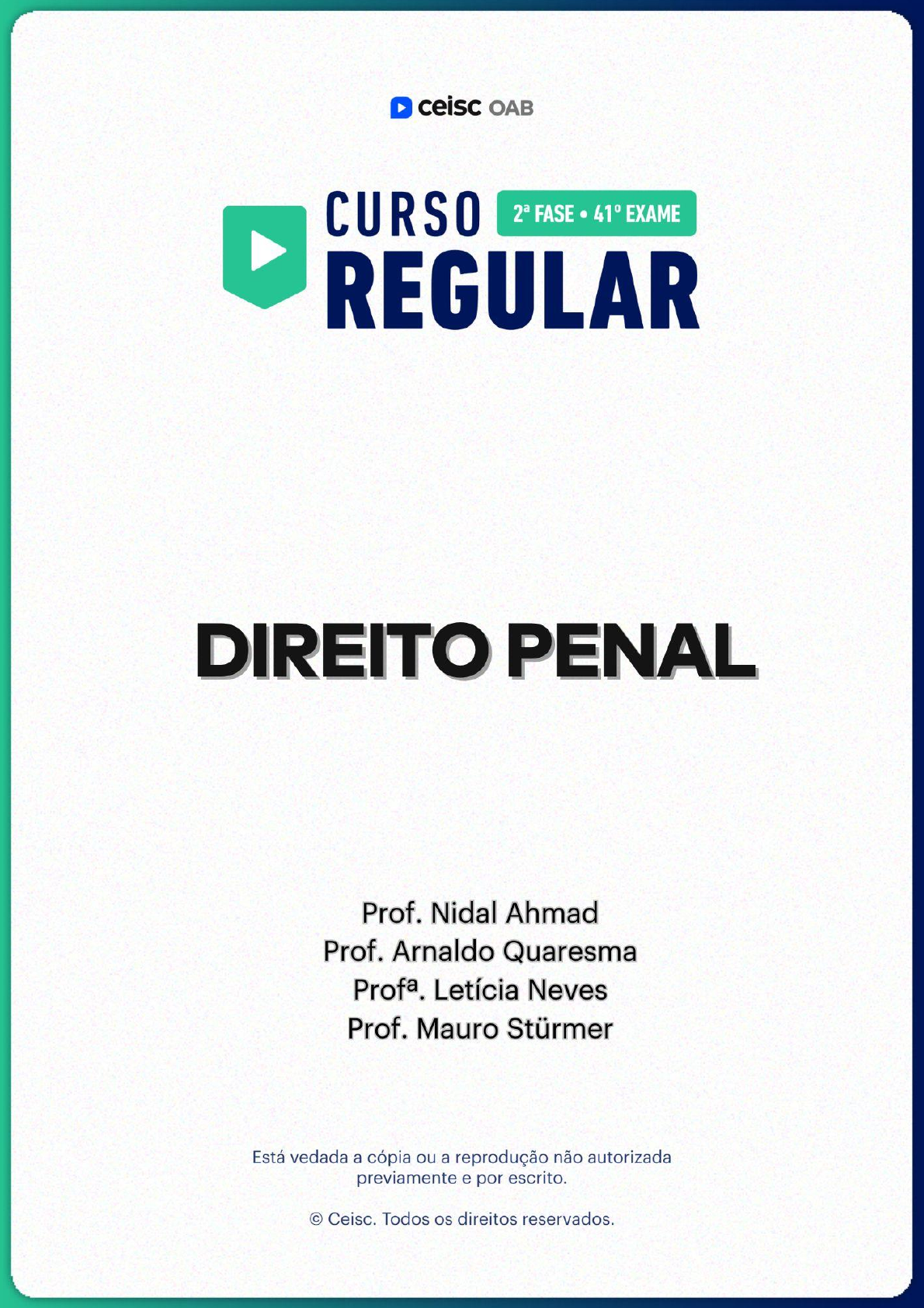 1 2 Olá, Alunos! Sejam bem-vindos! Esse material foi elaborado com muito carinho para que você possa absorver da melhor forma possível os conteúdos e se preparar para a sua 2ª fase, e deve ser utilizado de forma complementar junto com as aulas. Qualquer dúvida ficamos à disposição via plataforma “pergunte ao professor”. Lembre-se: o seu sonho também é o nosso! Bons estudos! Estamos com você até a sua aprovação! Com carinho, Equipe Ceisc ♥ 3 2ª FASE OAB | PENAL | 41º EXAME Direito Penal SUMÁRIO Excludente de culpabilidade 1.1. Introdução ......................................................................................................5 1.2. Inimputabilidade .............................................................................................6 1.2.1. Introdução ...................................................................................................6 1.2.1. Da inimputabilidade por doença mental ou desenvolvimento mental incompleto ou retardado ........................................................................................6 1.2.2. Consequências do reconhecimento da inimputabilidade .............................8 1.2.3. Da inimputabilidade por embriaguez proveniente de caso fortuito ou força maior .....................................................................................................................9 1.3. Menoridade penal .........................................................................................10 1.4. Falta de potencial consciência da ilicitude ....................................................11 1.4.1. Introdução .................................................................................................11 1.4.2. Erro de proibição .......................................................................................11 1.4.3. Efeitos: erro de proibição inevitável e evitável ...........................................12 1.4.4. Diferença entre erro de tipo e erro de proibição ........................................14 1.5.1. Introdução .................................................................................................15 15.5.2. Coação moral irresistível .........................................................................15 1.5.3. Obediência hierárquica ..............................................................................16 1.6. Como pode cair ............................................................................................18 Olá, aluno(a). Este material de apoio foi organizado com base nas aulas do curso preparatório para a 2ª Fase do 41º Exame da OAB e deve ser utilizado como um roteiro para as respectivas aulas. Além disso, recomenda-se que o aluno assista as aulas acompanhado da legislação pertinente. Bons estudos, Equipe Ceisc. Atualizado em julho de 2024. 4 5 Excludente de culpabilidade Prof. Nidal Ahmad @prof.nidal 1.1. Introdução Doutrinariamente, a culpabilidade é considerada um juízo de censurabilidade e reprovação social incidente sobre o fato e seu autor, como forma de se verificar a necessidade de aplicação de uma pena. Em outras palavras, quando pratica um fato típico e ilícito, o agente será submetido a um juízo de censura, que incide sobre a manifestação e exteriorização da vontade do agente, a fim de verificar a possibilidade de imposição de uma pena. Conforme a teoria normativa pura, admitida no nosso ordenamento jurídico, os elementos da culpabilidade são: a) a imputabilidade do agente; b) a potencial consciência da ilicitude; c) exigibilidade de conduta diversa. De outro lado, as causas excludentes de culpabilidade consistem na inimputabilidade, falta de potencial consciência de ilicitude e inexigibilidade de conduta diversa. *Para todos verem: esquema. E X C L U D E N T E S D E C U L P A B IL ID A D E INIMPUTABILIDADE Doença mental - art. 26, CP Embriaguez completa e acidental - art. 28, §1º, CP FALTA DE POTENCIAL CONSCIÊNCIA DA ILICITUDE - art. 21, CP ERRO DE PROIBIÇÃO INEXIGIBILIDADE DE CONDUTA DIVERSA Coação moral Irresistível - art. 22, CP Obediêcia Hierárquica - art. 22, CP 6 1.2. Inimputabilidade 1.2.1. Introdução Embora o Código Penal não tenha definido o conceito de imputabilidade, afigura-se possível extrair as suas características a partir da definição das hipóteses de inimputabilidade, previstas nos arts. 26, caput, 27 e 28, § 1º, todos do CP. Para fins penais, pode-se considerar a imputabilidade como sendo a possibilidade de se atribuir a autoria ou responsabilidade por fato criminoso a alguém, maior de dezoito anos e com higidez mental, que revelou ter capacidade de compreensão em relação ao caráter ilícito do fato, bem como de se determinar de acordo com esse entendimento. O Código Penal prevê como causas de inimputabilidade: a) doença mental (CP, art. 26, caput); b) desenvolvimento mental incompleto (CP, arts. 26, caput, e 27); c) desenvolvimento mental retardado (CP, art. 26, caput); d) menoridade (CP, art. 27); e e) embriaguez completa proveniente de caso fortuito ou força maior (CP, art. 28, § 1º). 1.2.1. Da inimputabilidade por doença mental ou desenvolvimento mental incompleto ou retardado A doença mental compreende todas as alterações mentais ou psíquicas aptas a eliminar a capacidade de compreensão do agente, tanto de origem patológica, quanto as toxicológicas, como, por exemplo, a demência senil, psicose traumática, causadas por alcoolismo, psicose maníaco-depressiva, esquizofrenia, loucura, histeria, paranoia etc. Não constitui requisito indispensável que a doença mental seja de caráter permanente, podendo, portanto, ser transitória, desde que, ao tempo da conduta, em decorrência dessa enfermidade mental, o agente não reúna qualquer capacidade de compreensão ou determinação. Isso porque, conforme consta expressamente no art. 26, caput, do CP, a inimputabilidade deve ser verificada no momento da conduta. O crité
