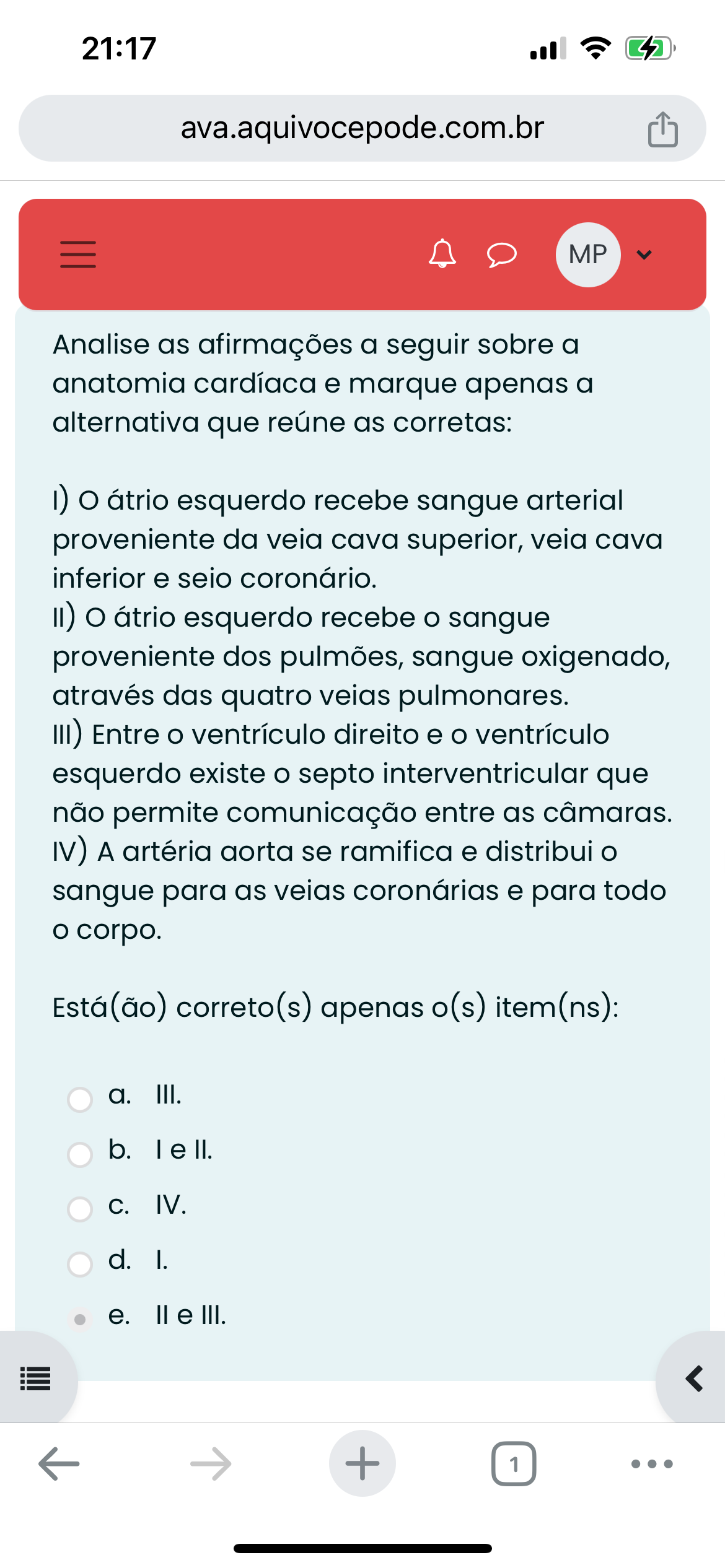 21:17 ava.aquivocepode.com.br MP Analise as afirmações a seguir sobre a anatomia cardíaca e marque apenas a alternativa que reúne as corretas: I) O átrio esquerdo recebe sangue arterial proveniente da veia cava superior, veia cava inferior e seio coronário. II) O átrio esquerdo recebe O sangue proveniente dos pulmões, sangue oxigenado, através das quatro veias pulmonares. III) Entre ventrículo direito e ventrículo esquerdo existe septo interventricular que não permite comunicação entre as câmaras. IV) A artéria aorta se ramifica e distribui sangue para as veias coronárias e para todo corpo. correto(s) apenas o(s) item(ns): a. III. b. lell. d. I. e III.
