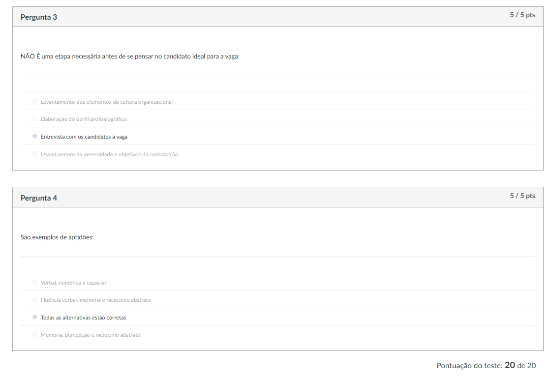 Pergunta 3 5 /5 pts NÃO É uma etapa necessária antes de se pensar no candidato ideal para a vaga: Levantamento dos elementos da cultura organizacional Elaboração do perfil Entrevista com os candidatos à vaga Levantamento da necessidade e objetivos da contratação Pergunta 4 5 5 pts São exemplos de numérica e espacial Fluência e abstrato Todas as alternativas estão corretas percepção e abstrato Pontuação do teste: 20 de 20