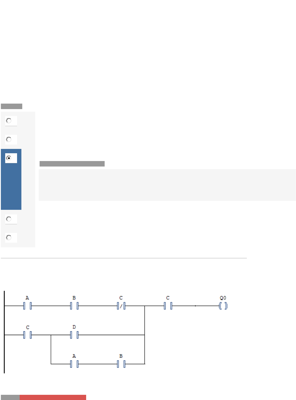 Questão 1/10 - Automação e Controle As plantas industriais podem ser divididas, basicamente, em indústrias de processo e indústrias de produção discreta. Conforme visto na aula 1, sobre as indústrias de processo e de produção discreta é correto afirmar: I) As indústrias de processo possuem operações de produção em montantes de materiais. II) As indústrias de produção discreta executam suas operações em quantidade de materiais. III) Apesar de modos de produção diferentes, as operações nas linhas de produção para processo contínuo e processo discreto não são diferentes. IV) No processo de produção contínuo, são exemplos de materiais processados: líquidos e pós. Nota: 10.0 A I, II e III estão corretos. B II, III e IV estão corretos. C I, II e IV estão corretos. Você assinalou essa alternativa (C) Você acertou! Correto! Aula 1, apostila página 9. D Todas as afirmações estão corretas. E Todas as afirmações estão erradas. Questão 2/10 - Automação e Controle Considere o seguinte diagrama ladder dado a seguir Assinale a alternativa que corresponde a expressão lógica equivalente ao diagrama ladder. Nota: 0.0Você não pontuou essa questão A S=AB¯C+CD+A¯B+CS=ABC¯+CD+AB¯+C B S=ABC+¯C(D+AB)S=ABC+C¯(D+AB) Você assinalou essa alternativa (B) C S=[AB¯C+C(D+AB)]CS=[ABC¯+C(D+AB)]C D S=[AB¯C+C(D+AB)]¯CS=[ABC¯+C(D+AB)]C¯ Questão 3/10 - Automação e Controle Analise o diagrama ladder dado a seguir Sobre ele, se afirma: I) O bloco CTU realiza a contagem crescente até 5, ou seja, a cada pulso na entrada A, a contagem é incrementada. II) Ao final da contagem as saídas Q0 e Q1 são acionadas. III) Ao iniciar o processamento do ladder, a saída Q0 está desligada e Q1 está acionada. É correto o que se afirma apenas em Nota: 0.0Você não pontuou essa questão A I. B II. C III. D I e II. Você assinalou essa alternativa (D) E I e III. Questão 4/10 - Automação e Controle Dado o diagrama ladder a seguir Considere as afirmativas I) Quando a entrada A é acionada automaticamente é iniciada a contagem de tempo pelo temporizador, que aciona sua saída após a contagem do tempo. II) Tanto a entrada A quanto a B podem acionar o temporizador e iniciar o processo de contagem de tempo. III) Ao final da contagem do tempo, a saída do temporizador é acionada ligando assim a saída Q0 e Q1. IV) A saída Q1 é acionada pela entrada A e desligada pelo temporizador. É correto o que afirma apenas em Nota: 0.0Você não pontuou essa questão A I e II. B II e III. C I e III. D I, II e III. Você assinalou essa alternativa (D) E I, II e IV. Questão 5/10 - Automação e Controle Independentemente do controle ser discreto ou contínuo, os sistemas de controle atuais são gerenciados e processados por sistemas computacionais. Conforme visto na Aula 1, sobre o controle de processo por computador é correto afirmar: I) O controlador possui a capacidade de iniciar ações por temporização, ou seja, executar ações que podem ser geradas em intervalos de tempo regulares ou geradas em momentos distintos do tempo. II) O controlador só pode gerenciar os sinais padrão de entrada do processo controlado, ou seja, condições anormais de operação no processo não podem gerar sinais de interrupção para o controlador. III) Um sistema de controle deve considerar a possibilidade de iniciar eventos gerados pelo operador da planta, como por exemplo, a execução de novos programas de produção, alteração no número de pedido, solicitação de paradas de emergência, entre outros. Nota: 0.0Você não pontuou essa questão A Somente I está correta. B Somente II está correta. C Somente III está correta. D I e II estão corretas. Você assinalou essa alternativa (D) E I e III estão corretas. Correto! Aula 1, apostila página 15. Questão 6/10 - Automação e Controle Sobre a área de alcance de um robô industrial, sabe-se que esta é relacionada diretamente com a configuração do robô. Avalie as afirmações a seguir a respeito das configurações e suas respectivas área de alcance. I - Na configuração cartesiana o robô tem alcance de qualquer ponto dentro um cubo de lado L, sendo sua movimentação baseada nas coordenadas x, y e z do sistema. II - Tanto o robô cilíndrico quanto o robô articulado possuem área de alcance cilíndrica, que obedece o formato de um cilindro com altura L e raio 2L. III - Um robô scara e um robô na configuração polar, possuem como área de alcance uma esfera de raio 2L, porém, o que diferencia um do outro é que na configuração polar existe uma restrição de atuação caracterizada por uma esfera interna de raio L. IV - As configurações são apenas para distinguir os diferentes tipos de áreas de alcance, não sendo um critério importante na escolha de um robôs para determinada aplicação. Estão corretas apenas as alternativas Nota: 0.0Você não pontuou essa questão A I e II. Você assinalou essa alternativa (A) B I e III. C II e IV. D I, II e III. E II, III e IV. Questão 7/10 - Automação e Controle Um sistema de controle em malha fechada é composto por um conjunto de elementos básicos que são fundamentais ao seu funcionamento. Conforme visto na Aula 1, a respeito dos elementos fundamentais de um controle em malha fechada é correto afirmar: Nota: 10.0 A Um controle de malha fechada é composto por: parâmetro de entrada, processo a ser controlado e variável de saída. B Um controle de malha fechada é composto por: parâmetro de entrada, processo a ser controlado, variável de saída, sensor de realimentação, o controlador e o atuador. Você assinalou essa alternativa (B) Você acertou! Correto! Aula 1, apostila página 5. C A saída de um sistema de controle é medida através de um atuador. D A variável de saída não precisa ser medida, sendo necessário somente definir o parâmetro de entrada desejado. E Um controle em malha fechada pode ser implementado somente com: o processo a ser controlado,