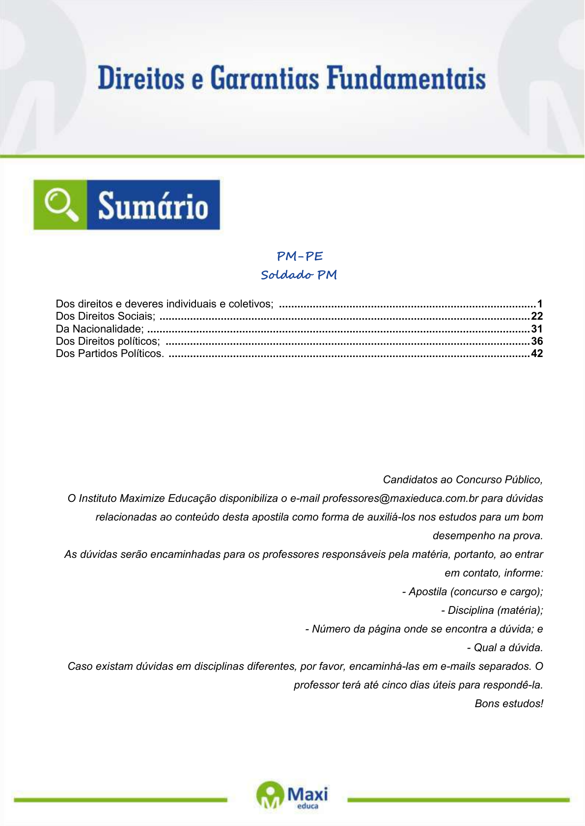 . 1 PM-PE Soldado PM Dos direitos e deveres individuais e coletivos; .................................................................................... 1 Dos Direitos Sociais; ......................................................................................................................... 22 Da Nacionalidade; ............................................................................................................................. 31 Dos Direitos políticos; ....................................................................................................................... 36 Dos Partidos Políticos. ...................................................................................................................... 42 Candidatos ao Concurso Público, O Instituto Maximize Educação disponibiliza o e-mail professores@maxieduca.com.br para dúvidas relacionadas ao conteúdo desta apostila como forma de auxiliá-los nos estudos para um bom desempenho na prova. As dúvidas serão encaminhadas para os professores responsáveis pela matéria, portanto, ao entrar em contato, informe: - Apostila (concurso e cargo); - Disciplina (matéria); - Número da página onde se encontra a dúvida; e - Qual a dúvida. Caso existam dúvidas em disciplinas diferentes, por favor, encaminhá-las em e-mails separados. O professor terá até cinco dias úteis para respondê-la. Bons estudos! Apostila gerada especialmente para: Simulados Pnz 118.286.244-62 . 1 Caro(a) candidato(a), antes de iniciar nosso estudo, queremos nos colocar à sua disposição, durante todo o prazo do concurso para auxiliá-lo em suas dúvidas e receber suas sugestões. Muito zelo e técnica foram empregados na edição desta obra. No entanto, podem ocorrer erros de digitação ou dúvida conceitual. Em qualquer situação, solicitamos a comunicação ao nosso serviço de atendimento ao cliente para que possamos esclarecê-lo. Entre em contato conosco pelo e-mail: professores@maxieduca.com.br Direitos e garantias fundamentais. A Constituição Federal de 1988 trouxe em seu Título II os direitos e garantias fundamentais, subdividindo-os em cinco capítulos: direitos e deveres individuais e coletivos, direitos sociais, nacionalidade, direitos políticos e partidos políticos. Direitos e Deveres Individuais e Coletivos A Constituição de 1988 foi a primeira a estabelecer direitos não só de indivíduos, mas também de grupos sociais, os denominados direitos coletivos. As pessoas passaram a ser coletivamente consideradas. Por outro lado, pela primeira vez, junto com direitos foram estabelecidos expressamente deveres fundamentais. Tanto os agentes públicos como os indivíduos têm obrigações específicas, inclusive a de respeitar os direitos das demais pessoas que vivem na ordem social. Constituição Federal: TÍTULO II Dos Direitos e Garantias Fundamentais CAPÍTULO I DOS DIREITOS E DEVERES INDIVIDUAIS E COLETIVOS Artigo 5º - Todos são iguais perante a lei, sem distinção de qualquer natureza, garantindo-se aos brasileiros e aos estrangeiros residentes no País a inviolabilidade do direito à vida, à liberdade, à igualdade, à segurança e à propriedade, nos termos seguintes: O artigo 5º da Constituição da República Federativa do Brasil de 1988 pode ser caracterizado como um dos mais importantes constantes do arcabouço jurídico brasileiro. Tal fato se justifica em razão de que este apresenta, em seu bojo, a proteção dos bens jurídicos mais importantes para os cidadãos, quais sejam: vida, liberdade, igualdade, segurança e propriedade. A relação extensa de direitos individuais estabelecida no art. 5º da Constituição tem caráter meramente enunciativo, não se trata de rol taxativo. Existem outros direitos individuais resguardados em outras normas previstas na própria Constituição (por exemplo, o previsto no art. 150, contendo garantias de ordem tributária). Vamos acompanhar em seguida o que prevê os demais dispositivos da norma: I- homens e mulheres são iguais em direitos e obrigações, nos termos desta Constituição; O inciso supracitado traz, em seu bojo, um dos princípios mais importantes existentes no ordenamento jurídico brasileiro, qual seja, o princípio da isonomia ou da igualdade. Tal princípio igualou os direitos e obrigações dos homens e mulheres, porém, permitindo as diferenciações realizadas nos termos da Constituição. II- ninguém será obrigado a fazer ou deixar de fazer alguma coisa senão em virtude de lei; O inciso supracitado contém em seu conteúdo o princípio da legalidade. Ele garante a segurança jurídica e impede que o Estado aja de forma arbitrária. Tal princípio tem por escopo explicitar que nenhum cidadão será obrigado a realizar ou deixar de realizar condutas que não estejam definidas em lei. Ou seja, para o particular, apenas a lei pode criar uma obrigação. Além disso, se não existe uma lei que proíba uma determinada conduta, significa que ela é permitida. Dos direitos e deveres individuais e coletivos Apostila gerada especialmente para: Simulados Pnz 118.286.244-62 . 2 Outro ponto importante a ser ressaltado é que legalidade não se confunde com reserva legal. A legalidade é mais ampla, significa que deve haver lei, elaborada segundo as regras do processo legislativo, para criar uma obrigação. Já a reserva legal é de menor abrangência e significa que, determinadas matérias, especificadas pela Constituição, só podem ser tratadas por lei proveniente do Poder Legislativo (ex.: art. 5.º, inciso XXXIX: "não há crime sem lei anterior que o defina, nem pena sem prévia cominação legal", este é o famoso princípio da reserva legal). III- ninguém será submetido à tortura nem a tratamento desumano ou degradante; O inciso em questão garante que nenhum cidadão será submetido a tortura nem a tratamento desumano ou degradante. Tal assertiva se alicerça ao fato de que o sujeito que cometer tortura estará cometendo crime tipifi