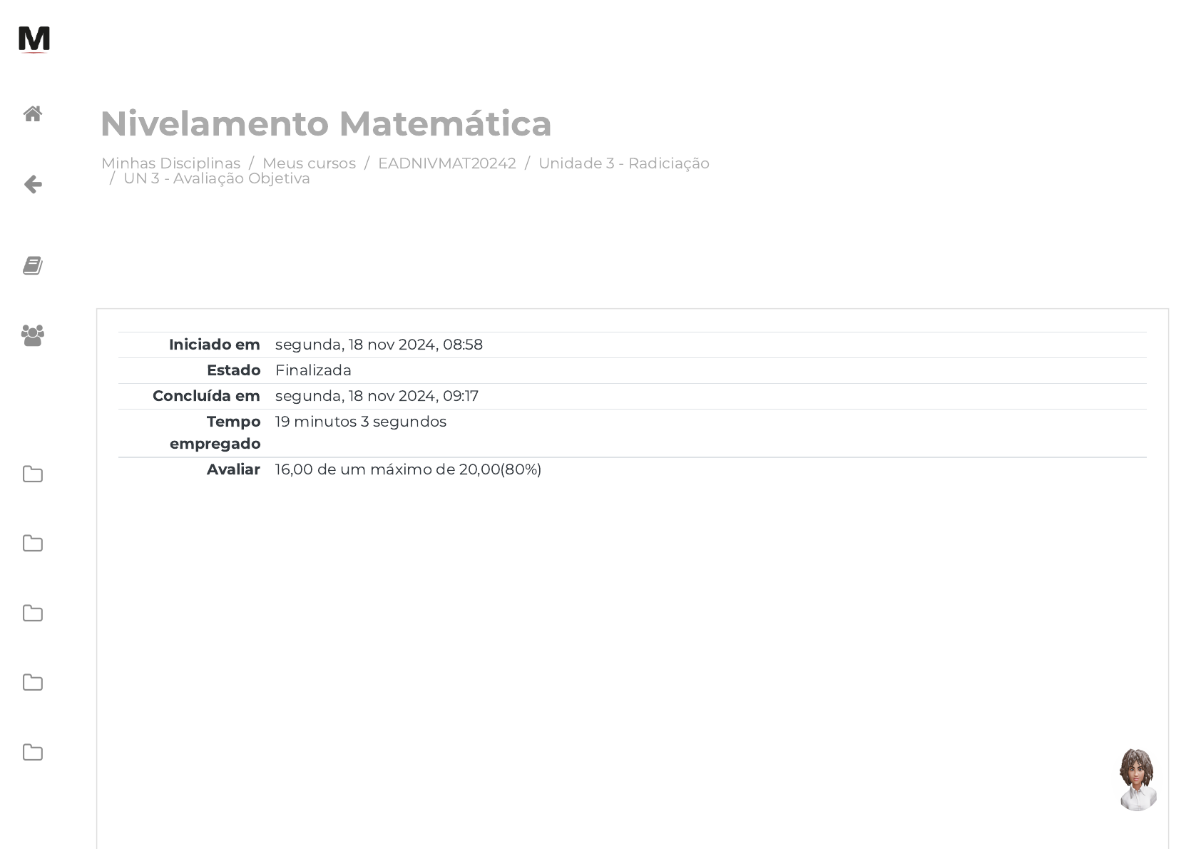 Minhas Disciplinas / Meus cursos / EADNIVMAT20242 / Unidade 3 - Radiciação / UN 3 - Avaliação Objetiva Nivelamento Matemática Iniciado em segunda, 18 nov 2024, 08:58 Estado Finalizada Concluída em segunda, 18 nov 2024, 09:17 Tempo empregado 19 minutos 3 segundos Avaliar 16,00 de um máximo de 20,00(80%)           https://avap.multivix.edu.br/my/ https://avap.multivix.edu.br/course/view.php?id=28021 https://avap.multivix.edu.br/course/view.php?id=28021§ion=4 https://avap.multivix.edu.br/mod/quiz/view.php?id=1677167 https://avap.multivix.edu.br/my/ https://avap.multivix.edu.br/course/view.php?id=28021 https://avap.multivix.edu.br/user/index.php?id=28021 https://avap.multivix.edu.br/course/view.php?id=28021§ion=1 https://avap.multivix.edu.br/course/view.php?id=28021§ion=2 https://avap.multivix.edu.br/course/view.php?id=28021§ion=3 https://avap.multivix.edu.br/course/view.php?id=28021§ion=4 https://avap.multivix.edu.br/course/view.php?id=28021§ion=5 https://avap.multivix.edu.br/course/view.php?id=28021§ion=6 https://avap.multivix.edu.br/ https://avap.multivix.edu.br/ https://avap.multivix.edu.br/ https://avap.multivix.edu.br/ https://avap.multivix.edu.br/ https://avap.multivix.edu.br/ https://avap.multivix.edu.br/ Questão 1 Incorreto Atingiu 0,00 de 4,00 Resolvendo a expressão abaixo, marque a alternativa correta: Escolha uma opção: a. 2 b. 3 c. 4  d. 1 e. 5 https://avap.multivix.edu.br/ https://avap.multivix.edu.br/ https://avap.multivix.edu.br/ https://avap.multivix.edu.br/ https://avap.multivix.edu.br/ https://avap.multivix.edu.br/ https://avap.multivix.edu.br/ Questão 2 Correto Atingiu 4,00 de 4,00 Resolvendo a expressão abaixo, marque a alternativa correta: Escolha uma opção: a. 8 b. 6 c. 2  d. 4 e. 10 https://avap.multivix.edu.br/ https://avap.multivix.edu.br/ https://avap.multivix.edu.br/ https://avap.multivix.edu.br/ https://avap.multivix.edu.br/ https://avap.multivix.edu.br/ https://avap.multivix.edu.br/ Questão 3 Correto Atingiu 4,00 de 4,00 Resolvendo a expressão abaixo, marque a alternativa correta: Escolha uma opção: a. 32 b. 8 c. 4 d. 16 e. 2  https://avap.multivix.edu.br/ https://avap.multivix.edu.br/ https://avap.multivix.edu.br/ https://avap.multivix.edu.br/ https://avap.multivix.edu.br/ https://avap.multivix.edu.br/ https://avap.multivix.edu.br/ Questão 4 Correto Atingiu 4,00 de 4,00 Resolvendo a expressão abaixo, marque a alternativa correta: Escolha uma opção: a. 2 b. ∛5 c. ∛3 d. ∛4 e. 2 –√3 https://avap.multivix.edu.br/ https://avap.multivix.edu.br/ https://avap.multivix.edu.br/ https://avap.multivix.edu.br/ https://avap.multivix.edu.br/ https://avap.multivix.edu.br/ https://avap.multivix.edu.br/ Questão 5 Correto Atingiu 4,00 de 4,00 Resolvendo a expressão abaixo, marque a alternativa correta: Escolha uma opção: a. 4 b. 3  c. 2 d. 5 e. 1 ◄ Unidade 3 - Vídeo 03 Seguir para... Unidade 4 - Vídeo 01 ► https://avap.multivix.edu.br/mod/page/view.php?id=1677166&forceview=1 https://avap.multivix.edu.br/mod/page/view.php?id=1677168&forceview=1 https://avap.multivix.edu.br/ https://avap.multivix.edu.br/ https://avap.multivix.edu.br/ https://avap.multivix.edu.br/ https://avap.multivix.edu.br/ https://avap.multivix.edu.br/ https://avap.multivix.edu.br/