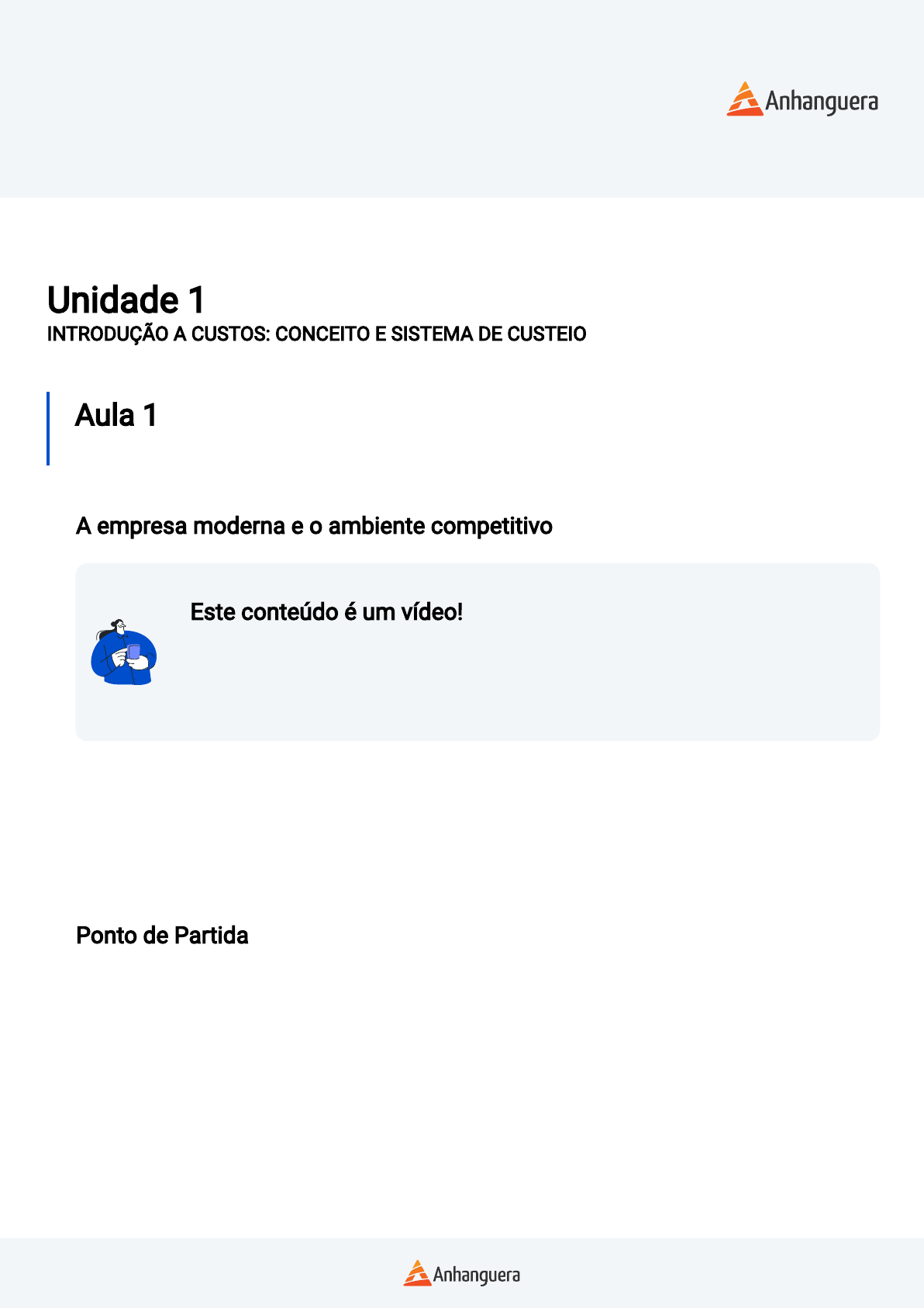 Disciplina OPERAÇÕES PRODUTIVAS E LOGÍSTICAS Unidade 1 INTRODUÇÃO A CUSTOS: CONCEITO E SISTEMA DE CUSTEIO Aula 1 A Empresa Moderna e o Ambiente Competitivo A empresa moderna e o ambiente competitivo Este conteúdo é um vídeo! Para assistir este conteúdo é necessário que você acesse o AVA pelo computador ou pelo aplicativo. Você pode baixar os vídeos direto no aplicativo para assistir mesmo sem conexão à internet. Olá, estudante. Vimos durante esta aula que existem outras formas de custeio, além do de absorção, para o gerenciamento de custos. Pois bem, no vídeo veremos como é a tomada de decisão baseada no método de custeio direto, aquele que considera os custos diretos como os indutores da decisão. Você verá também o conceito de margem de contribuição (MC), que auxilia os gestores em suas análises. Ponto de Partida Olá, estudante! Nesta aula serão apresentados os principais conceitos de custos e custeio, pontos importantes para que uma empresa seja competitiva. Os custos de produção são variáveis que estão sob a responsabilidade dos gestores da empresa, oferecendo a eles a possibilidade de uma tomada de decisão mais segura. Você vai perceber que existem diversas formas de se alocar os custos para os produtos produzidos, não existindo um método único. Em mercados com muitos concorrentes, é quase impossível uma empresa aumentar seu lucro aumentando os preços de seus produtos. Dessa forma, o lucro será mantido, ou até mesmo aumentado, quando a gestão conhecer os custos de produção, podendo alterar a forma de alocação ou sua eliminação. Agora é a sua vez! Pro�ssionais que compreendem a ideia dos custos podem ser vitais para equipes que participam de projetos de novos produtos ou remodelamento de processos. Disciplina OPERAÇÕES PRODUTIVAS E LOGÍSTICAS Vamos Começar! Apresentando o conceito de custos São muitos os fatores que podem levar uma empresa ao sucesso, desde o lançamento de produtos revolucionários até uma política de preços baixos bastante agressiva. É fundamental também que a empresa possa conhecer e gerenciar seus custos de maneira a manter o negócio o mais lucrativo possível. Quando analisamos qualquer tipo de empresa, precisamos conhecer três conceitos básicos importantes para encontrarmos o lucro: receita, despesa e custo. A receita é concebida como uma entrada de dinheiro – ou de um bem que possa ser quanti�cado monetariamente – ou a baixa de uma obrigação da empresa, que tenham como contrapartida a prestação de serviços ou entrega de produtos. As despesas compreendem a utilização ou o consumo de bens ou serviços durante o processo de obtenção de receitas (IUDICIBUS; MARTINS; GELBCKE, 2000). Na literatura acadêmica, os custos possuem as mesmas características das despesas. No entanto, por questões gerenciais, eles são relacionados aos insumos usados para a produção de produtos ou prestação de serviços (SANTOS et al., 2015). A partir de agora, usaremos os custos com essa de�nição, enquanto usaremos as despesas para classi�car o consumo de bens ou serviços não relacionados diretamente com o negócio principal da empresa. Despesas Custos Energia da sede. Consumo de água da sede. Salários da equipe de marketing. IPTU da sede. Matérias-primas. Depreciação de máquinas. Segurança da fábrica. Consumo de água da fábrica. Figura 1 | Exemplos de despesas e custos. Fonte: elaborada pelo autor. Os custos podem ser classi�cados de diversas formas, podendo destacar duas como as principais. Os custos, quando considerada sua relação direta com os produtos, podem ser classi�cados em diretos e indiretos. Os custos diretos são facilmente identi�cáveis na cadeia de produção. Já os custos indiretos não têm essa facilidade, isto é, será preciso algum critério para rateá-los entre produtos diferentes. Disciplina OPERAÇÕES PRODUTIVAS E LOGÍSTICAS Figura 2 | Classi�cação dos custos pela relação com o produto. Fonte: elaborada pelo autor. A segunda forma de classi�car os custos considera a relação deles com o nível de atividade. Assim, temos os custos �xos, aqueles que não se alteram conforme a quantidade de bens produzidos; já os custos variáveis, conforme se sugere, alteram seu valor conforme a quantidade de bens produzidos aumenta ou diminui. Figura 3 | Diferenciando os custos �xos das variáveis. Fonte: elaborada pelo autor. Quando a empresa já conhece o total dos custos, quer sejam os �xos quer sejam os variáveis, é o momento de atribuí-lo aos produtos prontos unitariamente. A essa atribuição damos o nome de custeio, que se subdivide em integral, parcial e direto. O custeio integral é o sistema em que todos os custos �xos e variáveis, além das despesas, são alocados em cada produto. O conceito �cará mais claro ao observarmos a �gura a seguir: Disciplina OPERAÇÕES PRODUTIVAS E LOGÍSTICAS ESQUEMA BÁSICO DO CUSTEIO INTEGRAL a. consumo de matéria- prima b. mão de obra direta c. custos indiretos da fabricação soma: ( ) custos de produção d. despesas indiretas da administração e. despesas indiretas da distribuição f. despesas diretas da venda soma: ( ) despesa total soma: ( ) custo total do produto g. receita soma: (lucro ou prejuízo) h. preço de venda MP - (variável proporcional) MOD - (variável) CIF - (variáveis e �xos) CP - DIA - (�xos) DID - (predominantemente �xos) DV - (variáveis) DT - CT - R - Re - Pv - Figura 4 | Componentes do custeio integral. Fonte: Santos et al. (2015). No custeio parcial, como o próprio nome sugere, os custos �xos, parcialmente ou em sua totalidade, não são considerados na apropriação dos custos aos produtos. Por �m, temos o custeio direto, que não considera os custos �xos nas apropriações. Siga em Frente... Custos diretos versus custos indiretos Imagine que você esteja com bastante fome num dia. Para diminuí-la, você vai à seção de biscoitos de um supermerc