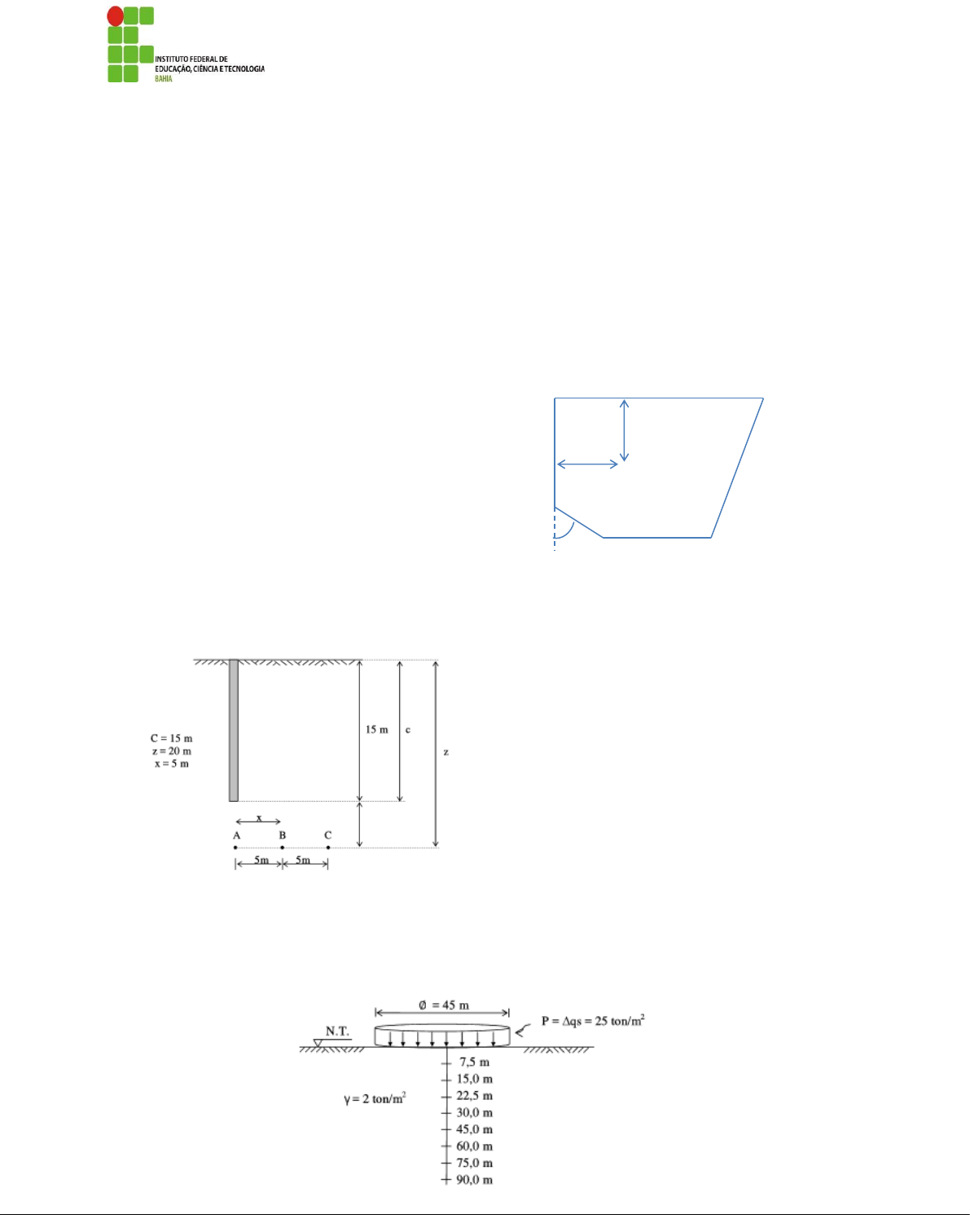 INSTITUTO FEDERAL DA BAHIA COORDENAÇÃO DE ENGENHARIA CIVIL PROFº: Edmilson Pedreira dos Reis DISCIPLINA: MECÂNICA DOS SOLOS II DATA: 03/10/2024 ALUNO: ________________________________________________TURMA ENG 2022 _______________________________________________________________________________ LISTA AVALIATIVA – Valor 3,0 pontos Data de entrega: Dia da 1ª Avaliação (1º Crédito) Tensões geostáticas - Acréscimos de tensões - Compressibilidade e recalques e Adensamento de solos 1ª QUESTÃO: Calcule usando o ábaco dos quadradinhos, o acréscimo de tensão causado pela área carregada seguinte à profundidade igual a 5m, abaixo do ponto indicado (A). 2ª QUESTÃO: Calcular a pressão vertical nos pontos A e B devido a uma estaca carregada com 500 kN, sendo que 350 kN são transmitidos pela ponta da estaca e 150 kN pelo seu atrito lateral. 3ª QUESTÃO: Para o perfil geotécnico abaixo, determine: a) o acréscimo de tensão vertical para um depósito circular na profundidade de 15 m; b) a tensão efetiva final aos 7,5 m e aos 90,0 m de profundidade. 6 m • A 0=250 kPa 4 m 45º 4 m 2 m 2 m 1 m 4ª QUESTÃO: Dada a situação da planta abaixo, calcule o acréscimo de tensão devido a sapata carregada com 480 kN/m2 a 5 m de profundidade no ponto A. Utilize a solução de Newmark e Steinbrenner. 5ª QUESTÃO: Três pilares afastados 6,0 m de eixo a eixo, transmitem as cargas indicadas no perfil abaixo. Considerando as ditas cargas como puntiformes, calcular as pressões transmitidas ao meio da camada de argila, sob cada pilar. 6ª QUESTÃO: Uma sapata corrida de 2,0m de largura transmite uma carga de 250kN/m2 à superfície de um depósito de areia com NA à superfície do terreno. O peso específico saturado da areia é 20kN/m3. Determinar as pressões efetivas verticais, em um ponto situado a 3m abaixo do centro da sapata, antes e após o acréscimo de carga à fundação. Areia 7ª QUESTÃO: Na investigação de um vale, as sondagens indicaram o perfil típico do terreno, conforme esquema abaixo, com NA a 4,0m e o substrato rochoso a 18,0m de profundidade. a) Traçar os diagramas de pressões verticais totais, efetivas e neutras ao longo do perfil do terreno b) Calcular a pressão vertical efetiva na base do perfil abaixo, admitindo um rebaixamento de 4,0m do lençol freático. Admitir as camadas de solo situados acima do NA, com um grau de saturação de 80%. 8ª QUESTÃO: Calcule o recalque imediato no centro de uma sapata flexível e retangular, de 10 x 40m, aplicando uma tensão de 50 kPa nas camadas de solo abaixo. Considere = 0,4. 9ª QUESTÃO: Para determinar o recalque que uma sapata com 3,0 m x 1,5 m iria provocar no terreno, foi realizada a prova de carga direta com diâmetro da placa de 72 cm, na mesma cota em que a sapata será assentada. Determine o recalque, sabendo que se pretende aplicar uma tensão de 1000 KPa nesta sapata. O resultado do ensaio está apresentado no gráfico abaixo. 10ª QUESTÃO: Dados os esquemas abaixo (sapata circular e sapata retangular) estime o alcance dos bulbos de tensões em função das dimensões das fundações. 11ª QUESTÃO: Quais os objetivos de se realizar o ensaio de adensamento? 12ª QUESTÃO: Relacione a aparelhagem para a realização do ensaio de Adensamento. 13ª QUESTÃO: Utilizando a NBR16853:2020, descreva de forma sucinta a execução do ensaio de adensamento. 14ª QUESTÃO: Quais as determinações que devem ser feitas antes do início do ensaio? 15ª QUESTÃO: A seguir, encontra-se os resultados do ensaio de adensamento de laboratório: a) Trace a curva e x log ´; b) Detemine Cc e Cr. c) Determine a tensão de pré-adensamento (´vm) pelos métodos de Casagrande e Pacheco Silva; Pressão(kPa) e 0 3,42 10 3,38 20 3,28 40 2,88 80 2,36 160 1,88 320 1,42 640 0,92 320 1,00 160 1,06 80 1,12 40 1,16 20 1,22 - - = 3 m L = 20 m; B = 5 m
