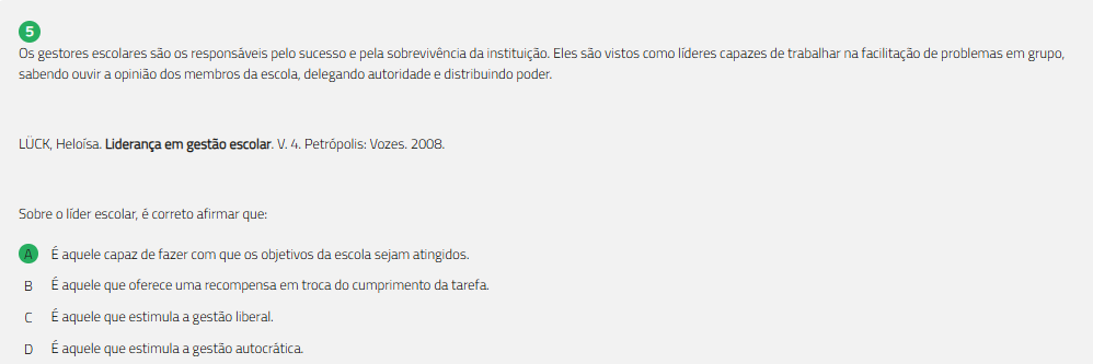 5 Os gestores escolares são os responsáveis pelo sucesso e pela sobrevivência da instituição. Eles são vistos como líderes capazes de trabalhar na facilitação de problemas em grupo, sabendo ouvir a opinião dos membros da escola, delegando autoridade e distribuindo poder. Heloisa Liderança em gestão escolar. Sobre escolar, é correto afirmar que: É aquele capaz de fazer com que os objetivos da escola sejam atingidos. B É aquele que oferece uma recompensa em troca do cumprimento da tarefa É aquele que estimula a gestão liberal. D É aquele que estimula a gestão