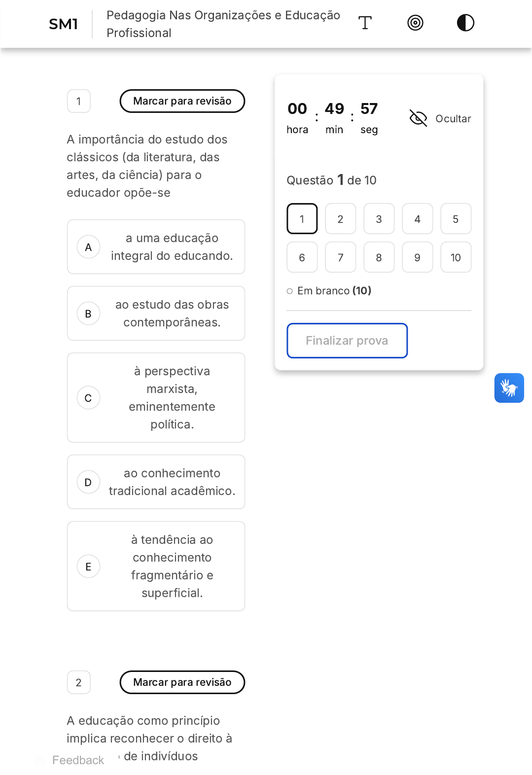 A B C D E 1 Marcar para revisão A importância do estudo dos clássicos (da literatura, das artes, da ciência) para o educador opõe-se a uma educação integral do educando. ao estudo das obras contemporâneas. à perspectiva marxista, eminentemente política. ao conhecimento tradicional acadêmico. à tendência ao conhecimento fragmentário e superficial. 2 Marcar para revisão A educação como princípio implica reconhecer o direito à formação de indivíduos 00 hora : 49 min : 57 seg Ocultar Questão 1 de 10 Em branco �10� Finalizar prova 1 2 3 4 5 6 7 8 9 10 SM1 Pedagogia Nas Organizações e Educação Profissional Feedback Mc Realce A B C críticos, de cidadãos e não como um mero direito conteudista. A aprendizagem bem desenvolvida promove conhecimento amplo qualificando para muitas situações e ações. Quando se discute a formação profissional no Brasil, a discussão sobre o ensino básico é pertinente porque o ensino básico é determinante para a formação de profissionais, pois os valores do trabalho são incutidos na primeira infância. o ensino básico é o único reprodutor da condição superestrutural da sociedade capitalista. é no ensino básico que os educandos aprendem operações de raciocínio úteis a todas as profissões. D E o ensino básico, bem como o médio, acaba tendo um duplo caráter: de formação e de profissionalização, uma vez que parte dos educandos ingressa direto no mercado de trabalho. o ensino básico é o foco dos investimentos do Estado em educação, competindo com o ensino superior e profissionalizante. 3 Marcar para revisão Tendo em vista a análise dos processos que relacionam educação e trabalho no modo de produção capitalista encontramos em Karl Marx o exame do processo da divisão social do trabalho no contexto da industrialização do século XIX e a crítica da exploração e da alienação do trabalho, preocupando-se com o afastamento da atividade omnilateral das instituições de ensino. Sobre o conceito de formação omnilateral, avalie as afirmativas a seguir. Mc Realce A B C D E I. É prejudicial à formação da cidadania por proporcionar a unilateralidade da educação do sujeito priorizando a dimensão racional. II. É uma teoria que incentiva o determinismo da divisão de classes por meio das práticas educativas escolares. III. É uma opção de formação que contempla as várias dimensões do sujeito que amplia o conceito de educação integral. IV. É uma prática educativa baseada na formação das habilidades de competências exclusivamente para a preparação para o trabalho. Está correto o que se afirma em Somente I está correta. Somente I e III estão corretas. Somente I, II e III estão corretas. Somente IV está correta. Somente III e IV estão corretas. Mc Realce A B 4 Marcar para revisão �Questão adaptada do concurso para a prefeitura de Santana do Jacaré-MG. Auxiliar de secretaria / 2015� Tornar a Educação mais inclusiva e acessível é uma urgência. Todos devem ser respeitados em suas diferenças, particularidades e especificidades. Sobre o princípio da inclusão na educação, assinale a alternativa correta. A educação inclusiva garante a qualidade de ensino a cada aluno, reconhecendo e respeitando a diversidade de acordo com as potencialidades e necessidades de cada um. A escola somente poderá ser considerada inclusiva quando estiver direcionada para tratar os alunos de forma indiferente em todos os aspectos. Mc Realce C D E O princípio da inclusão na educação garante a preferência aos alunos-destaque, tratando todos de forma genérica sem necessidade de tratamento diferenciado em nenhum aspecto. Na escola inclusiva, o aluno está sujeito à segregação, garantindo na aprendizagem a construção das competências necessárias para o exercício pleno da cidadania. A escola inclusiva promove um processo de avaliação que classifica de acordo com o grau de merecimento, levando em consideração exclusivamente as notas das provas. 5 Marcar para revisão "Com base nas relações dialéticas estabelecidas entre educação e sociedade sob a perspectiva materialista A B C D E histórica gramsciana, pode-se concluir que a educação deve ser entendida como o resultado cultural de um longo caminho trilhado pela humanidade e, ao mesmo tempo, um processo histórico das práticas socioculturais dos seres humanos enquanto sujeitos políticos ativos e partícipes das transformações da sociedade em que vivem". �MELO, Maria Lúcia e RODRIGUES, Denise Simões. Gramsci e a Educação. Anais da Jornada Internacional de Estudos e Pesquisas em Antonio Gramsci. 2016� Essa perspectiva pedagógica parece se alinhar à: Educação unilateral. Educação bilateral. Educação europeia novecentista. Educação europeia oitocentista. Educação omnilateral. 6 Marcar para revisão Mc Realce A B C �Questão adaptada do concurso do Magistério para o IF�RN / 2012� No que se refere às críticas que se desenvolvem aos defensores da relação direta entre educação e economia, estas não desconhecem a importância da escola para o desenvolvimento econômico de uma nação. Assinale a opção que realça o sentido da relação entre educação e economia defendida por pensadores críticos das políticas educacionais. Articulação entre escola e economia deve privilegiar a lógica mercantil. Articulação entre escola e economia não pode se estabelecer subordinando a escola ao capital. Articulação entre escola e economia deve ter como categorias norteadoras a competitividade e a produtividade. Mc Realce D E Articulação entre escola e economia deve ser pensada tendo apenas a obrigação de preparar para a empregabilidade. Articulação entre escola e economia só acontece em sociedades capitalistas. 7 Marcar para revisão Na visão omnilateral de K. Marx, a concepção do ensino tecnológico exprime a exigência de fazer adquirir conhecimentos de bases científicas e tecnológicas 