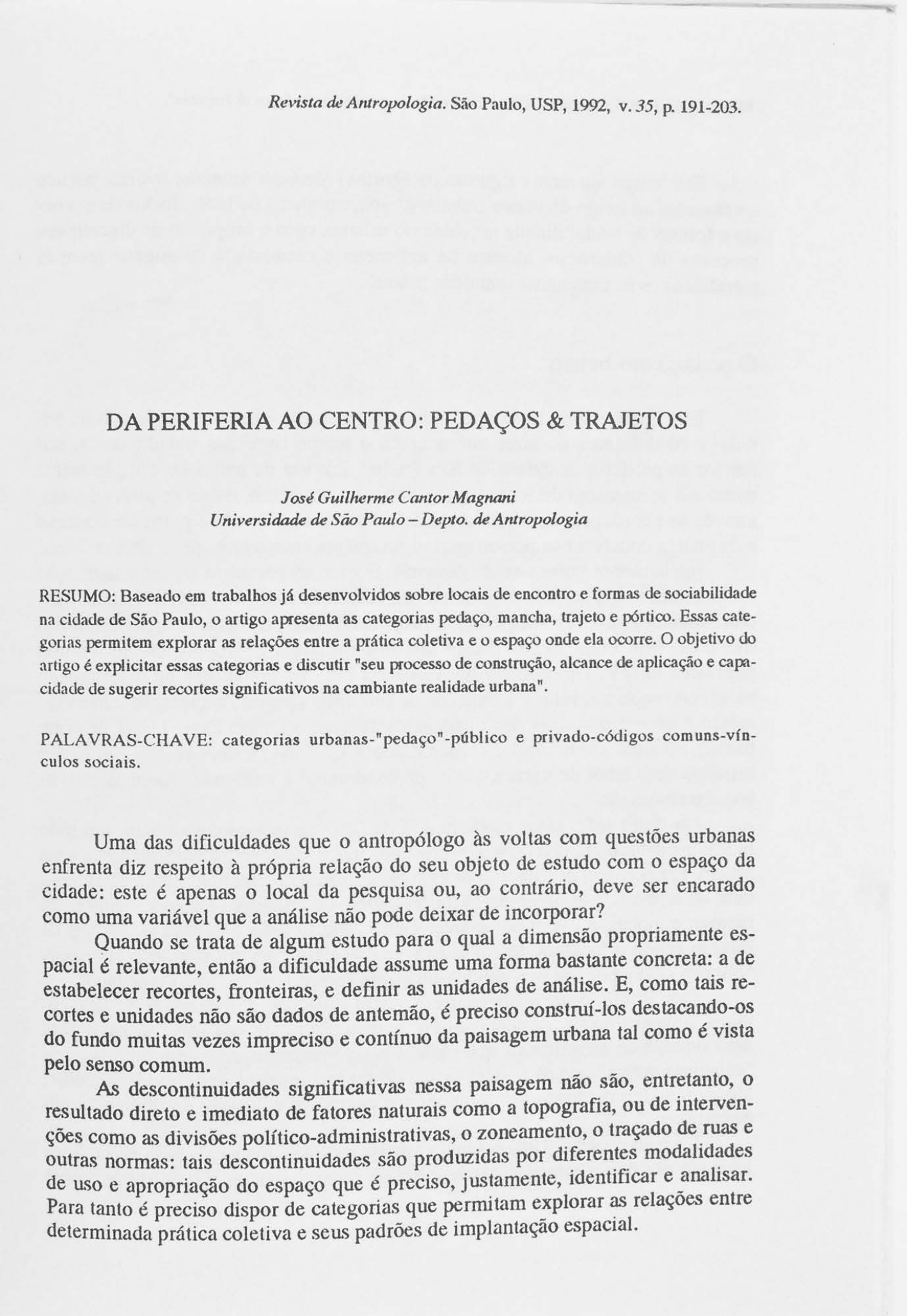 MAGNANI, José Guilherme Cantor. "Da periferia ao centro: pedaços & trajetos".