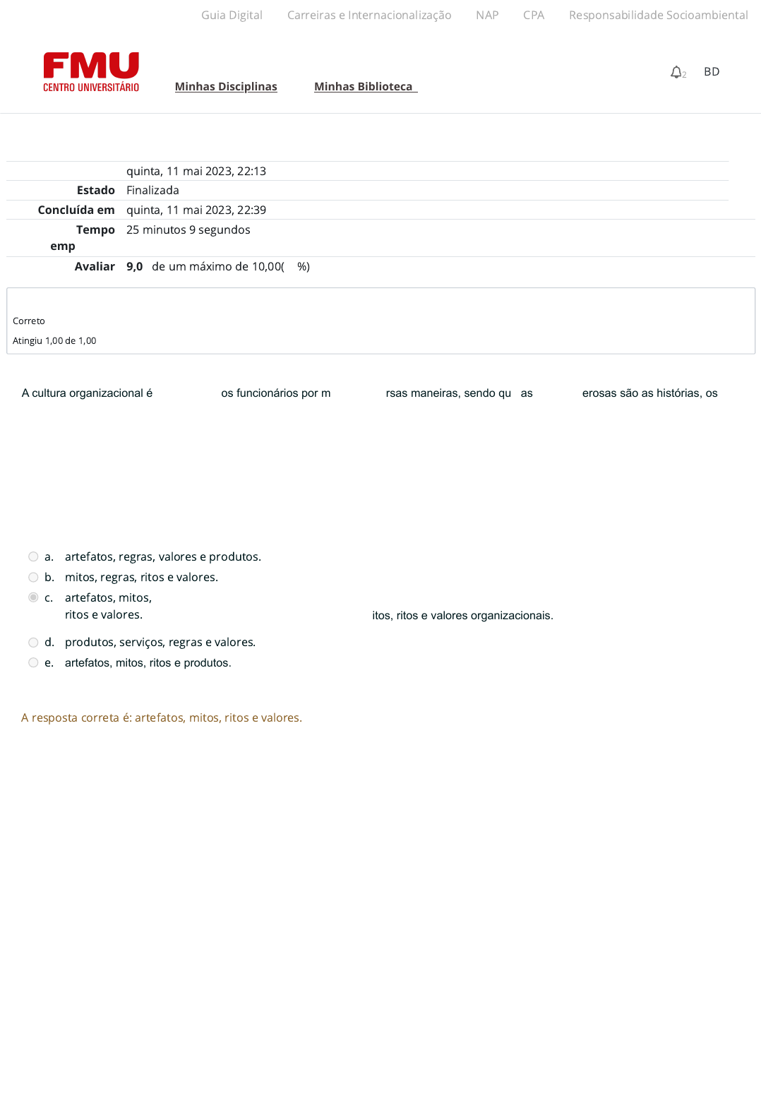 Iniciado em quinta, 11 mai 2023, 22:13 Estado Finalizada Concluída em quinta, 11 mai 2023, 22:39 Tempo empregado 25 minutos 9 segundos Avaliar 9,00 de um máximo de 10,00(90%) Questão 1 Correto Atingiu 1,00 de 1,00 A cultura organizacional é transmitida aos funcionários por meio de diversas maneiras, sendo que as mais poderosas são as histórias, os rituais, os símbolos e a linguagem. Essas maneiras são classificadas como componentes da cultura organizacional e impactam, diretamente, o comportamento das pessoas dentro da empresa. Robbins, S. Fundamentos do Comportamento Organizacional: teoria e prática no contexto brasileiro. 14 ed. São Paulo: Pearson, 2010 (adaptado). Além das histórias, dos rituais, dos símbolos e da linguagem, também são considerados componentes da cultura organizacional: a. artefatos, regras, valores e produtos. b. mitos, regras, ritos e valores. c. artefatos, mitos, ritos e valores. Resposta correta. São considerados elementos da cultura organizacional as histórias, os rituais, os símbolos, a linguagem, artefatos, mitos, ritos e valores organizacionais. d. produtos, serviços, regras e valores. e. artefatos, mitos, ritos e produtos. A resposta correta é: artefatos, mitos, ritos e valores. Guia Digital Carreiras e Internacionalização NAP CPA Responsabilidade Socioambiental Minhas Disciplinas Minhas Bibliotecas 2 BD Aces Recu 17/06/24, 20:17 N2 (A5): Revisão da tentativa https://ambienteacademico.com.br/mod/quiz/review.php?attempt=2203805&cmid=842825 1/10 https://codely-fmu-content.s3.amazonaws.com/Moodle/GuiaDigital/Guia+digital/index.html https://carreiras.fmu.br/ https://codely-fmu-content.s3.amazonaws.com/Moodle/NAP/inicial/nap/fmu/index.html https://codely-fmu-content.s3.amazonaws.com/Moodle/CPA/landing_CPA/index.html https://portal.fmu.br/sustentabilidade https://ambienteacademico.com.br/ https://ambienteacademico.com.br/ https://ambienteacademico.com.br/course/view.php?id=236 Questão 2 Correto Atingiu 1,00 de 1,00 O conflito é muito mais do que um simples desacordo ou divergência: é uma interferência ativa ou passiva, mas deliberada para impor um bloqueio sobre a tentativa de outra parte de alcançar seus objetivos. Ele pode ocorrer no contexto do relacionamento social e profissional, envolvendo duas ou mais partes, grupos e organizações. Como os conflitos são comuns na vida organizacional, o administrador deve saber desativá-los a tempo e evitar a sua eclosão, utilizando-se do processo de negociação. CHIAVENATO, I. Gestão de Pessoas: o novo papel dos recursos humanos nas organizações. 4 ed. São Paulo: Manole, 2014 (adaptado). Representam as fases que compõem o processo de negociação: I. Análise II. Planejamento III. Concessão IV. Execução V. Controle É correto apenas o que se afirma em: a. II e IV. b. I, II e III. c. I, III e V. d. I e III. e. II, IV e V. Resposta correta. As fases que compõem o processo de negociação são planejamento, execução e controle. A resposta correta é: II, IV e V. Guia Digital Carreiras e Internacionalização NAP CPA Responsabilidade Socioambiental Minhas Disciplinas Minhas Bibliotecas 2 BD Aces Recu 17/06/24, 20:17 N2 (A5): Revisão da tentativa https://ambienteacademico.com.br/mod/quiz/review.php?attempt=2203805&cmid=842825 2/10 https://codely-fmu-content.s3.amazonaws.com/Moodle/GuiaDigital/Guia+digital/index.html https://carreiras.fmu.br/ https://codely-fmu-content.s3.amazonaws.com/Moodle/NAP/inicial/nap/fmu/index.html https://codely-fmu-content.s3.amazonaws.com/Moodle/CPA/landing_CPA/index.html https://portal.fmu.br/sustentabilidade https://ambienteacademico.com.br/ https://ambienteacademico.com.br/ https://ambienteacademico.com.br/course/view.php?id=236 Questão 3 Correto Atingiu 1,00 de 1,00 Observe a cena retratada na charge. Os ruídos na comunicação Fonte: MOURA, K. Blog Zona Coletiva. Disponível em h�ps://zonacole�vablog.wordpress.com/2015/11/22/os-ruidos-da-comunicacao-parte-1-as-falhas-na- comunicacao-interna-quem-nao-se-comunica-se-trumbica/ Acesso em 01/05/2019. Como se pode observar na charge, o ruído causou interferência na comunicação entre os colaboradores da empresa. Essa interferência decorre da falta de integração entre os elementos que compõem o processo de comunicação, sendo estes, portanto, considerados como origens do ruído. Sobre os elementos do processo de comunicação, enquanto origens do ruído, analise as afirmativas relacionadas às origens dessa interferência e marque a alternativa correta. a. Os pensamentos estruturados que compõem a mensagem elaborado pelo emissor, contribuem para a geração do ruído na comunicação. b. O excesso de concentração do receptor, ao receber a mensagem, provoca ruído na comunicação. c. A falha na legenda de um �lme pode ser considerada um exemplo de ruído, causado pelo uso equivocado do canal da comunicação. Resposta correta. A falha na legenda de um �lme pode ser considerada um exemplo de ruído, causado pelo uso equivocado do canal da comunicação. d. O emissor, ao decodi�car a mensagem, deve estar atento à clareza das ideias que serão transmitidas. e. Quando o emissor usa palavras desconhecidas pelo receptor, este último terá problemas ao codi�car a mensagem. A resposta correta é: A falha na legenda de um �lme pode ser considerada um exemplo de ruído, causado pelo uso equivocado do canal da comunicação. Guia Digital Carreiras e Internacionalização NAP CPA Responsabilidade Socioambiental Minhas Disciplinas Minhas Bibliotecas 2 BD Aces Recu 17/06/24, 20:17 N2 (A5): Revisão da tentativa https://ambienteacademico.com.br/mod/quiz/review.php?attempt=2203805&cmid=842825 3/10 https://zonacoletivablog.wordpress.com/2015/11/22/os-ruidos-da-comunicacao-parte-1-as-falhas-na-comunicacao-interna-quem-nao-se-comunica-se-trumbica/ https://zonacoletivablog.wordpress.com/2015/11/22/os-ruidos-da-comunicacao-parte-1-as-falhas-na-comunicacao-interna-quem-nao-se-comunica-se-trumbica/ htt