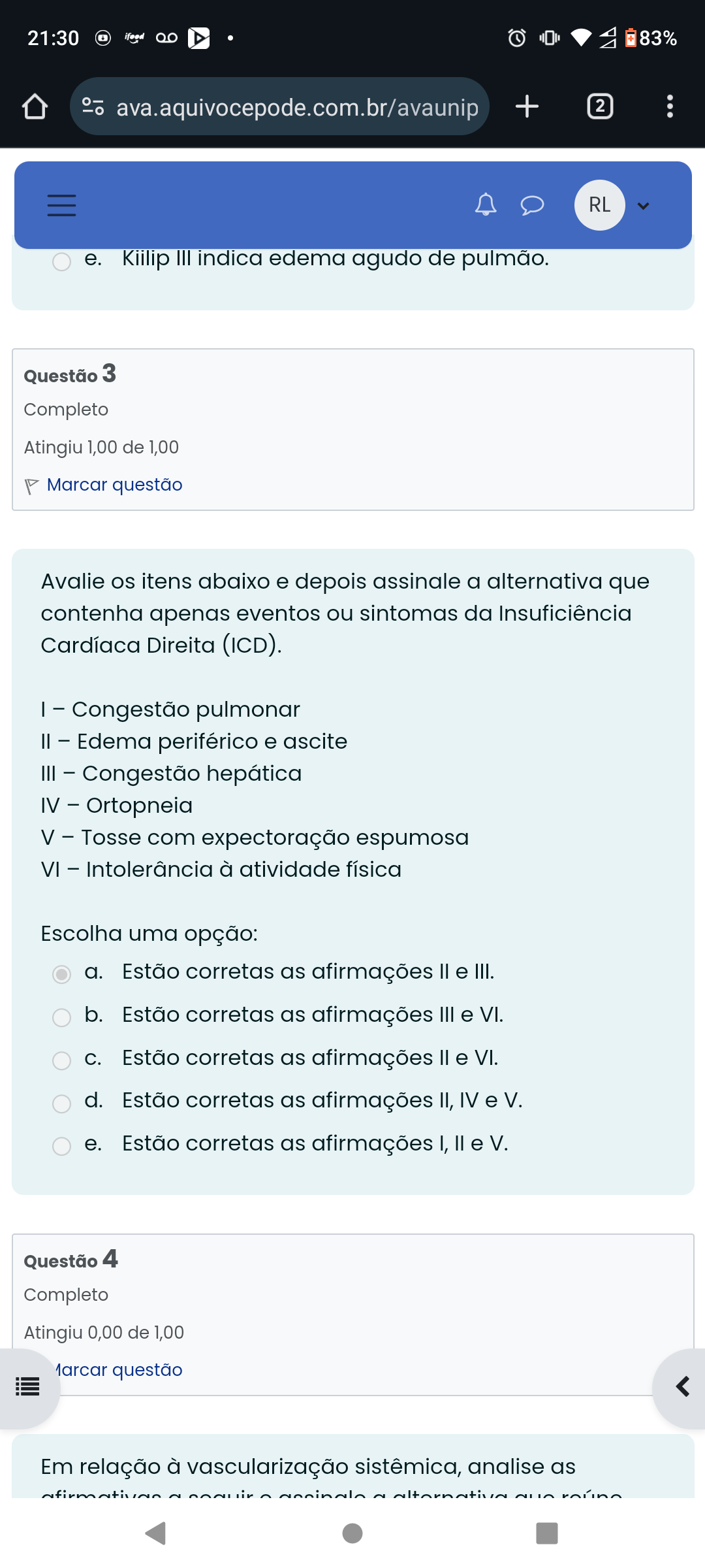 21:30 ifeed 83% ava.aquivocepode.com.br/avaunip + 2 RL e. Kiilip III indica edema agudo de pulmão. Questão 3 Completo Atingiu 1,00 de 1,00 Marcar questão Avalie os itens abaixo e depois assingle a alternativa que contenha apenas eventos ou sintomas da Insuficiência Cardíaca Direita (ICD). I - Congestão pulmonar - Edema periférico e ascite III - Congestão hepática IV - Ortopneia V - Tosse com expectoração espumosa VI - Intolerância à atividade física Escolha uma opção: a. Estão corretas as afirmações e III. b. Estão corretas as afirmações III e VI. C. Estão corretas as afirmações e VI. d. Estão corretas as afirmações II, IV e V. e. Estão corretas as afirmações I, e V. Questão 4 Completo Atingiu 0,00 de 1,00 Marcar questão Em relação à vascularização sistêmica, analise as