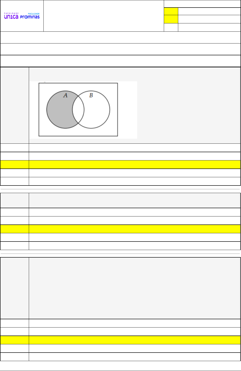 Pincel Atômico - 23/09/2024 00:27:09 1/3 Exercício Caminho do Conhecimento - Etapa 2 (19803) Atividade finalizada em 23/09/2024 00:26:33 (2782428 / 1) LEGENDA Resposta correta na questão # Resposta correta - Questão Anulada X Resposta selecionada pelo Aluno Disciplina: FUNDAMENTOS DA MATEMÁTICA [1165965] - Avaliação com 8 questões, com o peso total de 1,67 pontos [capítulos - 1] Turma: Segunda Graduação: Segunda Graduação 6 meses - Licenciatura em Matemática - Grupo: FPD-JUN/2024 - SGegu0A260624 [130771] Aluno(a): 91636199 - MANUEL LEONIDAS CHANGOLUISA ALQUINGA - Respondeu 8 questões corretas, obtendo um total de 1,67 pontos como nota [360845_170514] Questão 001 Observe o diagrama abaixo com a região pintada e indique a operação que representa essa região. A ∪ B B - A X A - B A A ∩ B [360845_170510] Questão 002 Em uma escola que tem 415 alunos, 221 estudam inglês, 163 estudam francês e 52 estudam ambas as línguas. Quantos alunos não estudam nenhuma das duas? 21 alunos. 36 alunos. X 83 alunos. 52 alunos. 163 alunos. [360845_170555] Questão 003 Considere A, B e C conjuntos quaisquer. Classifique as seguintes afirmativas em verdadeiras ou falsas, e posteriormente marque a alternativa com a sequência correta. - ∅⊂(A∩B) - A⊂(A∩B) - A∈(A∩B) - (A∩B)⊂B - (A∩B)⊃(A∩B∩C) A sequência correta é: V, V, F, F, F F, F, F, V, V X V, F, F, V, V V, V, V, F, F F, V, F, V, V Pincel Atômico - 23/09/2024 00:27:09 2/3 [360845_170559] Questão 004 Considere três conjuntos A, B e C e tais condições. A∪B∪C={z,x,v,u,t,s,r,q,p} A∩B={r,s} B∩C={s,x} C∩A={s,t} A∪C={p,q,r,s,t,u,v,x} A∪B={p,q,r,s,t,x,z} Marque a alternativa que indica corretamente o conjunto B. {t,s,x,u,v} {r,s,u,v} {p,q,r,s} {p,q,r,u,v} X {r,s,z,x} [360845_170558] Questão 005 (PUC/Campinas-SP) Numa comunidade constituída de 1800 pessoas, há três programas de TV favoritos: esportes (E), novelas (N) e humorismo (H). A tabela a seguir indica quantas pessoas assistem a esses programas: Por meio desses dados, verifica-se que o número de pessoas da comunidade que não assistem a qualquer dos três tipos de programas é: 900 n.d.a.. X 200 300 100 [360845_170554] Questão 006 (CRM ES 2016 – Quadrix) Numa pesquisa, verificou-se que, das pessoas consultadas, 100 se informavam pelo site A; 150 por meio do site B; 20 buscavam se informar por meio dos dois sites, A e B; e 110 não se informavam por nenhum desses dois sites. Desse modo, é correto afirmar que o número de pessoas consultadas nessa pesquisa foi de: 380 230 360 X 340 270 [360847_170513] Questão 007 Dados os conjuntos A = {1, 2, 3}, B = {3, 4} e C = {1, 2, 4}, determine o conjunto X tal que X ∪ B = A ∪ C e X ∩ C = ∅. {1, 2, 3} {1, 3} Pincel Atômico - 23/09/2024 00:27:09 3/3 X {1, 2} { 2, 3} { 2, 3, 4} [360845_170512] Questão 008 (Prefeitura de Maracajá - SC – Adaptado) Dado o diagrama a seguir. Os conjuntos X, Y e Z não são vazios. Analise o diagrama e assinale a alternativa verdadeira. X ⊂ Y Z ⊂ Y X Z ⊃ X X ⊄ Z Z – X = Y