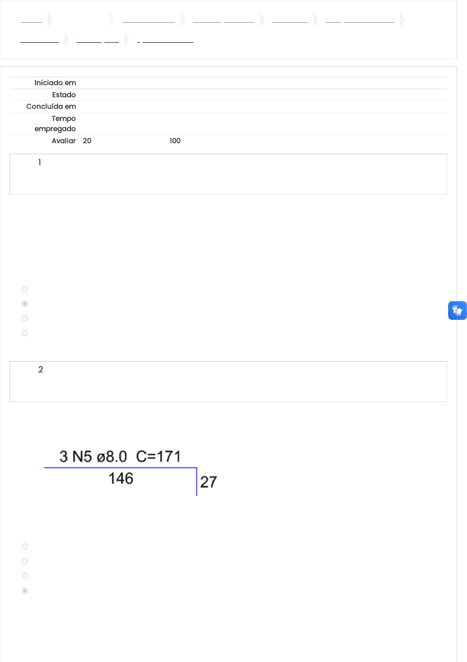 Painel Meus cursos CURSOS FUNEC Graduação - EAD Aluno EAD JUNÇÕES DE TURMA Concreto II AVALIAÇÕES QUESTIONÁRIO 2 Iniciado em Saturday, 16 Nov 2024, 17:30 Estado Finalizada Concluída em Saturday, 16 Nov 2024, 17:32 Tempo empregado 2 minutos 17 segundos Avaliar 20 de um máximo de 20(100%) Questão 1 Completo Atingiu 1 de 1 Questão 2 Completo Atingiu 1 de 1 Um pilar de seção retangular possui as dimensões 0,35m x 0,20cm x 3,5m. Sabendo-se que o custo do concreto para uma determinada construtora é igual a R$ 220,00 para cada m de concreto, determine o custo total do concreto utilizado para produzir esse pilar. Escolha uma opção: a. R$5,39. b. R$53,90; c. R$539,00; d. R$46,20. 3 Analise a figura abaixo e responda qual o comprimento da barra utilizada? Escolha uma opção: a. 8 b. 3 c. 1 d. 171 16/11/2024, 17:32 QUESTIONÁRIO 2 https://ava.funec.br/mod/quiz/review.php?attempt=690095&cmid=26436 1/9 https://ava.funec.br/my/ https://ava.funec.br/course/index.php?categoryid=10 https://ava.funec.br/course/index.php?categoryid=17 https://ava.funec.br/course/index.php?categoryid=19 https://ava.funec.br/course/index.php?categoryid=77 https://ava.funec.br/course/view.php?id=2303 https://ava.funec.br/course/view.php?id=2303#section-6 https://ava.funec.br/mod/quiz/view.php?id=26436 Questão 3 Completo Atingiu 1 de 1 Questão 4 Completo Atingiu 1 de 1 Questão 5 Completo Atingiu 1 de 1 No pilar de canto, a deformação acontece: Escolha uma opção: a. apenas no eixo x b. apenas em uma direção c. apenas no eixo y d. nas duas direções do pilar Determine o momento mínimo de um pilar com dimensão (15x30), com a força característica de 160 KN e coeficiente de correção de 1,20 e comprimento equivalente de 3,0 m. Escolha uma opção: a. eixo x = 2459,5 kN.cm; eixo y = 1250kN.cm b. eixo x = 1250 kN.cm; eixo y = 2459,5 kN.cm; c. eixo x = 125 kN.cm; eixo y = 245,95 kN.cm d. eixo x = 245,95 kN.cm; eixo y = 125 kN.cm; Determine o momento mínimo de um pilar com dimensão (15x25), com a força característica de 125 KN e coeficiente de correção de 1,20 e comprimento equivalente de 2,5 m. Escolha uma opção: a. eixo x = 97,65 kN.cm; eixo y = 160,65 kN.cm b. eixo x = 160,65 kN.cm; eixo y = 97,65 kN.cm; c. eixo x = 1606,5 kN.cm; eixo y = 976,5 kN.cm d. eixo x = 976,5 kN.cm; eixo y = 1606,5 kN.cm; 16/11/2024, 17:32 QUESTIONÁRIO 2 https://ava.funec.br/mod/quiz/review.php?attempt=690095&cmid=26436 2/9 Questão 6 Completo Atingiu 1 de 1 Questão 7 Completo Atingiu 1 de 1 Qual é a armadura transversal de um pilar? Escolha uma opção: a. armadura negativa b. armadura de pele c. estribo d. armadura positiva O mau posicionamento dos pilares, ou mesmo a má avaliação do dimensionamento destes elementos, pode levar a variados problemas, como estruturas pouco estáveis do ponto de vista global, estruturas que não atendem às condições de serviço ou mesmo a um aumento no custo da estrutura. Para tanto, é necessário definir corretamente as áreas de influência dos pilares. Assinale a alternativa que representa corretamente o coeficiente de majoração (α) para pilares de canto: Escolha uma opção: a. 1,8 b. 1,5 c. 1,3 d. 1,2 16/11/2024, 17:32 QUESTIONÁRIO 2 https://ava.funec.br/mod/quiz/review.php?attempt=690095&cmid=26436 3/9 Questão 8 Completo Atingiu 1 de 1 Questão 9 Completo Atingiu 1 de 1 Para efeito de projeto, os pilares podem ser classificados em pilares internos, de extremidade e de canto. Cada um desses tipos básicos corresponde a uma situação de projeto diferente. Considere a distribuição de pilares: Qual destes pilares são considerados pilares de centro? Escolha uma opção: a. P4, P5 e P6 b. P5 e P6 c. P1, P3, P7 e P9 d. P6 Qual a dimensão mínima dos estribos? Escolha uma opção: a. 5 mm b. 15 mm c. 10 mm d. 20 mm 16/11/2024, 17:32 QUESTIONÁRIO 2 https://ava.funec.br/mod/quiz/review.php?attempt=690095&cmid=26436 4/9 Questão 10 Completo Atingiu 1 de 1 Questão 11 Completo Atingiu 1 de 1 Questão 12 Completo Atingiu 1 de 1 Os pilares são elementos lineares que podem estar sujeitos às forças e aos momentos fletores, podendo gerar flexão composta normal e flexão composta oblíqua. Nas solicitações possíveis em pilares, quando ocorre a flexão composta normal? Escolha uma opção: a. Na atuação de uma força cisalhante e fletores em duas direções distintas; b. Na atuação conjunta de força de normal e momento fletor em uma direção; c. Na aplicação de uma força normal no CG da seção transversal no pilar; d. Na atuação conjunta de força de normal e momentos fletores em duas direções distintas. Segundo a NBR 6118, qual a taxa mínima de aço devemos adotar? Escolha uma opção: a. 6 % AC b. 4 % AC c. 8 % AC d. 2 % AC Determine o momento mínimo de um pilar com dimensão (15x25), com a força característica de 200 KN e coeficiente de correção de 1,20 e comprimento equivalente de 3,0 m. Escolha uma opção: a. eixo x = 257,04 kN.cm; eixo y = 156,24 kN.cm b. eixo x = 15,62 kN.cm; eixo y = 25,70 kN.cm; c. eixo x = 156,24 kN.cm; eixo y = 257,04 kN.cm; d. eixo x = 25,70 kN.cm; eixo y = 15,62 kN.cm 16/11/2024, 17:32 QUESTIONÁRIO 2 https://ava.funec.br/mod/quiz/review.php?attempt=690095&cmid=26436 5/9 Questão 13 Completo Atingiu 1 de 1 Questão 14 Completo Atingiu 1 de 1 Analise a figura abaixo e responda quantas barras estão na posição N5? Escolha uma opção: a. 1 b. 3 c. 171 d. 8 Um pilar de seção retangular possui as dimensões 15cm x 35cm x 3m. Sabendo-se que o custo do concreto para uma determinada construtora é igual a R$ 220,00 para cada m de concreto, determine o custo total do concreto utilizado para produzir esse pilar. Escolha uma opção: a. R$3,46. b. R$346,50; c. R$34,65; d. R$3465,00; 3 16/11/2024, 17:32 QUESTIONÁRIO 2 https://ava.funec.br/mod/quiz/review.php?attempt=690095&cmid=26436 6/9 Questão 15 Completo Atingiu 1 de 1 Questão 16 Completo Atingiu 1 de 1 A figura abaixo apresenta qual tipo de pilar? Escolha uma opção: a