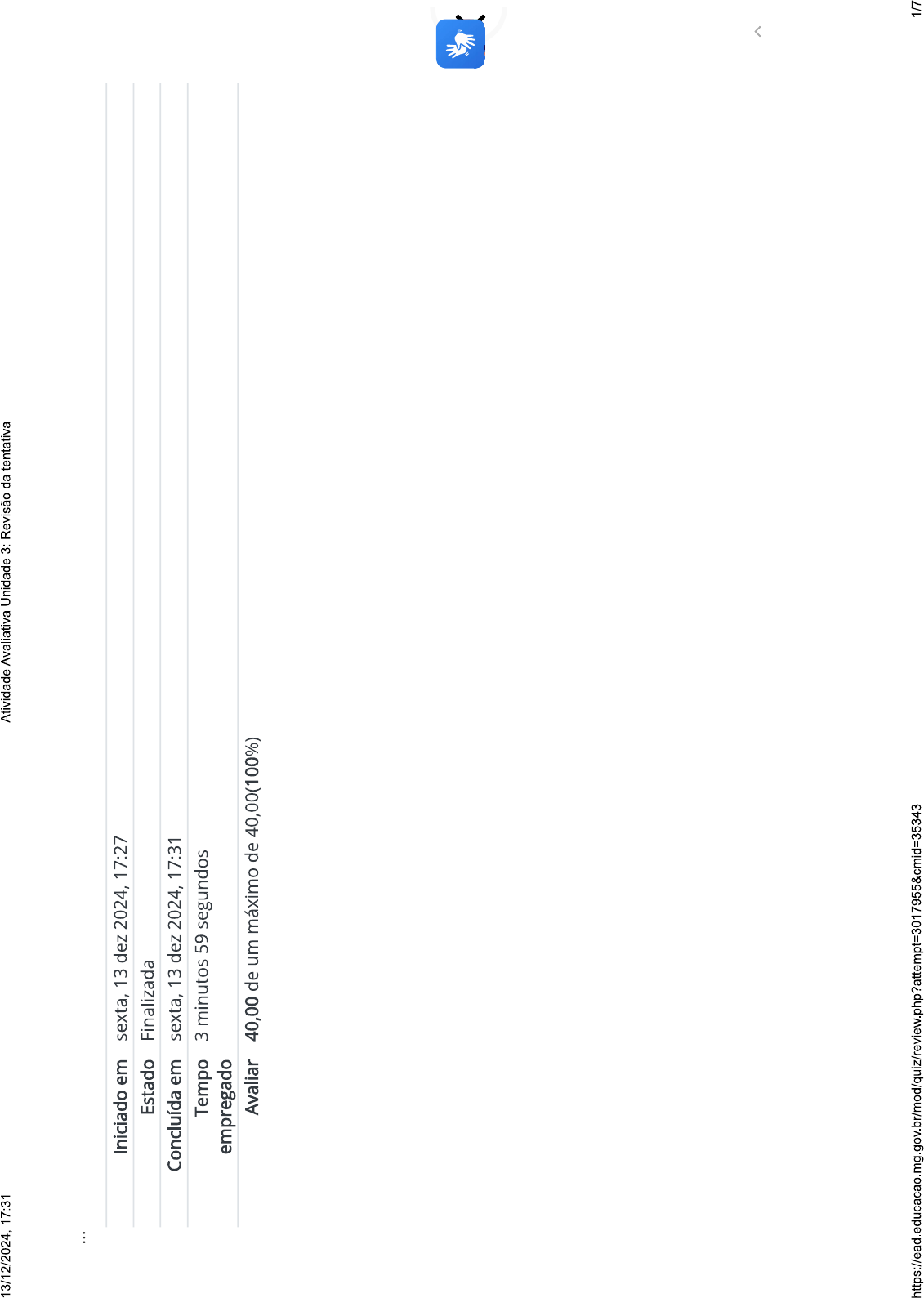 13/12/2024, 17:31 Atividade Avaliativa Unidade 3: Revisão da tentativa Iniciado em sexta, 13 dez 2024, 17:27 Estado Finalizada Concluída em sexta, 13 dez 2024, 17:31 Tempo 3 minutos 59 segundos empregado Avaliar 40,00 de um máximo de 40,00(100%) 1/713/12/2024 17:31 Atividade Avaliativa Unidade 3: Revisão da tentativa Questão 1 Correto Atingiu 8,00 de 8,00 Para orientar o funcionamento do Sistema Único de Saúde (SUS), foram previstos princípios no artigo 198 da Constituição Federal de 1988 e no artigo 7° do Capítulo II da Lei n° 8.080/1990. São princípios orientadores do SUS, EXCETO: A. Universalidade: atendimento a todos, sem distinções ou restrições, oferecendo toda a atenção necessária, sem qualquer custo. B. Integralidade: oferecer a atenção necessária à saúde da população, promovendo ações contínuas de prevenção e tratamento aos indivíduos e às comunidades, em quaisquer níveis de complexidade; C. Equidade: disponibilizar recursos e serviços com justiça, de acordo com as necessidades de cada um, canalizando maior atenção aos que mais necessitam; D. Centralização: é o processo governamental que determina centralizar as responsabilidades de gestão para o estado atendendo às determinações constitucionais e legais que embasam SUS. Sua resposta está correta. https://ead.educacao.mg.gov.br/mod/quiz/review.php?attempt=3017955&cmid=35343 2/713/12/2024, 17:31 Atividade Avaliativa Unidade 3: Revisão da tentativa Questão 2 Correto Atingiu 8,00 de 8,00 A Rede de Atenção à Saúde (RAS) se organiza por meio de pontos de atenção que são locais com a finalidade de ofertar serviços e ações de saúde, de diferentes densidades tecnológicas. Qual a unidade considerada a principal porta de entrada da RAS, sendo ordenadora e coordenadora do cuidado? A. Centro de Especialidades Médicas B. Hospitais Credenciados ao SUS. C. Secretarias Municipais e Estaduais de Saúde D. Atenção Primária à Saúde (APS) Sua resposta está correta. 3/713/12/2024, 17:31 Atividade Avaliativa Unidade 3: Revisão da tentativa Questão 3 Correto Atingiu 8,00 de 8,00 A Atenção Primária à Saúde (APS) é responsável por realizar ações de caráter individual ou coletivo, voltadas à promoção da saúde, prevenção de agravos e doenças, diagnóstico e tratamento precoces, além de do usuário. São ações de responsabilidade da APS no âmbito do Programa Miguilim, EXCETO: A. Tratamento, reabilitação, redução de danos, cuidados paliativos. B. Fornecimento de óculos, conforme fluxo previamente estabelecido. C. Acompanhamento dos estudantes após o encaminhamento para a Atenção Ambulatorial Especializada (AAE) e contrarreferência. D. Promoção e proteção da saúde Sua resposta está correta. 4/713/12/2024, 17:31 Atividade Avaliativa Unidade 3: Revisão da tentativa Questão 4 Correto Atingiu 8,00 de 8,00 A Atenção Especializada (AE) é o conjunto de conhecimentos, práticas assistenciais, ações, técnicas e serviços implicados na produção do cuidado em saúde de maior densidade tecnológica, que se divide em Atenção Ambulatorial Especializada (AAE) e hospitalar. São atribuições da AAE, EXCETO: A. Busca ativa dos estudantes com alteração ocular não agendados para consulta ou faltosos. B. Realizar a consulta oftalmológica por meio da avaliação clínica e de exames diagnósticos. C. Contrarreferenciar os estudantes avaliados para a APS. D. Prescrição de órtese quando recomendado, bem como a concessão dos óculos. Sua resposta está correta. 5/713/12/2024, 17:31 Atividade Avaliativa Unidade 3: Revisão da tentativa Questão 5 Correto Atingiu 8,00 de 8,00 O cuidado compartilhado surge com o reconhecimento de que o processo saúde-doença de uma pessoa é complexo demais para ser coordenado por um profissional sozinho, sendo necessário a ampliação da clínica e do compartilhamento de diagnósticos e propostas de solução, envolvendo os gestores das unidades, os profissionais dos serviços de saúde e os próprios usuários. Uma ferramenta essencial nesse processo é: A. o sistema de referência e contrarreferência, que se refere ao mecanismo estabelecido para a comunicação entre os pontos de atenção. B. Compartilhamento do caso com familiares e responsáveis dos educandos. C. Uso de sistemas de informação para registro dos dados, como por exemplo o e-SUS APS. D. Reunião de Matriciamento com os profissionais das equipes multidisciplinares dos serviços de saúde. Sua resposta está correta. 6/7