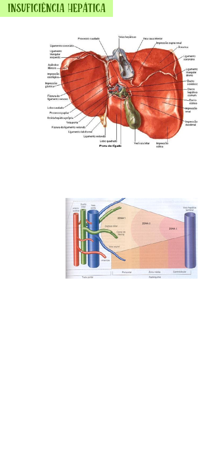 ANATOMIA Dividido em 4 lobos, e na face anterior temos o direito e esquerdo, na posterior temos o quadrado e caudado, e passa na posterior a veia cava que recebe as veias hepáticas direita, esquerda e média O lóbulo é constituído de um centro ocupado pela veia central (hepática ou centrolobular), circundado pelas colunas de hepatócitos, cujos limites são os espaços portais (chegada de sangue). Cada espaço portal é constituído de ductos biliares, um ramo da via porta, um ramo da artéria hepática e linfáticos. Uma unidade anatômica são vários espaços portais delimitando o cordão de hepatócito com uma veia central ao meio; o sangue chega pela veia portal e artéria hepática → sinusoides → veia central → veia hepática → veia cava. E o produto do metabolismo dos hepatócitos volta para o sangue ou a bile volta para os ductos biliares. Ácino – massa de hepatócitos ao redor de uma veia porta central, arteríola hepática e ducto biliar → unidade funcional; dividido em 3 zonas de acordo com o suprimento de sangue e quanto mais próximo ao espaço portal maior o suprimento. Depois que os hepatócitos captam o sangue produzem a bile e devolvem para os canículos que caem no colédoco. FUNÇÕES o Produção de bile o Metabolismo de gorduras (lipogênese) o Conversão de amônia (tóxica) em ureia o Desintoxicação do organismo o Síntese de fatores de coagulação (I, II, V, VII, IX, X, XII, XIII) – dependentes de vitamina K o Armazenamento de vitaminas, Fe (em excesso → hemocromatose) o Destruição de hemácias senescentes o Síntese e metabolismo de glicose, regulação da liberação de insulina, glucagon o Metaboliza hormônios masculinos e femininos – testosterona e estradiol o Síntese de albumina – importante para a osmolaridade do sangue o Síntese do angiotensinogênio o Síntese da ceruloplasmina – proteína de metabolismo do cobre o No primeiro trimestre de gestação é o principal produtor de eritrócitos INSUFICIÊNCIA HEPÁTICA Aguda – destruição hepática reversível em dias ou semanas → se não tratada → cronificação → parênquima hepático fibrosado → insuficiência crônica por intensa lesão de hepatócitos → cirrose A perda de 80 a 90% e lesão → alterações, ou seja, com 20% o fígado ainda funciona. Causas o Hepatites virais – B, C ou D o Lesão hepática induzida por álcool o Esteatohepatite não alcóolica – fígado impregnado por gordura, falta de exercícios o Hepatite autoimune – sistema imune lesionando os hepatócitos (LES, colangite primária) o Lesão hepática induzida por medicamentos – amoxicilina, carbamazepina, anti-hipertensivos Isabel Santos o Desarranjos vasculares – insuficiência cardíaca direita → o sangue vindo da veia cava inferior que recebe as 3 veias hepáticas → AD → VD – se o coração está fraco terá retorno venoso até o fígado e causar insuficiência hepática. Síndrome de Budd-Chiari – obstrução de veias hepáticas por coágulos → causando represamento de sangue no parênquima hepático; e temos doenças relacionadas às síndromes mieloproliferativas (policitemia, mielofibrose), gravidez, uso de anticoncepcional o Desordens biliares Cirrose ou colangite biliar primária – doença autoimune que ataca ductos biliares → bilirrubina represada no fígado → lesão dos hepatócitos → insuficiência hepática que evolui para cirrose Fibrose cística ou mucoviscidose → enzima que regula as secreções glandulares é deficiente → ↑muco muito espesso → alterações pulmonares, pancreáticas e intestinais o Doenças metabólicas Doença de Wilson – deficiência de ceruloplasmina – enzima responsável pelo carreamento do cobre no corpo → a deficiência na produção causa deposição de cobre → depositando-se no fígado causa a insuficiência Hemocromatose – doença ligada ao metabolismo do Fe → mutação do gene que regula absorção de ferro na luz intestinal → ↑absorção → depósitos de ferro em qualquer local (pele e no fígado) Deficiência de alfa1antitripsina → enzima protetora de membrana (incluída no teste do pezinho) produzida no fígado → quando produzida de forma anormal → cirrose e enfisema (se deposita nos pulmões) CIRROSE E SUAS SEQUELAS Hipertensão portal – se tem um paciente com insuficiência evoluindo para cirrose, temos um fígado rígido e com cicatriz fibrosa → dificulta o sangue chegar pela veia porta devido a resistência aumentada no fígado → ↑pressão na veia porta → dilata a veia → sai o liquido para a cavidade abdominal → ascite → e o sangue retorna para a veia esplênica → esplenomegalia (sequestro de plaquetas →plaquetopenias); e o sangue pode voltar pelas veias gástricas → dilatação do vasos do estômago e esôfago → varizes; o retorno venoso aumentado da veia mesentérica inferior → varizes hemorroidárias; circulação colateral por retorno venoso para vasos superficiais o Circulação colateral o Hipoalbuminemia – começa a ter disfunção da osmolaridade sanguínea → líquido cai na cavidade o Coagulopatia (↓produção → sangramentos espontâneos) o Hiperamoniemia – acumulo de amônia (toxica) → não é convertida em ureia → pode evolui com confusão mental, fraqueza, sonolência, convulsão e coma o Icterícia o Desnutrição proteico calórica – má absorção de nutriente e perda de reservas de vitaminas hidrossolúveis e oligoelementos → perda da capacidade hepática de armazenamento o Colelitíase – deposição de cálculos biliares o Prurido – causado pela ↑bilirrubina → coceira o Alteração no metabolismo dos medicamentos o Insuficiência gonadal – homens com ginecomastia e mulheres com irregularidades menstruais e infertilidade HIPOALBUMINEMIA Quase sempre presente na cirrose. Não é um marcador perfeito de função hepática – tem indivíduo que pode ter, mas por deficiência nutricional, outros podem ser devido 
