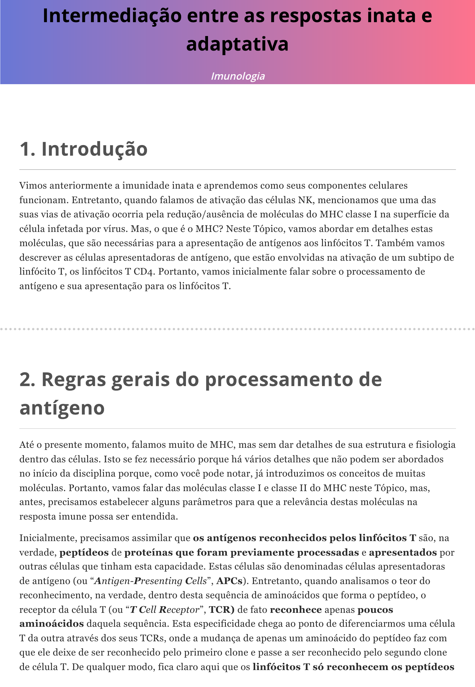 20/03/2023, 15:07 Intermediação entre as respostas inata e adaptativa https://ceadsaladeaula.uvv.br/conteudo.php?aula=intermediacao-entre-as-respostas-inata-e-adaptativa&dcp=imunologia&topico=3 1/10 Intermediação entre as respostas inata e adaptativa Imunologia 1. Introdução Vimos anteriormente a imunidade inata e aprendemos como seus componentes celulares funcionam. Entretanto, quando falamos de ativação das células NK, mencionamos que uma das suas vias de ativação ocorria pela redução/ausência de moléculas do MHC classe I na superfície da célula infetada por vírus. Mas, o que é o MHC? Neste Tópico, vamos abordar em detalhes estas moléculas, que são necessárias para a apresentação de antígenos aos linfócitos T. Também vamos descrever as células apresentadoras de antígeno, que estão envolvidas na ativação de um subtipo de linfócito T, os linfócitos T CD4. Portanto, vamos inicialmente falar sobre o processamento de antígeno e sua apresentação para os linfócitos T. 2. Regras gerais do processamento de antígeno Até o presente momento, falamos muito de MHC, mas sem dar detalhes de sua estrutura e fisiologia dentro das células. Isto se fez necessário porque há vários detalhes que não podem ser abordados no início da disciplina porque, como você pode notar, já introduzimos os conceitos de muitas moléculas. Portanto, vamos falar das moléculas classe I e classe II do MHC neste Tópico, mas, antes, precisamos estabelecer alguns parâmetros para que a relevância destas moléculas na resposta imune possa ser entendida. Inicialmente, precisamos assimilar que os antígenos reconhecidos pelos linfócitos T são, na verdade, peptídeos de proteínas que foram previamente processadas e apresentados por outras células que tinham esta capacidade. Estas células são denominadas células apresentadoras de antígeno (ou “Antigen-Presenting Cells”, APCs). Entretanto, quando analisamos o teor do reconhecimento, na verdade, dentro desta sequência de aminoácidos que forma o peptídeo, o receptor da célula T (ou “T Cell Receptor”, TCR) de fato reconhece apenas poucos aminoácidos daquela sequência. Esta especificidade chega ao ponto de diferenciarmos uma célula T da outra através dos seus TCRs, onde a mudança de apenas um aminoácido do peptídeo faz com que ele deixe de ser reconhecido pelo primeiro clone e passe a ser reconhecido pelo segundo clone de célula T. De qualquer modo, fica claro aqui que os linfócitos T só reconhecem os peptídeos 20/03/2023, 15:07 Intermediação entre as respostas inata e adaptativa https://ceadsaladeaula.uvv.br/conteudo.php?aula=intermediacao-entre-as-respostas-inata-e-adaptativa&dcp=imunologia&topico=3 2/10 apresentados pelas APCs do indivíduo onde estas células T foram geradas; ou seja, há uma restrição ao reconhecimento de peptídeos apresentados pelas próprias moléculas do MHC do organismo, que é conhecido como restrição ao próprio. Perfeito! Então, já sabemos que os linfócitos/células T reconhecem apenas peptídeos que são apresentados via MHC. Mas, ainda há mais detalhes: há duas classes de proteínas do MHC chamadas de classe I e classe II. Elas estão envolvidas na apresentação de peptídeos para subclasses de linfócitos/células T. As células T CD4 reconhecem peptídeos apresentados via MHC classe II, enquanto as células T CD8 via MHC classe I. Usualmente, as células T CD4 reconhecem peptídeos derivados do processamento de proteínas extracelulares, enquanto células T CD8 reconhecem peptídeos do processamento de proteínas presentes no citosol da célula. Porém, há alguns clones de células T (por exemplo, células NKT) que reconhecem lipídios ou glicolipídios apresentados pela molécula CD1, que é não-polimórfica (com pouca variação) e semelhante à molécula MHC classe I. Mas, estas células estão presentes em menor número e não são responsáveis pelos mecanismos predominantes de homeostase da resposta imune dentro do organismo. Portanto, nós vamos focar nas moléculas MHC classe I e II neste Tópico. Há mais um detalhe que será novamente mencionado neste Tópico: a expressão de MHC classe I e classe II não é idêntica nas células do nosso organismo. A expressão de MHC classe I ocorre em todas as células nucleadas; já a expressão de MHC classe II ocorre apenas numa categoria de células denominadas “células apresentadoras de antígeno”, as células que vamos descrever a seguir. Interação entre célula apresentadora de antígeno e célula T CD4. 3. As células apresentadoras de antígeno https://cead.uvv.br/conteudo/wp-content/uploads/2019/06/AULA_imu_top03_img02-768x576.jpg 20/03/2023, 15:07 Intermediação entre as respostas inata e adaptativa https://ceadsaladeaula.uvv.br/conteudo.php?aula=intermediacao-entre-as-respostas-inata-e-adaptativa&dcp=imunologia&topico=3 3/10 As células apresentadoras de antígeno (APCs) têm a capacidade de processar e apresentar os peptídeos de proteínas nas suas moléculas do MHC. Elas desempenham duas funções muito importantes na ativação de linfócitos T: 1) Processam os antígenos a serem apresentados; 2) Fornecem o segundo sinal para ativação das células T (coestimulação). A apresentação de antígeno é aumentada pela exposição aos produtos microbianos, que são reconhecidos via TLRs, por exemplo. Quando isso acontece, as APCs expressam moléculas coestimuladoras, produzem citocinas e podem também expressar receptores de quimiocinas, estas últimas levando-as aos locais de infecção, amplificando a apresentação de antígenos às células T do local. Diferentes tipos de células podem exercer a função de APC para ativar células T naïve ou efetoras. Entre as células que são reconhecidas dentro da categoria de APC profissionais (APCs que expressam MHC classe II e moléculas coestimuladoras), encontramos macrófagos, células B e células dendríticas (DCs). Macrófagos, pela sua local