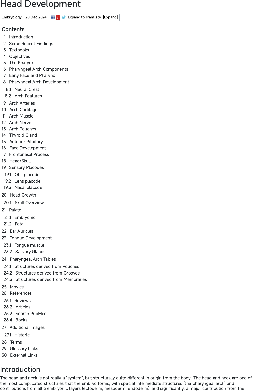 [Expand] Head Development Embryology - 20 Dec 2024 Expand to Translate Contents 1 Introduction 2 Some Recent Findings 3 Textbooks 4 Objectives 5 The Pharynx 6 Pharyngeal Arch Components 7 Early Face and Pharynx 8 Pharyngeal Arch Development 8�1 Neural Crest 8�2 Arch Features 9 Arch Arteries 10 Arch Cartilage 11 Arch Muscle 12 Arch Nerve 13 Arch Pouches 14 Thyroid Gland 15 Anterior Pituitary 16 Face Development 17 Frontonasal Process 18 Head/Skull 19 Sensory Placodes 19�1 Otic placode 19�2 Lens placode 19�3 Nasal placode 20 Head Growth 20�1 Skull Overview 21 Palate 21�1 Embryonic 21�2 Fetal 22 Ear Auricles 23 Tongue Development 23�1 Tongue muscle 23�2 Salivary Glands 24 Pharyngeal Arch Tables 24�1 Structures derived from Pouches 24�2 Structures derived from Grooves 24�3 Structures derived from Membranes 25 Movies 26 References 26�1 Reviews 26�2 Articles 26�3 Search PubMed 26�4 Books 27 Additional Images 27�1 Historic 28 Terms 29 Glossary Links 30 External Links Introduction The head and neck is not really a "system", but structurally quite different in origin from the body. The head and neck are one of the most complicated structures that the embryo forms, with special intermediate structures (the pharyngeal arch) and contributions from all 3 embryonic layers (ectoderm, mesoderm, endoderm), and significantly, a major contribution from the https://embryology.med.unsw.edu.au/embryology/index.php?title=Main_Page https://embryology.med.unsw.edu.au/embryology/index.php?title=File:Facebook_16x16.png https://embryology.med.unsw.edu.au/embryology/index.php?title=File:Facebook_16x16.png https://embryology.med.unsw.edu.au/embryology/index.php?title=File:Pinterest_16x16.png https://embryology.med.unsw.edu.au/embryology/index.php?title=File:Pinterest_16x16.png https://embryology.med.unsw.edu.au/embryology/index.php?title=File:Twitter_16x16.png https://embryology.med.unsw.edu.au/embryology/index.php?title=File:Twitter_16x16.png https://embryology.med.unsw.edu.au/embryology/index.php?title=Pharyngeal_arches https://embryology.med.unsw.edu.au/embryology/index.php?title=Ectoderm https://embryology.med.unsw.edu.au/embryology/index.php?title=Mesoderm https://embryology.med.unsw.edu.au/embryology/index.php?title=Endoderm https://embryology.med.unsw.edu.au/embryology/index.php?title=Neural_Crest_Development https://embryology.med.unsw.edu.au/embryology/index.php?title=Pharyngeal_arches https://embryology.med.unsw.edu.au/embryology/index.php?title=Ectoderm https://embryology.med.unsw.edu.au/embryology/index.php?title=Mesoderm https://embryology.med.unsw.edu.au/embryology/index.php?title=Endoderm https://embryology.med.unsw.edu.au/embryology/index.php?title=Neural_Crest_Development Fetal head (week 12) [Expand] [Expand] [Expand] [Expand] [Expand] neural crest. Neural crest contributes jaw skeletal elements, connective tissues and tendons. The associated muscles derive mainly from cranial mesoderm. These components though will form different structures dependent upon which arch they are within. The cavity within the pharyngeal arches forms the pharynx. The pharynx contributes to 2 endocrine organs, in the roof the pituitary (hypophysis) and the floor the thyroid. The thyroid gland, being one of the first endocrine organs to be formed, has an important role in embryonic development. The pharynx floor of all arches also contribute to the formation of the tongue. Because the head contains many different structures also review notes on: skull, sensory (placode, vision, hearing, smell, taste), respiratory (pharynx), integumentary(tooth, hair) and endocrine (pituitary, thyroid, parathyroid, thymus). Head Links: Introduction | Medicine Lecture | Medicine Lab | Science Lecture | Lecture Movie | Science Lab | pharyngeal arch | Craniofacial Seminar | mouth | palate | tongue | placode | skull | neural crest | Head and Face Movies | head abnormalities | Category:Head Historic Head Embryology Some Recent Findings Review - MR Imaging of the Fetal Face "The human face is a complex anatomic structure with an equally complex embryologic development. Derangement of the developmental process can result in various structural anomalies, which range from a mainly cosmetic deformity, such as cleft lip, to potentially life�threatening conditions such as arhinia. These anomalies (a) can occur as isolated anomalies; (b) can be associated with intracranial, spinal, or dental anomalies; or (c) can be a part of various syndromes, thus serving as diagnostic clues in such cases. Proper evaluation of fetal facial deformities can help in prognostication, family counseling, and prenatal or early postnatal intervention. Ultrasonography (US) is the first line of investigation in these cases. However, when US does not allow complete evaluation of these anomalies owing to its inherent limitations, magnetic resonance (MR) imaging allows comprehensive evaluation of the anomaly itself and also evaluation of various associations and the treatment approach. The embryology of the fetal facial structures is considered with regard to the MR imaging technique and the MR imaging anatomy. The MR imaging features of various structural anomalies are described and classified into six groups, namely, orofacial clefts, orbital anomalies, nasal anomalies, facial masses, external ear anomalies, and abnormal face shape or profile." Magnetic Resonance Imaging Branchial anomalies in children: A report of 105 surgical cases "Branchial anomalies (BAs) account for 20% of all congenital masses in children. We sought to review the incidence of involvement of individual anomalies, diagnostic methods, surgical treatment, and complications of BAs in children. ...A total of 33 (31�4%) cases presented with first BAs, 13 (12�4%) presented with second BAs, and 59 (56�2%) presented with third and fourth BAs, including 6 cases of congenital lower neck cutaneous fistula." More recent papers Older papers Textbooks The Developing Human: Clini