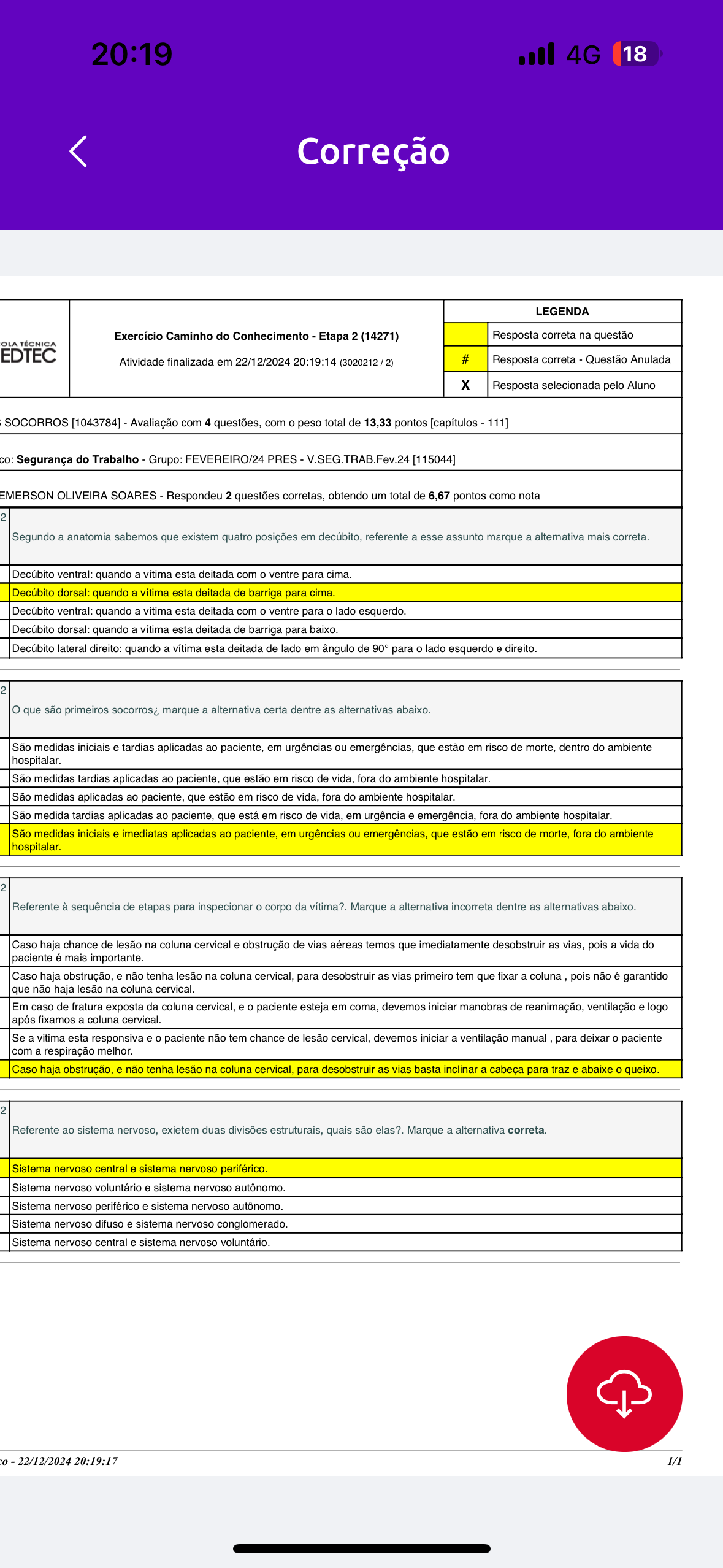 20:19 4G 18 Correção LEGENDA Exercício Caminho do Conhecimento Etapa 2 (14271) Resposta correta na questão OLA TÉCNICA EDTEC Atividade finalizada em 22/12/2024 20:19:14 (3020212 / # Resposta correta Questão Anulada X Resposta selecionada pelo Aluno SOCORROS [1043784] - Avaliação com 4 questões, com o peso total de 13,33 pontos [capítulos 111] Segurança do Trabalho Grupo: FEVEREIRO/24 PRES [115044] EMERSON OLIVEIRA SOARES - Respondeu 2 questões obtendo um total de 6,67 pontos como nota 2 Segundo a anatomia sabemos que existem quatro posições em referente a esse assunto marque a alternativa mais correta. Decúbito ventral: quando a vítima esta deitada com o ventre para cima. Decúbito dorsal: quando a vítima esta deitada de barriga para Decúbito ventral: quando a vítima esta deitada com o ventre para o lado esquerdo. Decúbito dorsal: quando a vítima esta deitada de barriga para baixo. Decúbito lateral direito: quando a vítima esta deitada de lado em ângulo de 90° para o lado esquerdo e direito. 2 o que são primeiros marque a alternativa certa dentre as alternativas abaixo. São medidas iniciais e tardias aplicadas ao paciente, em urgências ou emergências, que estão em risco de morte, dentro do ambiente hospitalar. São medidas tardias aplicadas ao paciente, que estão em risco de vida, fora do ambiente hospitalar. São medidas aplicadas ao paciente, que estão em risco de vida, fora do ambiente hospitalar. São medida tardias aplicadas ao paciente, que está em risco de vida, em urgência e emergência, fora do ambiente hospitalar. São medidas iniciais e imediatas aplicadas ao paciente, em urgências ou emergências, que estão em risco de morte, fora do ambiente hospitalar. 2 Referente à sequência de etapas para inspecionar o corpo da Marque a alternativa incorreta dentre as alternativas abaixo. Caso haja chance de lesão na coluna cervical e obstrução de vias aéreas temos que imediatamente desobstruir as vias, pois a vida do paciente é mais importante. Caso haja obstrução e não tenha lesão na coluna para desobstruir as vias primeiro tem que fixar a coluna pois não é garantido que não haja lesão na coluna Em caso de fratura exposta da coluna cervical, e o paciente esteja em devemos iniciar manobras de reanimação, ventilação e logo após fixamos a coluna Se a vitima esta responsiva e o paciente não tem chance de lesão cervical, devemos iniciar a ventilação manual para deixar o paciente com a respiração melhor. Caso haja obstrução, e não tenha lesão na coluna cervical, para desobstruir as vias basta inclinar a cabeça para traz e abaixe o queixo. 2 Referente ao sistema nervoso. exietem duas divisões estruturais, quais são Marque a alternativa correta. Sistema nervoso central e sistema nervoso periférico. Sistema nervoso voluntário e sistema nervoso autônomo. Sistema nervoso periférico e sistema nervoso autônomo. Sistema nervoso difuso e sistema nervoso conglomerado. Sistema nervoso central e sistema nervoso voluntário. to 22/12/2024 20:19:17 1/1