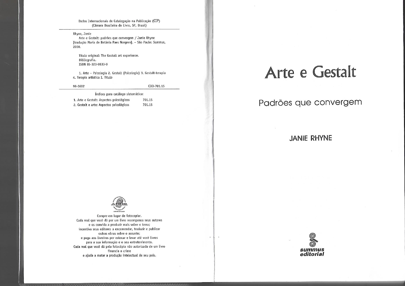 Dados Internacionais de Catalogação na Publicação (CIP) (Câmara Brasileira do Livro, SP, Brasil) Rhyne, Janie Arte e Gestalt: padrões que convergem / Janie Rhyne [tradução Maria de Betânia Paes Norgren]. - São Paulo: Summus, 2000. Título original: The Gestalt art experience. Bibliografia. ISBN 85-323-0633-0 1. Arte - Psicologia 2. Gestalt (Psicologia) 3. Gestalt-terapia 4. Terapia artística I. Título Arte e Gestalt 99-0602 Índices para catálogo sistemático: 1. Arte e Gestalt: Aspectos psicológicos 701.15 2. Gestalt e arte: Aspectos psicológicos 701.15 Padrões que convergem JANIE RHYNE BDR EDITORA Compre em lugar de fotocopiar. Cada real que você dá por um livro recompensa seus autores e os convida a produzir mais sobre o tema; incentiva seus editores a encomendar, traduzir e publicar outras obras sobre assunto; e paga aos livreiros por estocar e levar até você livros para a sua informação e o seu entretenimento. Cada real que você dá pela fotocópia não autorizada de um livro o crime summus e ajuda a matar a produção intelectual de seu país. editorialDo original em língua inglesa THE GESTALT ART EXPERIENCE Patterns that connect Copyright 1996 by Magnolia Street Publishers SUMÁRIO Direitos desta tradução adquiridos por Summus Editorial Tradução: Maria de Betânia Paes Norgren Capa: Nelson Mielnik/Sylvia Mielnik Editoração: Acqua Estúdio Gráfico Apresentação à edição brasileira 9 Introdução à nova edição americana - Janie Rhyne 13 Metade do século XX 13 Escolhendo a vida 16 A era hippie 19 Grupo de treinamento experiencial 21 Os anos ativistas 21 Experiência gestáltica de arte 22 Associação Americana de Arteterapia 23 Prefácio - Joen Fagan 25 Summus Editorial Apresentação Joseph Downing 29 Departamento editorial: Introdução Janie Rhyne 31 Rua Itapicuru, 613 - andar 05006-000 - São Paulo - SP Parte 1 Fone: (11) 3872-3322 Fax: (11) 3872-7476 A Experiência de Arte em Processos Terapêuticos de http://www.summus.com.br Crescimento 35 e-mail: summus@summus.com.br Atendimento ao consumidor: 1. o que é experiência gestáltica de arte? 37 Summus Editorial Uma estrutura gestáltica 37 Fone: (11) 3865-9890 Experiência gestáltica de arte 39 Vendas por atacado: Meu imaginário particular 44 Fone: (11) 3873-8638 Fax: (11) 3873-7085 e-mail: vendas@summus.com.br 2. Experiências terapêuticas com arte 53 Ensinando e aprendendo com crianças 53 Impresso no BrasilTranspondo algumas lacunas 60 8. Vivendo com os outros 197 Espaço para ser você mesmo 197 Também/e 65 Nós e eles 72 Dividindo espaço 207 Fantasia no espaço 212 Riachos da vida 76 3. Crescendo com a experiência de arte 90 Parte 4 Usando a fantasia para encontrar a realidade 90 Usando a Experiência Gestáltica de Arte com os Outros 217 Pessoas em processo 99 9. Grupos de experiência gestáltica de arte 219 Suposições 219 Parte 2 Pacientes externos e outros 224 Experiência com Arte para o Contato e a Comunicação 123 Grupos em andamento 231 125 Sugestões a dirigentes de grupo 235 4. Tornando-se consciente (aware) e dando atenção Todos em processo 125 10. Trabalhando juntos 243 Funcionando plenamente 126 Fazendo um mundo 243 Imagens sombrias 129 Dez mundos 244 Percepções pessoais 132 Um mundo que explodiu 248 Memórias sensoriais 134 Construindo um mundo 255 5. Enviando e recebendo mensagens 139 Apêndice: Materiais 257 Visualizando o todo 139 Papel 257 Estilos de vida e de arte 141 Pastel seco, giz de cera 259 Conteúdo 142 Canetas hidrocor 260 Meio e expressão 144 Tinta para mural 260 Tinta nanquim 261 Parte 3 Colas 261 Usando a Experiência Gestáltica de Arte para si Mesmo 149 Pincéis 261 Argila 262 6. Fazendo o que vem naturalmente 151 Tesouras 262 Fazendo suas marcas 151 Estiletes 262 Diretrizes 154 Arames 262 Comece onde você está 156 Vários recipientes 262 Usando a linguagem da arte 159 Rabiscando 161 Posfácio - Janie Rhyne 264 Símbolos 164 Transições 264 Animando a você mesmo 168 Procurando e encontrando tempo sozinha 265 Cibernética na arteterapia 267 7. Conhecendo-se melhor 176 Tributo 272 Invadindo sua própria privacidade 176 Movendo-se com sua direção 178 Bibliografia das publicações de Janie Rhyne 275 Criando sua própria imagem 180 Você no curso da sua vida 187 Bibliografia 277A EDIÇÃO BRASILEIRA Tive o privilégio de conhecer Janie Rhyne pessoalmente em 1978, na IX Conferência da Associação Americana de Arteterapia, em Los An- geles. Impressionou-me sua forma provocativa, inteligente, ao mesmo tempo que charmosa e cativante de apresentar suas idéias. Na época eu estava no meio de um mestrado em arteterapia na Universidade da Ca- lifórnia, Sacramento, onde encontrei uma orientação analítica predomi- nantemente diagnóstica que não me entusiasmou. Ao vê-la e ouvi-la falar nessa conferência me encantei. Era o que eu estava procurando! Eu já conhecera a abordagem da Gestalt-terapia alguns anos an- tes como cliente, no início da década de 1970, sentindo-me fascinada pela sua proposta existencial e pelo seu impacto mobilizador e trans- formador. Havia vivenciado a qualidade profundamente reveladora do mergulho na emoção e na experiência direta proporcionados pelos experimentos propostos, assim como a qualidade da presença envol- vida, genuína e mais horizontal da relação terapêutica. Comparada às sessões de terapia mais convencionais que eu havia experienciado, a Gestalt-terapia me parecera absolutamente revolucionária e inovado- ra. Havia também estudado arteterapia em Israel com o prof. Peretz Hesse, por intermédio de quem tive os primeiros contatos com os fun- damentos básicos da fenomenologia, abordagem que provocara uma ruptura na epistemologia científica tradicional. Com ele estudei a postura fenomenológica em arteterapia, e o método, ex- tremamente criterioso, de abordar a delicada questão das interpreta- ções e atribuições de significado. 9Assim, ao conhecer Janie Rhyne, senti que havia encontra