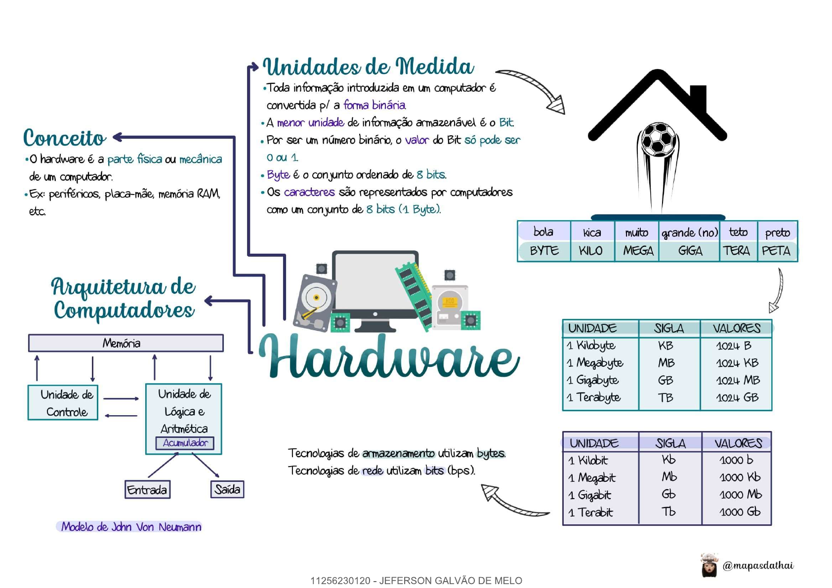 Unidades de Medida Toda informação introduzida em um computador é convertida pl a forma A menor unidade de informação armazenável é Bit Conceito Por ser um número binário, valor do Bit só pode ser hardware é a parte física ou mecânica ou 1 de um computador. Byte é o conjunto ordenado de 8 Ex: placa-mãe, RAM, Os caracteres são representados por computadores como um conjunto de 8 bits (1 Byte). bola kica muito grande (no) teto preto BYTE KILO MEGA GIGA TERA PETA Arquitetura de Computadores UNIDADE SIGLA VALORES Hardware 1 Kilobyte KB 1024 B 1 Megabyte MB 1024 KB 1 Gigabyte GB 1024 MB Unidade de Unidade de 1 Terabyte TB 1024 GB Controle Lógica e Acumulador UNIDADE SIGLA VALORES Tecnologias de armazenamento utilizam 1 Kilobit Kb 1000 b Tecnologias de rede utilizam bits (bps). 1 Megabit Mb 1000 Kb Entrada Saída 1 Gigabit Gb 1000 Mb 1 Terabit Tb 1000 Gb Modelo de John Von Neumann @mapasdathai 11256230120 JEFERSON GALVÃO DE MELOTeclado Apontador Principal forma de entrada de dados Dispositivo de entrada. Impressora primeiro e mais popular é mouse. Dispositivo de saída. também Trackpad/Touchpad (painel tátil), Padrões de teclas: QWERTY e DVORAK Permite a impressão de dados para um papel comum em e Trackball (esfera mo- Mais utilizado. vimentada pelo usuário), este último quase não MATRICIAL utiliza decalcação (com microagulhas ou de Layout ABNT E ABNT2 é mais utilizado. roda de caracteres). Ainda são utilizadas em empre- Mais utilizado no sas que precisam arquivar segundas vias de docu- Baixa resolução. possuem - - a diferença é que ABNT2 possui a tecla ALT GR ao lado di- Hardware JATO DE TINTA (Deskjet): utiliza impressão reito da barra de Espaço. Principais Periféricos e mica com cartucho de Permite impressão colo- rida e possui boa resolução. Dispositivos de E/S Monitor LASER (Laserjet): funcionamento envolve fuso- Dispositivo de saída padrão do computador. TIPOS DE MONITOR res, toner e um cilindro com carga Funciona em Sistema RGB. em geral - positiva (energia Tem a cor de luz é apresentada por meio de CRT: canhão de elétrons -> células de fósforo -> melhor resolução e a maior velocidade tubos de raios catódicos. = quantidade de pixels que podem ionização de gases nobres (plasma) em MULTIFUNCIONAL Dispositivo de entrada e saída ser exibidos em uma tela de forma vertical ou células revestidas de fósforo. que, além de imprimir documentos, exerce outras horizontal LCD (DSTN): reflexo da luz através de funções, como as de copiadora e de scanner. Principais Resoluções Largura x Altura Proporção Total de Pixels cias de material Utiliza Matriz Passiva. SVGA 800 600 480.000 LCD (TFT): Utiliza Thin-Film Transistor (TFT) e HD 1280 720 921600 Resolução de DPI (Dots Per Inch), também FULL HD 1920 1080 2.073.600 Matriz Ativa. chamada de PPP (Pontos por Polegada). 4K ULTRA HD 3840 X 2160 8.294.400 LED: iluminação de diodos de luz LED), 8K UHDTV 7680 X 4320 33.177.600 Velocidade de PPM (Páginas por que não levam mercúrio em sua composição. @mapasdathai 11256230120 JEFERSON GALVÃO DE MELOFunção Componentes on-board Componentes off-board Também chamada de Motherboard, é a Já vêm nativamente integrados, embutidos e Podem ser comprados, principal placa do computador, responsável soldados na e instalados pela comunicação entre todos componentes Têm tamanho menor e são mais baratos. Têm tamanho maior e são mais caros. através de barramentos. Não possuem memória e processamento Têm e processamento Também alimenta alguns com a próprios, por isso têm menor desempenho. Fácil substituição. energia elétrica que recebe da fonte de Não admitem expansão nem troca. Indicadas quem precisa de desempenho gráfico. alimentação. Barramentos BIOS Basic Input/Output System Conjunto de linhas ou fios de comunicação um firmware pré-instalado em um chip de memó- que permitem a interligação entre dispositi- ria da placa-mãe ROM). vos de transmissão de informações por meio de sinais elétricos. Hardware Responsável pelo suporte básico de acesso ao hardware durante processo de inicialização do Todos componentes de um computador computador. são conectados à placa-mãe a partir do Placa-Mãe É primeiro software a rodar quando se liga computador, verificando se componentes ins- PASSO A PASSO DA BIOS: talados na placa-mãe funcionam. Também fornece serviços de carga de sistemas Power Bios Teste de operacionais (boot). Hardware BARRAMENTO USB: transfere dados de Boot Master Boot SETUP: realiza configurações da máquina forma serial, bidirecional e universal Loader Record POST (Power-On Self Test): conjunto de auto Seus conectores possuem 4 contatos, 2 são Inicialização testes realizados pela máquina pl verificar se ela transmissão de dados e 2 pl transmissão do Kernel está funcionando perfeitamente e se possui re- de eletricidade (5V) Logon Windows cursos mínimos pl entrar em operação. @mapasdathai 11256230120 JEFERSON GALVÃO DE MELONúcleos (Cores) Processador multicores possui dois ou + núcleos de processamento Função (cores) no interior de um único chip. .Controla componentes do computador e COMPONENTES FUNDAMENTAIS processa dados. confunda com gabinete! Unidade de Unidade Lógica e A CPU é instalada na + + Registradores Controle (UC) (ULA) Mais rápidas Menor tempo de acesso Hardware Unidade Logica e Aritmética (ULA) Menor capacidade Responsável pela execução de operações Mais caras Unidade Central de e Entre todas as memórias Processamento (CPU) números existentes em um computador. da UC; e Registradores .estado do comando após a Utiliza registradores como memória (em geral). Pequenas unidades de memória volátil, estática e de alta Armazenam resultados temporários de operações durante ciclo de Utilizado também na transferência de dados entre pro- cessador e a memória de um computador. @mapasdathai 11256230120 JEFERSON GALVÃO DE MELOCACHE MAGNÉTICAS ÓPTICAS RAM Random Access 