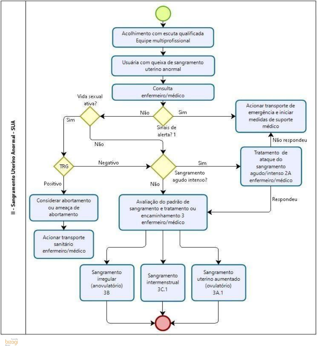 II - SANGRAMENTO UTERINO ANORMAL Fonte: Protocolos da Atenção Básica: Saúde das Mulheres/MS, ISL, 2016, adaptado para a SESDF. 1. Sinais de alerta para hipovolemia: letargia, taquipneia, pele fria e pegajosa, pulsos fracos e filiformes, diminuição do débito urinário. 2. Manejo clínico do sangramento uterino 2A) Tratamento de ataque*: *Enfermeiro/Médico 2B) Tratamento de manutenção**: Agente Posologia Redução esperada do sangramento Contraindicações Anticoncepcional oral combinado (etinilestradiol 0,03mg + levonogestrel 0,15mg) 1 cápsula ao dia, por 21 dias. 43% História de trombose arterial ou venosa, migrânea com aura, diabetes mellitus com alterações vasculares, doença hepática grave. Acetato de medroxiprogesterona oral 10 mg/dia do 5º ao 26º dia. 83% Presença ou histórico de tromboflebite, distúrbios tromboembólicos e cerebrovasculares. Insuficiência hepática grave. Presença ou suspeita de neoplasia mamária ou de órgãos genitais. **Médico 3. Avaliação do padrão de sangramento 3A) Sangramento uterino aumentado (ovulatório) 3A.1) Funcional (causa endometrial, anteriormente denominado sangramento uterino anormal). Decorre de alterações na hemostasia endometrial, não estando associado à lesão orgânica ou gravidez. Podem também estar presentes miomas ou outras alterações anatômicas como achado casual, sem estes serem a causa do sangramento. Por esse motivo, o sangramento uterino aumentado geralmente é tratado clinicamente como sendo de causa funcional antes de proceder à investigação de lesões orgânicas. Utilizando-se o manejo clínico 2. 3A.2) Miomatose uterina Os miomas que estão associados a sangramento uterino geralmente são submucosos ou tem componente que altera a cavidade uterina. Suspeitado pelo padrão de sangramento e pelo volume uterino aumentado na palpação ou toque bimanual. Diagnóstico pela ultrassonografia. Inicialmente manejo clínico 2 para sangramento funcional. Tratar anemia, se houver. Se refratário, encaminhar para avaliação no Serviço de AAE quanto à indicação de cirurgia. Agente Posologia Contraindicação Anticoncepcional oral combinado (etinilestradiol 0,03mg + levonogestrel 0,15mg) 1 cp, de 6/6 horas, por5 dias. A partir de então, 1 por dia. História de trombose arterial ou venosa,migrânea com aura, diabetes mellitus com alterações vasculares, doença hepática grave e/ou ativa, trombofilias. AINE Ibuprofeno 600mg de8/8 horas, por 5 dias. História de úlcera péptica ativa, uso concomitante de anticoagulantes, distúrbios da coagulação, doença renal. Ácido tranexâmico cp 250mg (médico) 500 mg, de 8/8 horas, até cessar o sangramento. Máximo de 7 dias. Coagulação intravascular ativa, vasculopatia oclusiva aguda e em pacientes com hipersensibilidade aos componentes da fórmula 3A.3) Adenomiose Frequentemente acompanhada de dismenorreia ou dor pélvica crônica. Suspeitado pelo padrão de sangramento e pelo volume uterino aumentado na palpação ou toque bimanual. Diagnóstico suspeitado pela ultrassonografia, porém apenas confirmado no anatomopatológico. Inicialmente manejo clínico 2. Tratar anemia, se houver. Se refratário, encaminhar para avaliação no Serviço de AAE quanto à indicação de cirurgia. 3A.4) DIU de cobre Sangramento mais intenso nos primeiros 3 meses após a inserção, acompanhado de dismenorreia. Orientar quanto à benignidade do aumento do fluxo menstrual e das cólicas. Se necessário, associar AINE nos primeiros meses durante o sangramento menstrual. Se persistente, considerar a remoção do DIU. (Fluxograma “Desejo de Contracepção”). 3A.5) Coagulopatias Suspeitar em mulheres com sangramento uterino aumentado desde a adolescência, com história familiar de coagulopatias ou com história de hemorragia pós-parto ou sangramentos frequentes (epistaxe, equimoses, sangramento gengival, etc.). Testes iniciais: hemograma, plaquetas, TP e TTPa. Se exames alterados, encaminhar ao Serviço de AAE para investigação adicional. 3B) Sangramento uterino irregular (anovulatório) 3B.1) primeiros anos após menarca - adolescência O sangramento uterino irregular é um padrão menstrual muito frequente em adolescentes nos primeiros anos após a menarca, frequentemente acompanhado de dismenorreia. Descartadas as hipóteses de coagulopatias e alterações anatômicas, apenas orientar sobre a benignidade dos fluxos irregulares já é suficiente. Se dismenorreia muito intensa, considerar associar AINE durante a menstruação. Oferecer contraceptivo oral combinado, respeitando os critérios de elegibilidade, caso haja fluxo menstrual excessivo. Caso tenha vida sexual ativa ou estar próxima de iniciar, orientar a contracepção para gravidez. Realizar diagnostico diferencial de violência sexual em casos de lesão vulvar. 3B.2) Climatério Sangramento uterino irregular (anovulatório) é o padrão menstrual dos anos que antecedem a menopausa. Orientar fisiologia e cuidados no climatério. Atentar para o manejo clínico de outros sintomas relacionados ao climatério fluxograma “Sintomas Climatéricos”. Se sangramento aumentado, considerar iniciar contraceptivo oral na pré-menopausa, respeitando os critérios de elegibilidade. 3B.3) Síndrome do Ovário Policístico (SOP) Suspeitar na presença de ciclos menstruais irregulares, associados ou não a sobrepeso/obesidade, com sinais de hiperandrogenismo (acne, hirsutismo, alopecia androgenética). O ultrassom transvaginal, pode identificar microcistos no ovário. Orientar atividade física regular, PIS, reeducação alimentar e tratamento para SOP. Considerar encaminhamento para o Serviço de AAE. 3B.4) Hipotireoidismo Pesquisar outros sintomas de hipotireoidismo. Achados laboratoriais: TSH aumentado e T4 livre diminuído ou TSH≥10, independente do T4 livre. Considerar também hipotireoidismo subclínico e TSH aumentado, porém com o T4 livre normal. Manejo com reposição de levotiroxina (médico). 3B.5) Hiperprolact