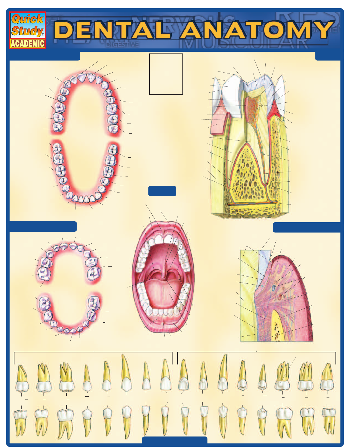 BarCharts, Inc.® WORLD’S #1 ACADEMIC OUTLINE PERMANENT TEETH MOUTH PERMANENT TEETH TOOTH DECIDUOUS ARCH MARGINAL GINGIVA ** = cut a. = artery l.l. = ligaments m. = muscle n. = nerve n.n. = nerves v. = vein 3rd molars 3rd molars 2nd molars 2nd molars 1st molars 1st molars 2nd bicuspid (premolars) 2nd bicuspid (premolars) 1st bicuspid (premolars) 1st bicuspid (premolars) Cuspids (canine) Cuspids (canine) Lateral incisors Lateral incisors Central incisors Stria of Retzius Junctional epithelium Neutrophilic granulocyte Lymphocyte Dentinal tubules Periodontal l.l. Enamel spindle Gingival sulcus Oral sulcular epithelium Oral epithelium Collagen fibers in cross section Vessels of the gingival plexus Collagen fibers in long section Marginal alveolar bone Sharpey’s fibers Labial surface Central incisor Lateral incisor Cuspid 1st molar 2nd molar 2nd molar Cingulum Dental tubercle Gum Interproximal surface Distal surface Buccal surface Gingival margin Mesial surface Lingual surface Incisal edge Cusp Tomes granular layer Acellular cementum Central incisor Facial View Lateral incisor Cuspid 1st molar Central incisor Lateral incisor Cuspid 3rd molar 2nd molar 1st molar 2nd bicuspid 1st bicuspid 3rd molar 2nd molar 1st molar 1st bicuspid (premolar) Cuspid (canine) Lateral incisor Central incisor Incisal edge Lingual surface Gingival papilla Mesial surface Gingival margin Buccal surface Contingent surface Cusp Triangular ridge Interproximal surface Distal surface Gum Cingulum Labial surface 2nd bicuspid (premolar) Enamel Crown Contact area Dentin Cusp Fissure Tuft Stria of Retzius Enamel spindle Enamel prism Pulp Pulp chamber Neck Gingiva Dentinal tubules Root Interradicular septum Mandible** Compact bone Cancellous bone Pulp horn Contour line of Owen Interdental papilla Pulpal vessels & n.n. Dentogingival fibers Circular fibers Trans-septal fibers Cementum Oblique fibers of periodontium Root canal** Pulpal sensory n. Apical foramen Apical fibers Alveolar n., a. & v.Superior labial frenulum Gingiva Palatopharyngeal arch Posterior wall of oropharynx Gingiva Inferior labial frenulum Inferior lip Palatine tonsil Uvula Palatoglossal arch Soft palate Palatine raphe Hard palate Superior lip Tongue Vestibule Lingual View Cusp of Carabelli TRIGEMINAL NERVE PRE-ERUPTION Permanent teeth: 3rd molar (wisdom tooth) (not illustrated) 17-25 yr. 2nd molar 12-13 yr. 2nd molar 2 yr. 1st molar 6-7 yr. 2nd bicuspid (premolar) 12-13 yr. 1st bicuspid (premolar) 11 yr. Cuspid (canine) 11 yr. Pons Maxillary n. (V2) Ophthalmic n. (V1) Tentorial branch Frontal n. Lacrimal n. Nasociliary n. Pterygopalatine branches Zygomatic n. Infraorbital foramen Communicating branch Zygomaticotemporal n. Zygomaticofacial n. Infraorbital n. Infraorbital foramen Anterior superior alveolar n. Middle superior alveolar n. Posterior superior alveolar n. Dental branches Gingival branches Labial branches Ciliary ganglion Long & short ciliary n.n. Trigeminal n. (V) Mandibular n. (V3) Trigeminal (semilunar) ganglion Medulla oblongata Auriculotemporal n. Anterior division Posterior deep temporal n. Lateral pterygoid n. Chorda tympani n. Buccal n. Anterior deep temporal n. Lingual n. Inferior alveolar n. Mylohyoid n. Mandibular foramen Inferior alveolar n. Inferior dental branches Inferior dental plexus Inferior gingival branches Mental foramen Mental branches Mental n. Posterior division Foramen ovale Canine (eyetooth) 16-20 mo. 1st molar 10-15 mo. Lateral incisor 8 yr. Central incisor 7 yr. Deciduous teeth: Central incisor 6-8 mo. Lateral incisor 8-10 mo. Submandibular glands Submandibular duct Salivary pool Masseter m.** Buccinator m.** Parotid duct Saliva Parotid gland Parotid gland Uvula** Palatine glands Anterior lingual glands Mylohyoid m.** Sublingual gland Tongue Parotid duct Buccinator m.** Sublingual caruncle with opening of submandibular duct Sublingual ducts Supratrochlear a. Supraorbital a. Frontal branch of superficial temporal a. Deep temporal a. Angular a. Anterior superior alveolar a. Infraorbital a. Descending palatine a. Maxillary a. Superior labial a. Dental branches Transverse facial a. Inferior labial a. Inferior alveolar a. Mentalis a. Submentalis a.Deep lingual a. Lingual a. Superior thyroid a. Facial a. Vertebral a. Mylohyoid branch Internal carotid a. External carotid a. Ascending pharyngeal a. Posterior auricular a. Occipitalis a. Posterior superior alveolar a. Middle temporal a. Parietal branch of superficial temporal a. Infraorbital a. MOUTH & SALIVARY GLANDS SKULL & ARTERIES ISBN-13: 978-142320721-4 ISBN-10: 142320721-1 U.S.$3.95 / CAN.$5.95 Images ® Vincent Perez/perezstudio.com Layout: Rich Marino NOTE TO STUDENT: Use this comprehensive QuickStudy ® study guide in the classroom, at home or anywhere you need complete information about the digestive system. This guide is not designed to take the place of classroom attendance. All rights reserved. No part of this publication may be reproduced or transmitted in any form, or by any means, electronic or mechanical, including photocopy, recording, or any information storage and retrieval system, without written permission from the publisher. ©2004 BarCharts Inc. 0308 free downloads & hundreds of titles at quickstudy.com Customer Hotline # 1.800.230.9522 Permanent Teeth Tooth Deciduous Arch Mouth Marginal Gingiva Permanent Teeth Trigeminal Nerve Pre-Eruption Mouth & Salivary Glands Skull & Arteries