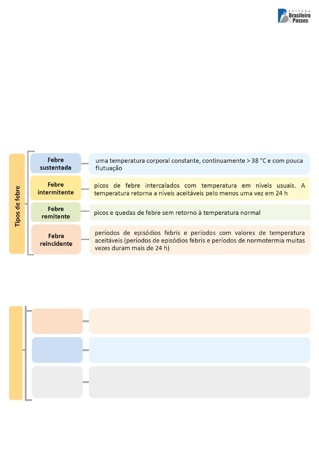 www.romulopassos.com.br MENTORIA FGV - EBSERH 1 Segunda-feira, às 20h 10º Simulado EBSERH FGV Fundamentos de Enfermagem PROFESSOR IVO SALES Vejamos, no esquema a seguir, os tipos de febre segundo Potter et al., 2018: *O conceito de febre reincidente foi detalhado para que você compreenda que esse tipo de febre também é conhecida como recidivante, recorrente ou ondulante, conforme Potter e colaboradores (2018). * Febre contínua permanece sempre acima do normal com variações de até 1 °C e sem grandes oscilações (PORTO; 2019). Outros padrões de febre Febre irregular ou séptica picos muito altos intercalados por temperaturas baixas ou períodos de apirexia. Mostram-se totalmente imprevisíveis e são bem evidenciadas quando se registra a temperatura várias vezes ao dia (PORTO; 2019). O u tr o s p ad rõ e s d e f e b re Termoplegia emergência de calor perigosa com uma alta taxa de mortalidade; decorrente de uma exposição prolongada ao sol ou a um ambiente de alta temperatura supera os mecanismos de perda de calor do corpo; definida como uma temperatura corporal de 40 °C ou mais (POTTER et al., 2018). www.romulopassos.com.br MENTORIA FGV - EBSERH 2 Febre - Hipertermia - Hipotermia Fonte: POTTER et al., 2018. Hipotermia perda de calor durante a exposição prolongada ao frio ultrapassa a capacidade do corpo para produzir calor, causando hipotermia 1. (Prefeitura de Caraguatatuba-SP/FGV/2024) A febre caracterizada por temperatura sempre acima do normal, com variações de até 1ºC, sem oscilações significativas, é denominada: a) séptica. b) remitente. c) recorrente. d) contínua. e) intermitente. 2. (ALETO/FGV/2024) Um paciente adulto, atendido em uma unidade de saúde, queixou-se, entre outras coisas, de picos de febre intercalados com períodos de temperatura normal (o retorno à normalidade aconteceu pelo menos uma vez a cada 24 horas). Nesse caso, o paciente está apresentado febre a) séptica. b) sustentada. c) intermitente. d) remitente. e) contínua. 3. (TRT-MA/FGV/2022) Um adolescente apresenta há mais ou menos 3 dias febre diária, que aparece em alguns momentos do dia, vai embora e depois volta, como um ciclo. Essas são características da febre: a) irregular. b) contínua. c) intermitente. d) remitente. e) recorrente. www.romulopassos.com.br MENTORIA FGV - EBSERH 3 4. (Câmara Municipal de Aracaju-SE/FGV/2021) Criança internada na pediatria de um hospital apresenta febre intermitente. Isso significa que: a) a temperatura permanece sempre acima do normal com variações de até 1 grau, sem grandes oscilações. b) a hipertermia é ciclicamente interrompida por um período de temperatura normal. c) há hipertermia diária com variações de mais de 1 grau, sem períodos de apirexia. d) há períodos de temperatura normal que duram dias até que sejam interrompidos por períodos de temperatura elevada. e) há picos altos, intercalados por temperatura baixa sem caráter cíclico. 5. (Prefeitura de Dom Pedrito-RS/FUNDATEC/2024) Os sinais vitais são uma maneira rápida e eficiente de controlar e monitorar as condições de um paciente ou identificar problemas e avaliar respostas à intervenção. De acordo com o controle de temperatura, assinale a alternativa correta que se refere a picos e quedas de febre sem retorno à temperatura normal. a) Febre recidivante. b) Febre intermitente. c) Febre recorrente. d) Febre contínua. e) Febre remitente. 6. (Prefeitura de Camocim de São Félix-PE/UPENET/IAUPE/2024) Em relação à evolução da febre, assinale a alternativa CORRETA que está relacionada à hipertermia diária, com variações de mais de 1ºC sem períodos de apirexia. a) Recorrente b) Intermitente c) Irregular d) Contínua e) Remitente 7. (Prefeitura de Capivari do Sul-RS/FUNDATEC/2024) Assinale a alternativa que indica o termo técnico utilizado para descrever o aumento da temperatura corporal acima do normal. a) Pirose. b) Pirexia. c) Dispepsia. d) Hipercalemia. e) Hiperecplexia. www.romulopassos.com.br MENTORIA FGV - EBSERH 4 Vejamos a definição de hipotermia conforme POTTER et al., 2018: Classificação de Hipotermia Leve 34 °C a 36 °C Moderada 30 °C a 34 °C Severa/grave/acentuadado pulso permanece regular, mas a força (amplitude) varia em decorrência da alternância de contrações ventriculares fortes e fracas. É mais bem palpado com uma leve pressão nas artérias femoral ou radial. Indica insuficiência ventricular esquerda e, geralmente, é acompanhado de uma 3ª bulha (B3) (BICKLEY; SZILAGYI, 2018). Pode aparecer também na hipertensão sistêmica grave, no infarto do miocárdio e no flutter atrial (PAULA et al., 2017). Pulso martelo d’agua/Corrig an (também conhecido como colapsante) tem uma amplitude maior do que o esperado, um aumento rápido até um pico estreito, seguido de uma queda súbita. Causas prováveis: persistência do canal arterial e insuficiência aórtica. www.romulopassos.com.br MENTORIA FGV - EBSERH 8 Pulso bigeminado ocorrência dos batimentos do pulso em grupos de dois (PAULA et al., 2017). Decorre de uma pulsação normal seguida de uma contração prematura (BARROS, 2016). A força do batimento prematura é reduzida devido ao tempo de enchimento cardíaco reduzido (JARVIS; ECKHARDT, 2020). Está associado a distúrbios do ritmo, como: contração ventricular prematura e contração atrial prematura (BARROS, 2016; JARVIS; ECKHARDT, 2020). A lt er a çõ es d o p u ls o Pulso paradoxal caracterizado pela diminuição da amplitude das pulsações durante a inspiração forçada. É mais bem determinado durante a aferição da pressão arterial, uma vez que a leitura diminui 10 mmHg durante a inspiração e aumenta com a expiração. Pode estar associado à pericardite constritiva, ao derrame pericárdico volumoso e ao enfisema pulmonar. Também está presente no broncospasmo grave e na asma aguda (JARVIS; ECKHARDT, 2020; PORTO, 2019). Observações importantes Avalie os pulsos radiais em ambos os lados do sistem