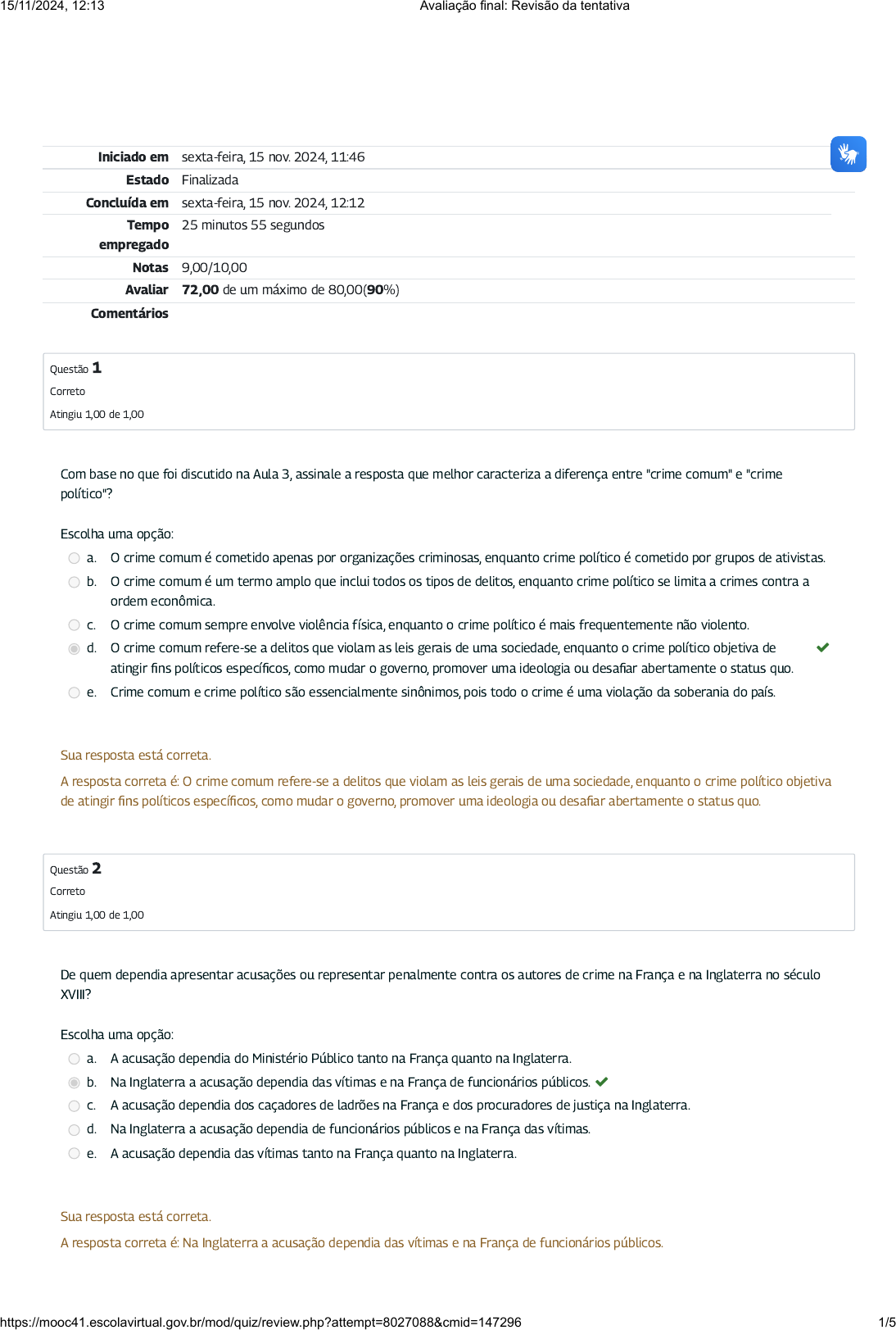 Iniciado em sexta-feira, 15 nov. 2024, 11:46 Estado Finalizada Concluída em sexta-feira, 15 nov. 2024, 12:12 Tempo empregado 25 minutos 55 segundos Notas 9,00/10,00 Avaliar 72,00 de um máximo de 80,00(90%) Comentários Questão 1 Correto Atingiu 1,00 de 1,00 Questão 2 Correto Atingiu 1,00 de 1,00 Com base no que foi discutido na Aula 3, assinale a resposta que melhor caracteriza a diferença entre "crime comum" e "crime político"? Escolha uma opção: a. O crime comum é cometido apenas por organizações criminosas, enquanto crime político é cometido por grupos de ativistas. b. O crime comum é um termo amplo que inclui todos os tipos de delitos, enquanto crime político se limita a crimes contra a ordem econômica. c. O crime comum sempre envolve violência física, enquanto o crime político é mais frequentemente não violento. d. O crime comum refere-se a delitos que violam as leis gerais de uma sociedade, enquanto o crime político objetiva de atingir �ns políticos especí�cos, como mudar o governo, promover uma ideologia ou desa�ar abertamente o status quo. e. Crime comum e crime político são essencialmente sinônimos, pois todo o crime é uma violação da soberania do país. Sua resposta está correta. A resposta correta é: O crime comum refere-se a delitos que violam as leis gerais de uma sociedade, enquanto o crime político objetiva de atingir �ns políticos especí�cos, como mudar o governo, promover uma ideologia ou desa�ar abertamente o status quo. De quem dependia apresentar acusações ou representar penalmente contra os autores de crime na França e na Inglaterra no século XVIII? Escolha uma opção: a. A acusação dependia do Ministério Público tanto na França quanto na Inglaterra. b. Na Inglaterra a acusação dependia das vítimas e na França de funcionários públicos. c. A acusação dependia dos caçadores de ladrões na França e dos procuradores de justiça na Inglaterra. d. Na Inglaterra a acusação dependia de funcionários públicos e na França das vítimas. e. A acusação dependia das vítimas tanto na França quanto na Inglaterra. Sua resposta está correta. A resposta correta é: Na Inglaterra a acusação dependia das vítimas e na França de funcionários públicos. 15/11/2024, 12:13 Avaliação final: Revisão da tentativa https://mooc41.escolavirtual.gov.br/mod/quiz/review.php?attempt=8027088&cmid=147296 1/5 Questão 3 Correto Atingiu 1,00 de 1,00 Questão 4 Correto Atingiu 1,00 de 1,00 A ideia de accountability está diretamente associada às boas práticas de governança democrática no setor público. Com base no que foi discutido na Aula 1, assinale a resposta INCORRETA em relação às pré-condições para que uma organização possa ser transparente e responsabilizável. Escolha uma opção: a. A redução da supervisão e o estímulo à produção de relatórios para a melhora geral do serviço e da e�cácia da instituição. b. A adoção de uma política de dados transparente e práticas de prestação de contas regulares à sociedade. c. O desenvolvimento de padrões pro�ssionais abrangentes (códigos de conduta), fornecendo orientações claras sobre o exercício prático dos deveres e poderes dos agentes. d. A manutenção de padrões de registro, sistematização e difusão das informações produzidas pelo seu funcionamento (relatórios, boletins, �chas), de modo que estas formem conjuntos de dados processáveis e publicáveis. e. A promoção de uma cultura organizacional em que os funcionários públicos – eleitos e não-eleitos – incorporem o dever de explicação de suas decisões e ações aos cidadãos. Sua resposta está correta. A resposta correta é: A redução da supervisão e o estímulo à produção de relatórios para a melhora geral do serviço e da e�cácia da instituição. A criação da Polícia Metropolitana de Londres...: Escolha uma opção: a. Não teve qualquer impacto sobre os caçadores de ladrões. b. Diminuiu drasticamente o papel dos caçadores de ladrões. c. Foi realizada de forma que os caçadores de ladrões passaram a depender da polícia. d. Estimulou a expansão dos caçadores de ladrões. e. Foi uma demanda dos caçadores de ladrões. Sua resposta está correta. A resposta correta é: Diminuiu drasticamente o papel dos caçadores de ladrões. 15/11/2024, 12:13 Avaliação final: Revisão da tentativa https://mooc41.escolavirtual.gov.br/mod/quiz/review.php?attempt=8027088&cmid=147296 2/5 Questão 5 Correto Atingiu 1,00 de 1,00 Questão 6 Correto Atingiu 1,00 de 1,00 Por que as Revoluções Inglesa e Francesa são chamadas de Revoluções Burguesas? Escolha uma opção: a. Porque os “burgos” eram os locais onde se reuniam os revolucionários. b. Porque tiveram como principal motivação o atendimento aos anseios dessa classe social, que reivindicava maior participação no poder. c. Porque a burguesia inglesa e francesa se uniu para expandir seu poderio econômico. d. Porque representaram a passagem de costumes menos re�nados para hábitos menos violentos e, assim chamados, burgueses. e. Porque tais revolução se impôs sobre a população mais pobre desses países. Sua resposta está correta. A resposta correta é: Porque tiveram como principal motivação o atendimento aos anseios dessa classe social, que reivindicava maior participação no poder. A corrupção é um dos desdobramentos do patrimonialismo. Assinale a alternativa que melhor explica essa a�rmação. Escolha uma opção: a. O patrimonialismo e a corrupção nacionais derivam de uma mesma concepção, a de que o poder emana do povo. b. O patrimonialismo decorre da corrupção pois permite que os grupos envolvidos nessas práticas consigam se apropriar crescentemente do patrimônio público. c. Pela leitura de Raymundo Faoro, em “Os Donos do Poder”, o patrimonialismo explica o autoritarismo socialmente implantado no Brasil. d. A corrupção é um dos desdobramentos do patrimonialismo